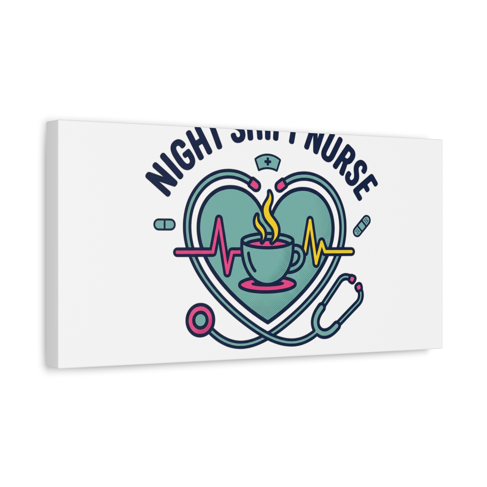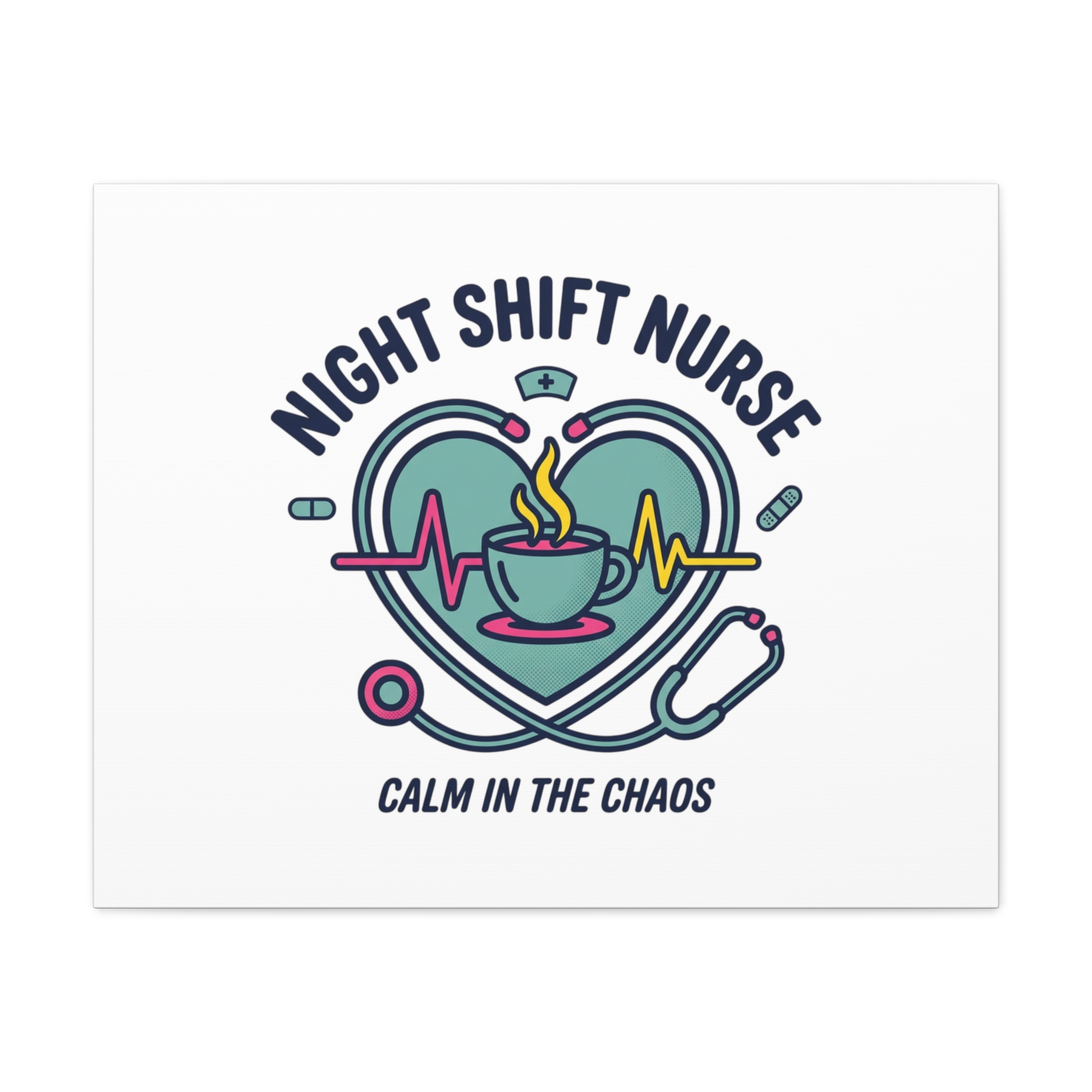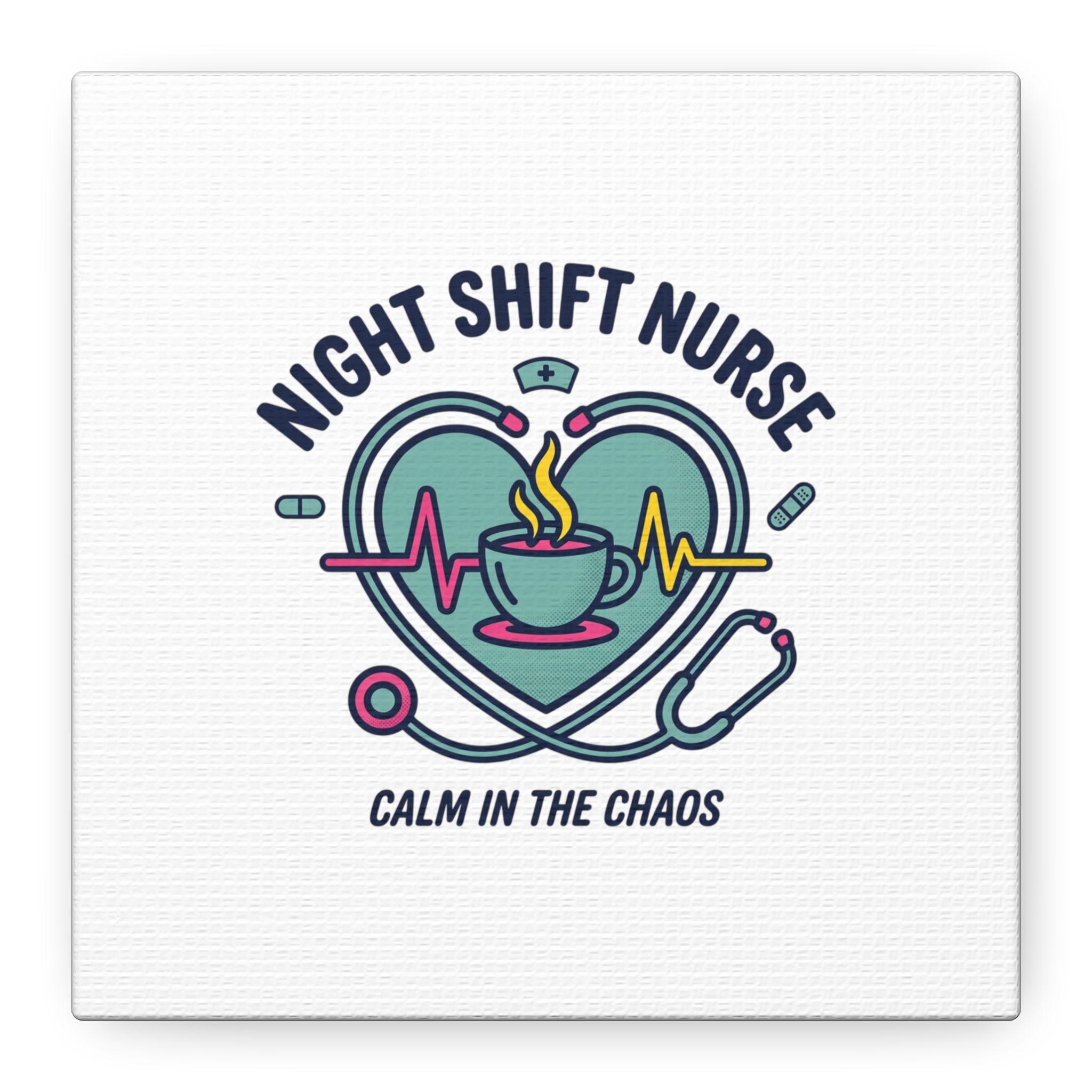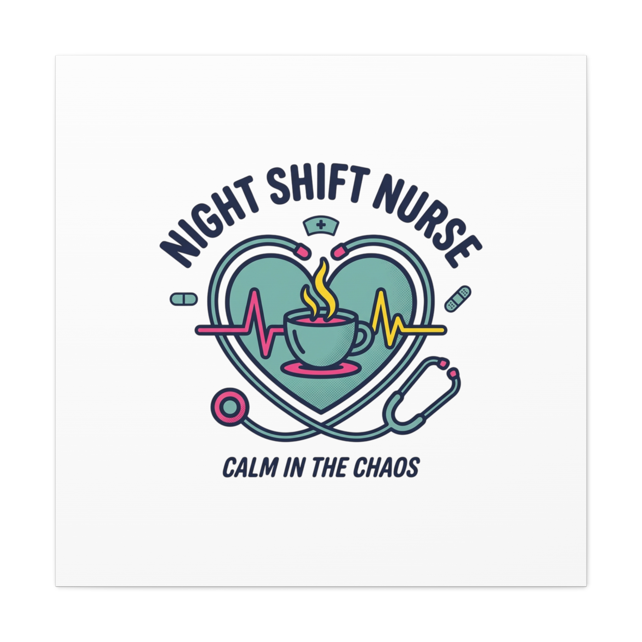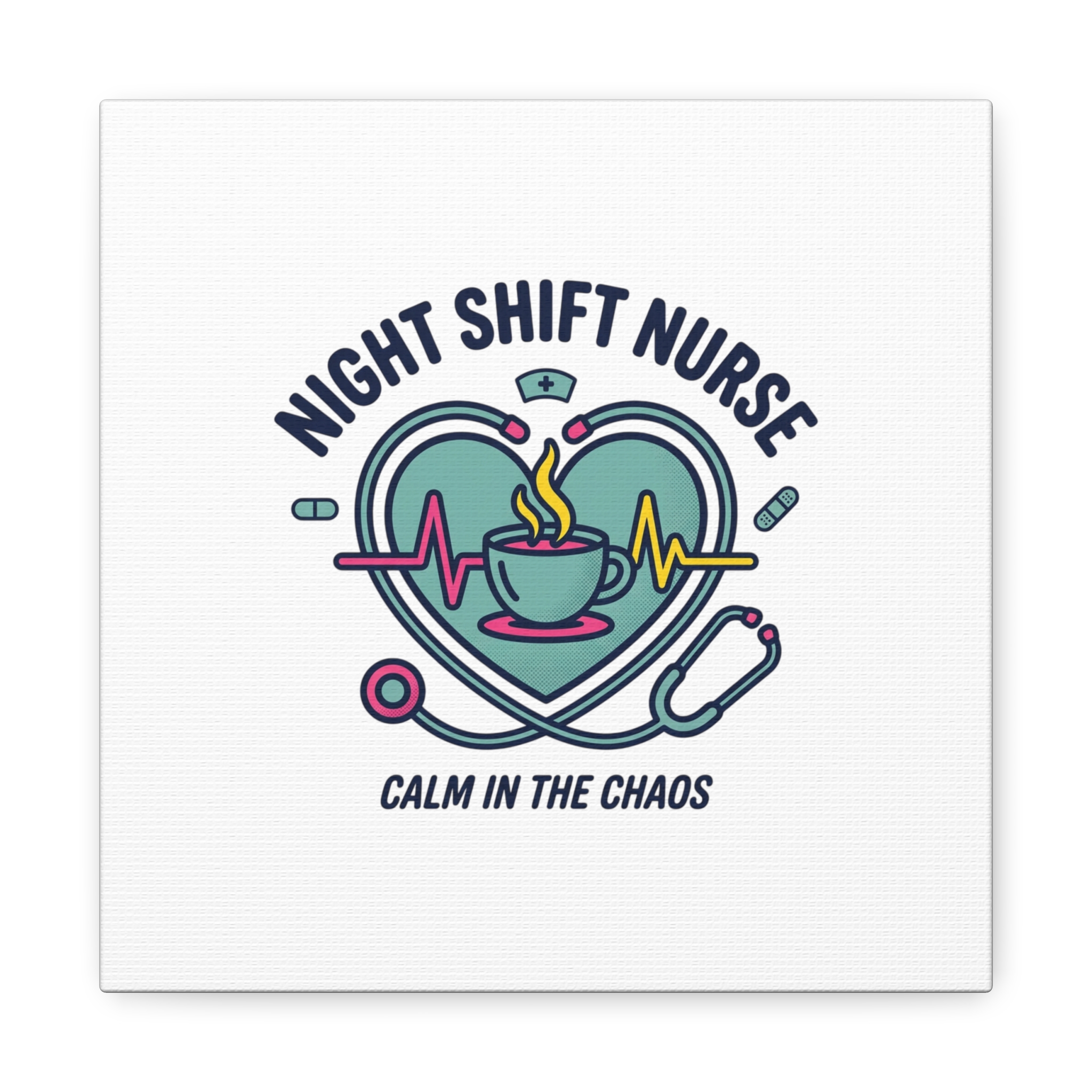 Night shift nurse canvas art blending warm nurse pride with a calm, coffee-fueled motif. The design features a stethoscope forming a heart, an ECG line, a steaming coffee cup, and small pill accents in a soft, friendly palette—matching the ‘Nurse Aesthetic’ vocabulary of resilience, community, and coffee humor. Its approachable typography and soothing colors suit hospital break rooms, nursing stations, or home offices as an understated nod to late-night clinical work and camaraderie.