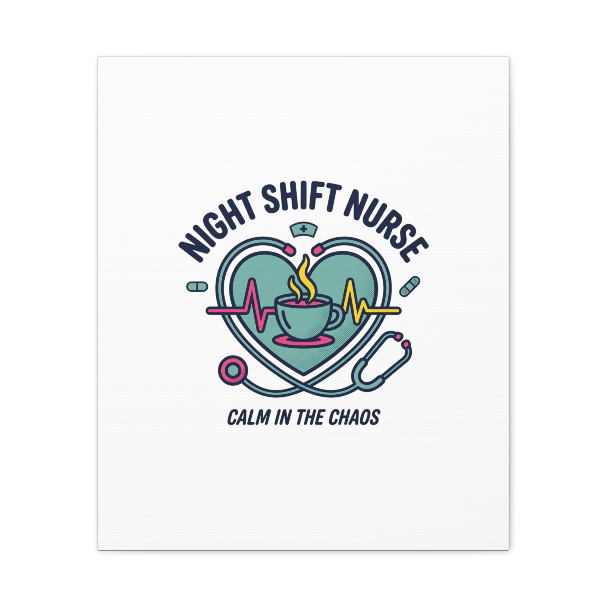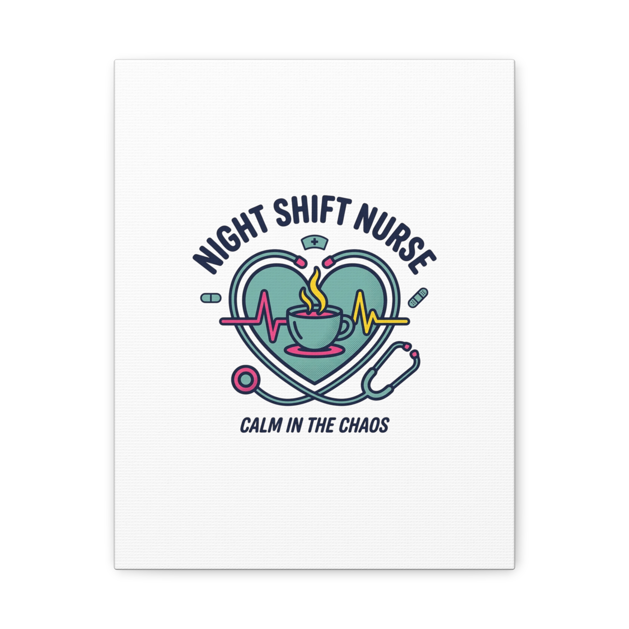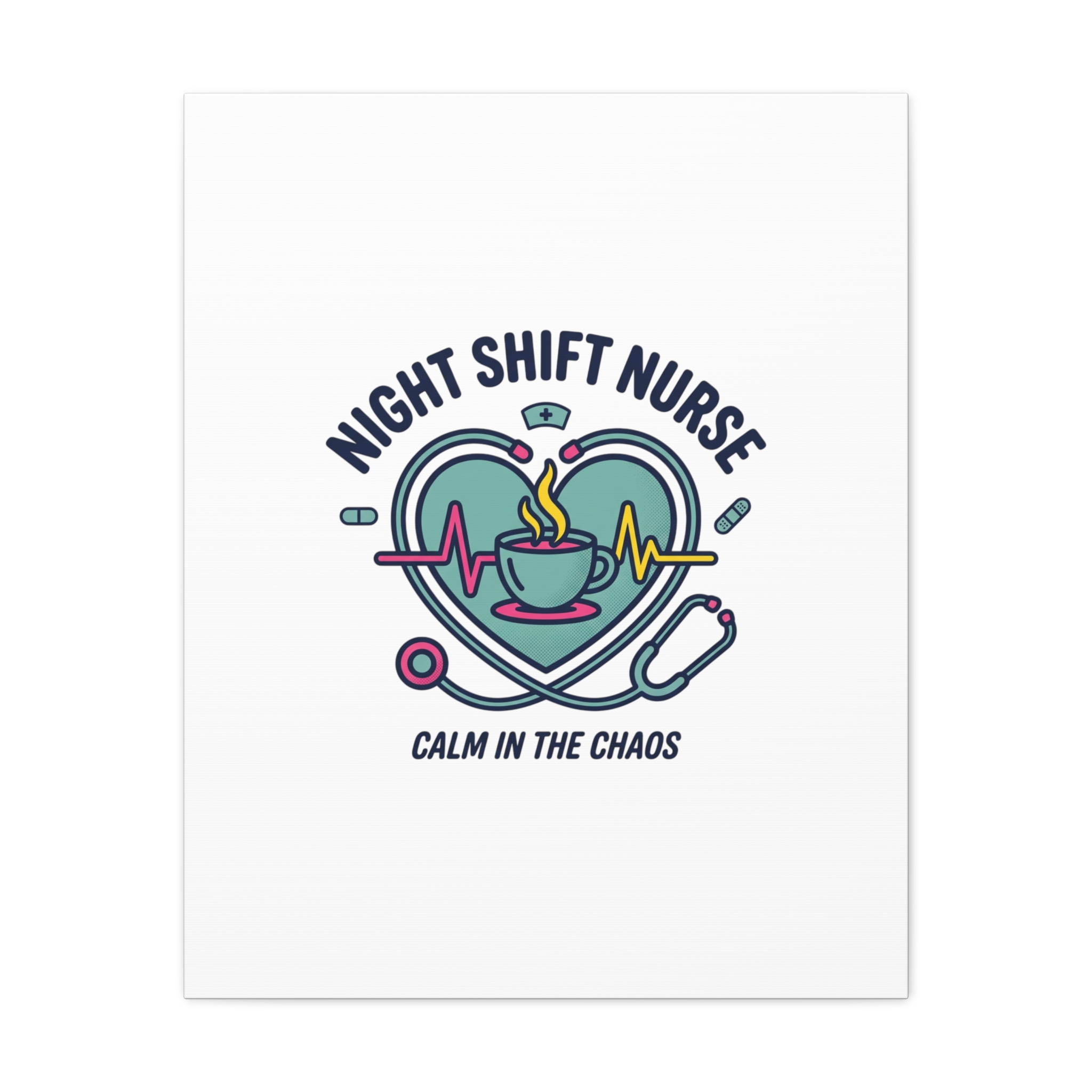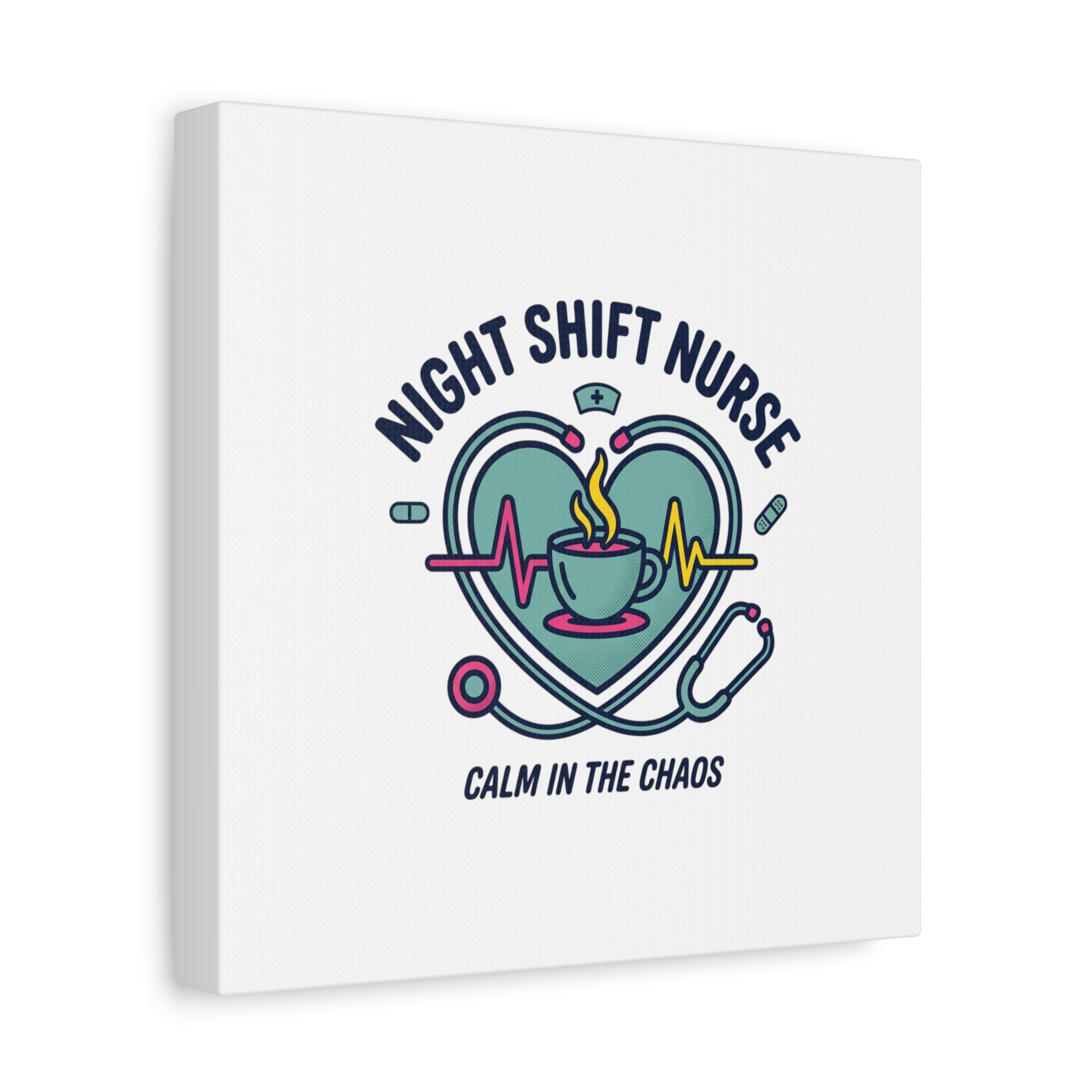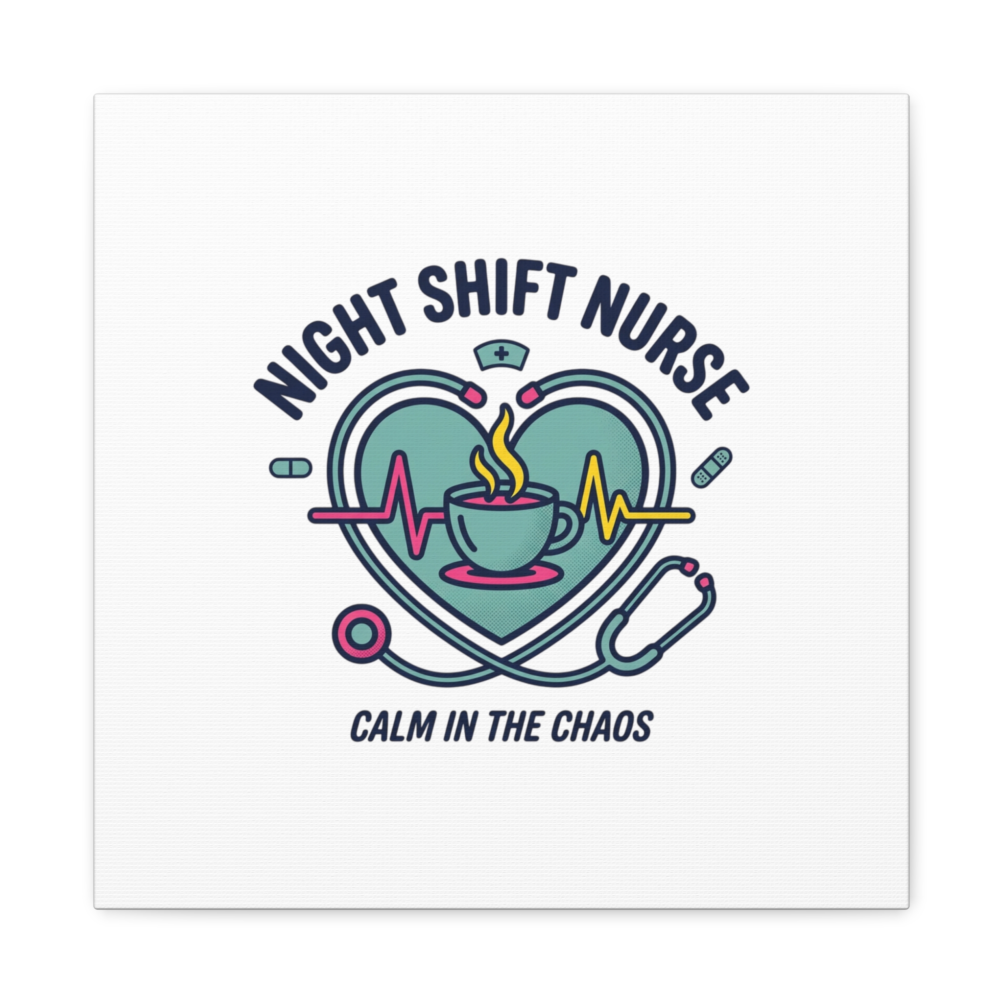 Night shift nurse canvas art blending warm nurse pride with a calm, coffee-fueled motif. The design features a stethoscope forming a heart, an ECG line, a steaming coffee cup, and small pill accents in a soft, friendly palette—matching the ‘Nurse Aesthetic’ vocabulary of resilience, community, and coffee humor. Its approachable typography and soothing colors suit hospital break rooms, nursing stations, or home offices as an understated nod to late-night clinical work and camaraderie.