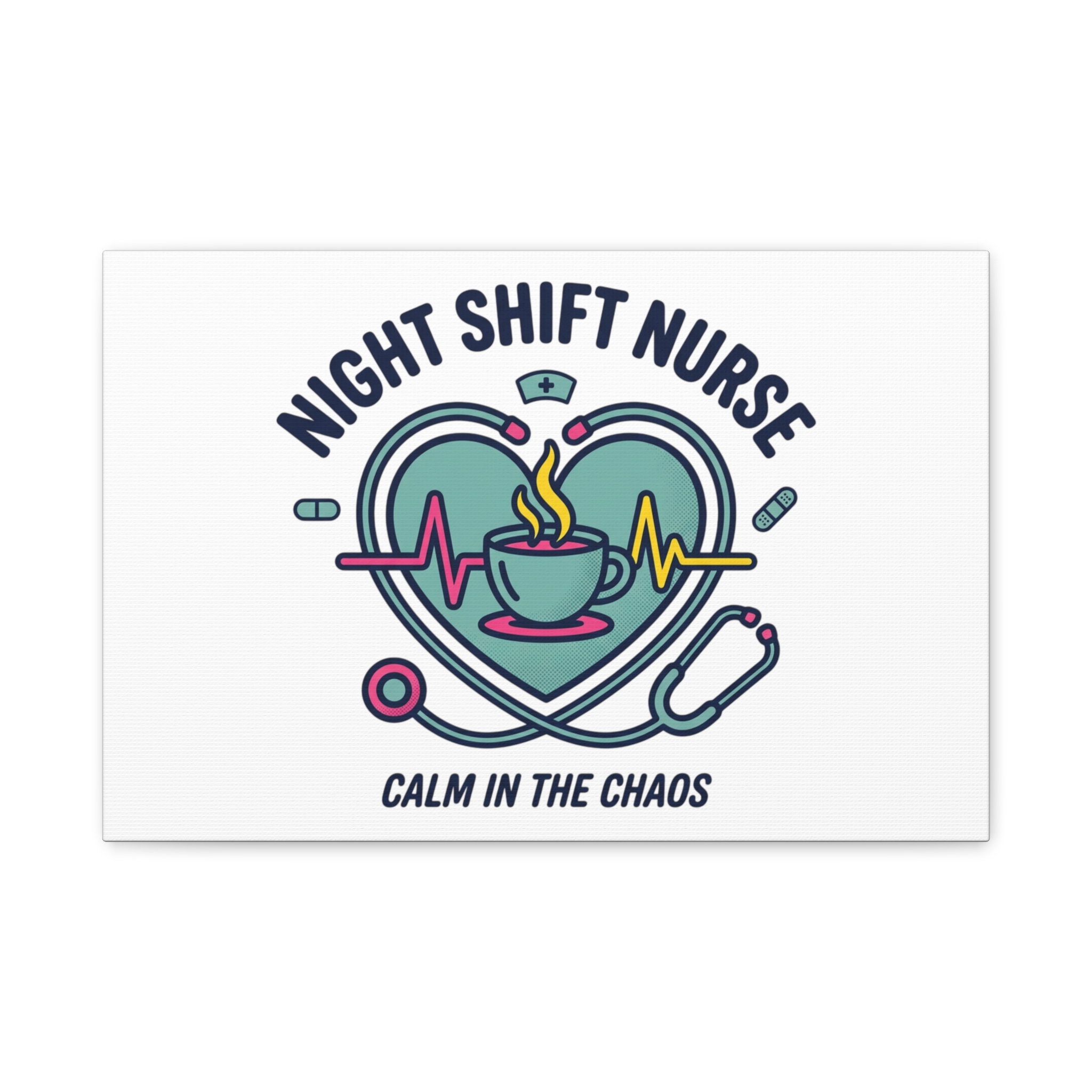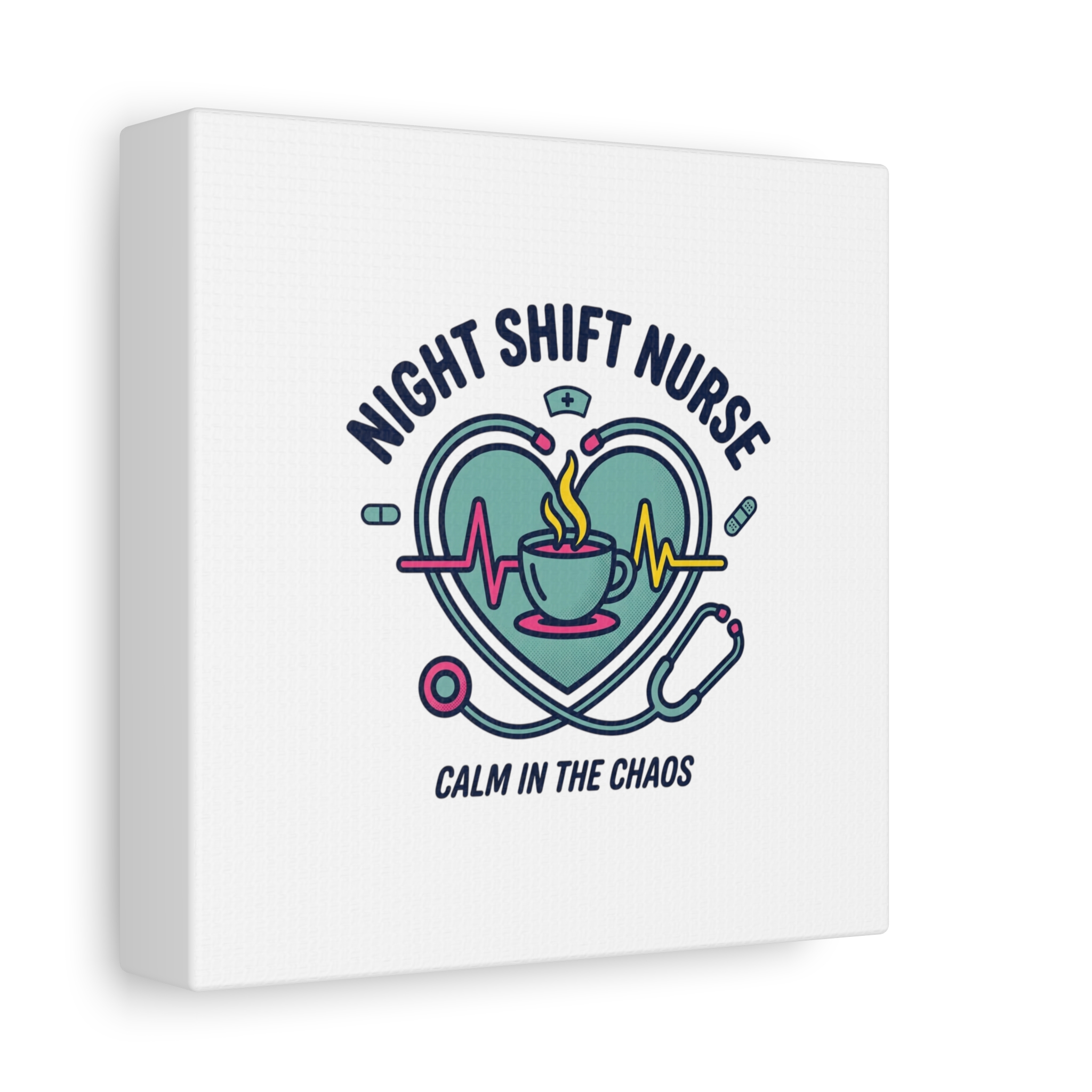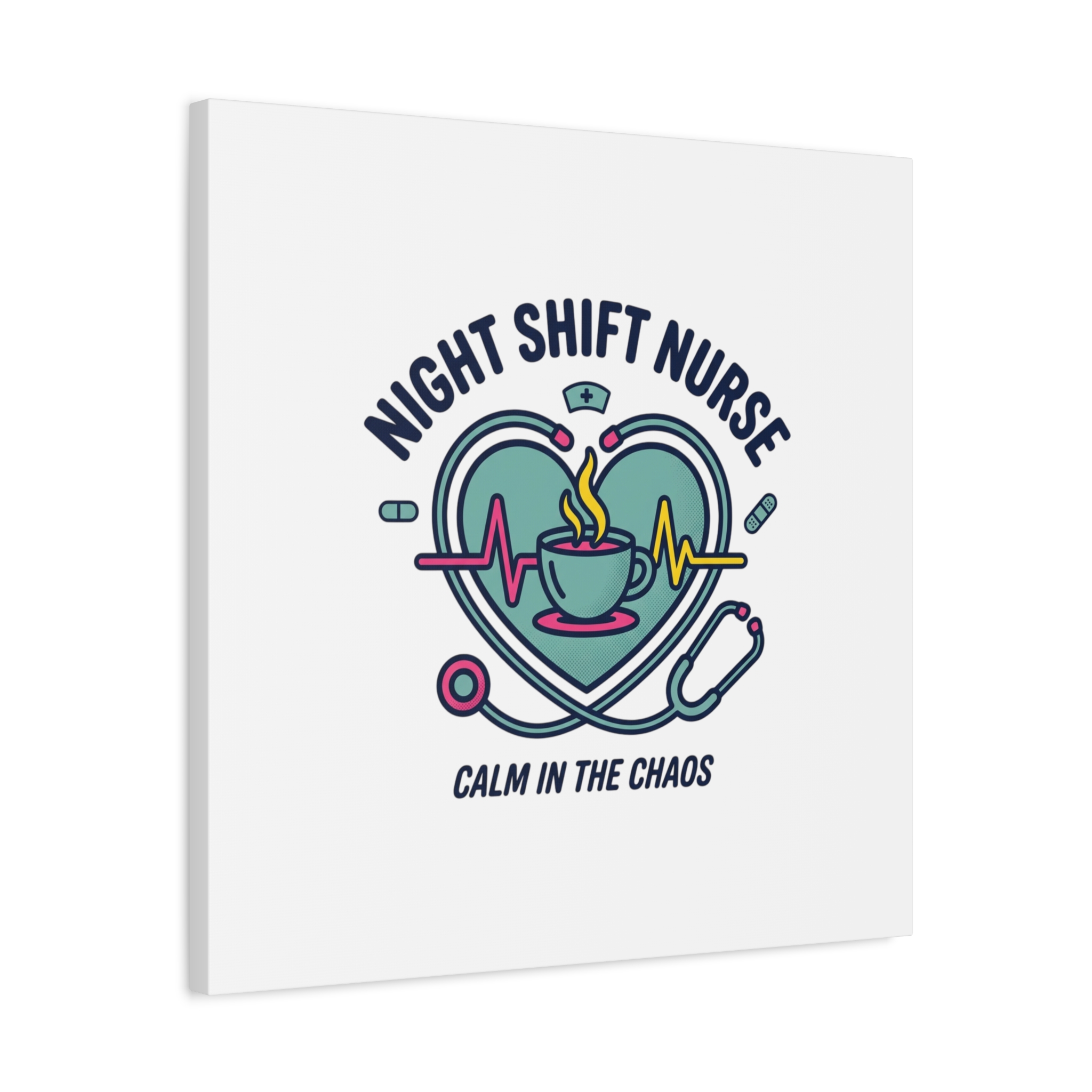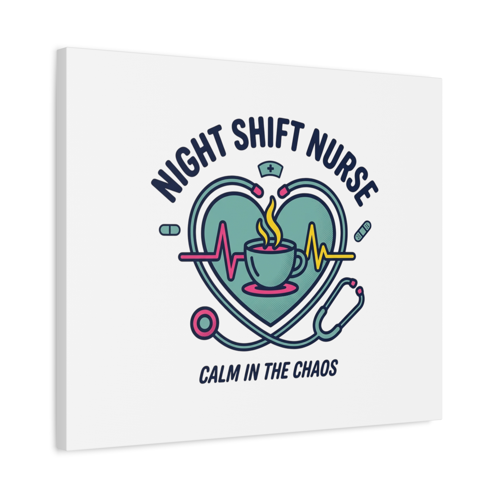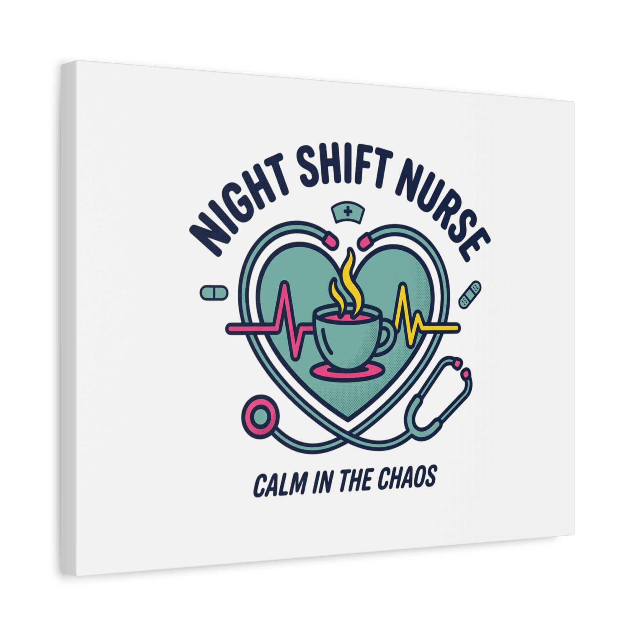 Night shift nurse canvas art blending warm nurse pride with a calm, coffee-fueled motif. The design features a stethoscope forming a heart, an ECG line, a steaming coffee cup, and small pill accents in a soft, friendly palette—matching the ‘Nurse Aesthetic’ vocabulary of resilience, community, and coffee humor. Its approachable typography and soothing colors suit hospital break rooms, nursing stations, or home offices as an understated nod to late-night clinical work and camaraderie.