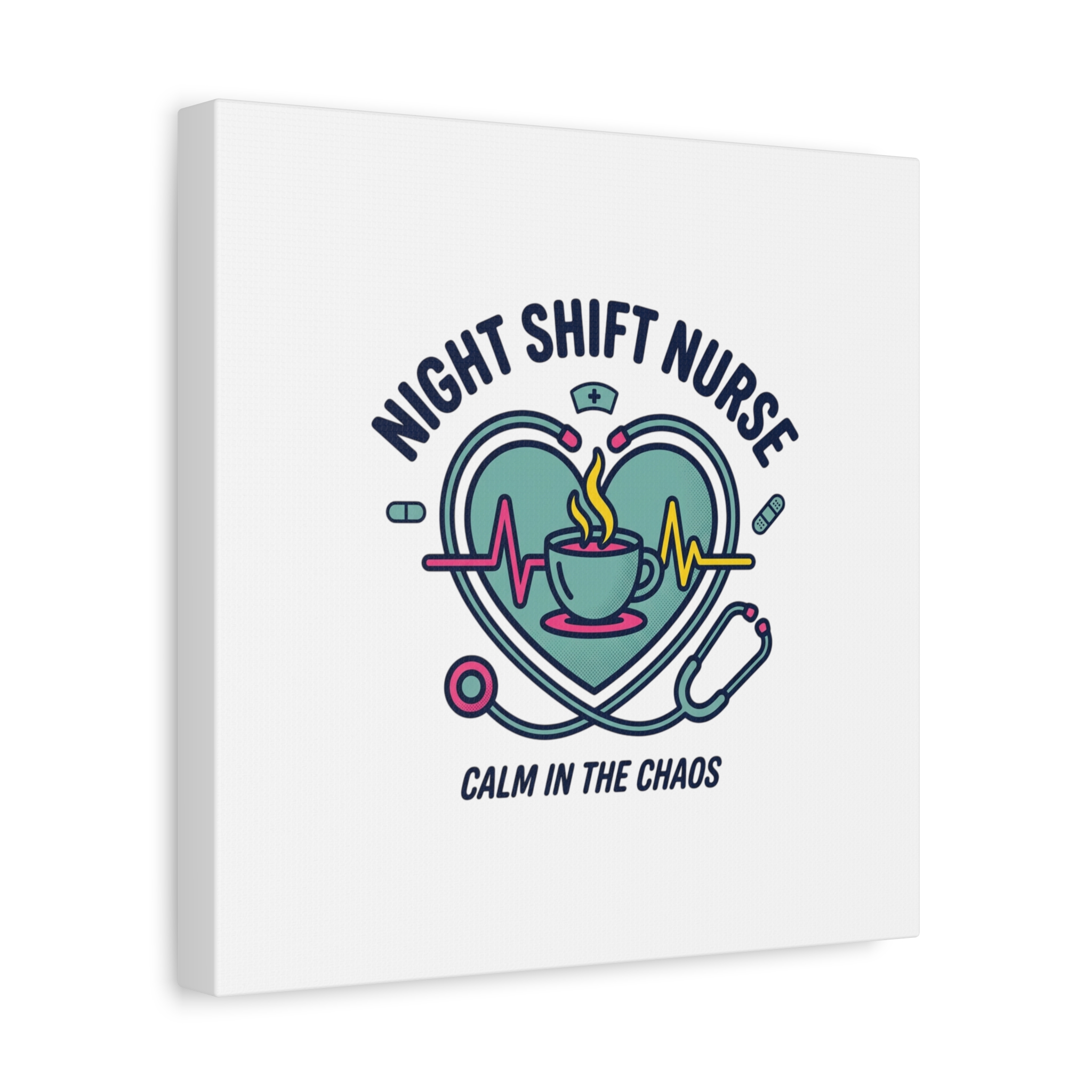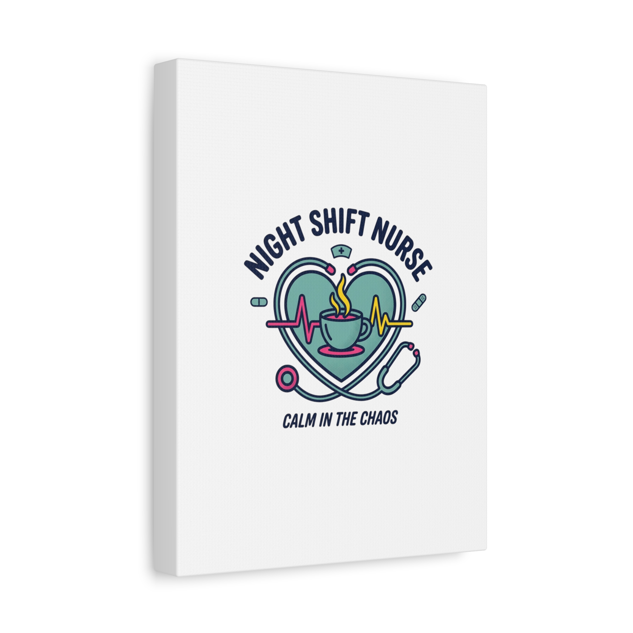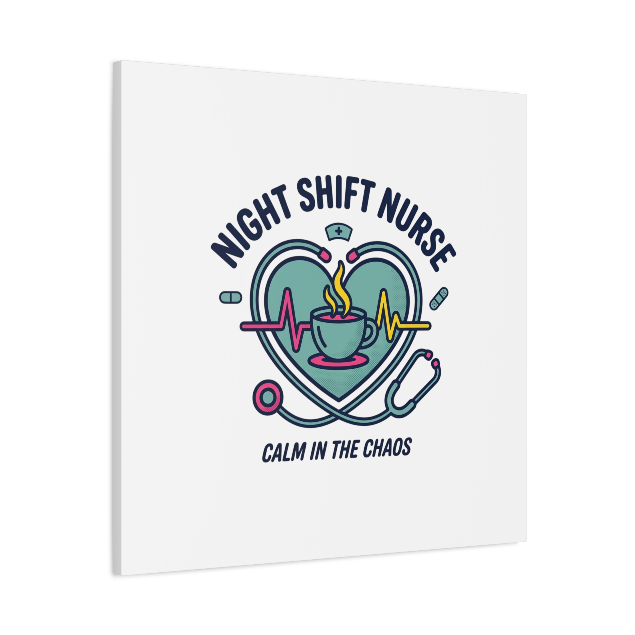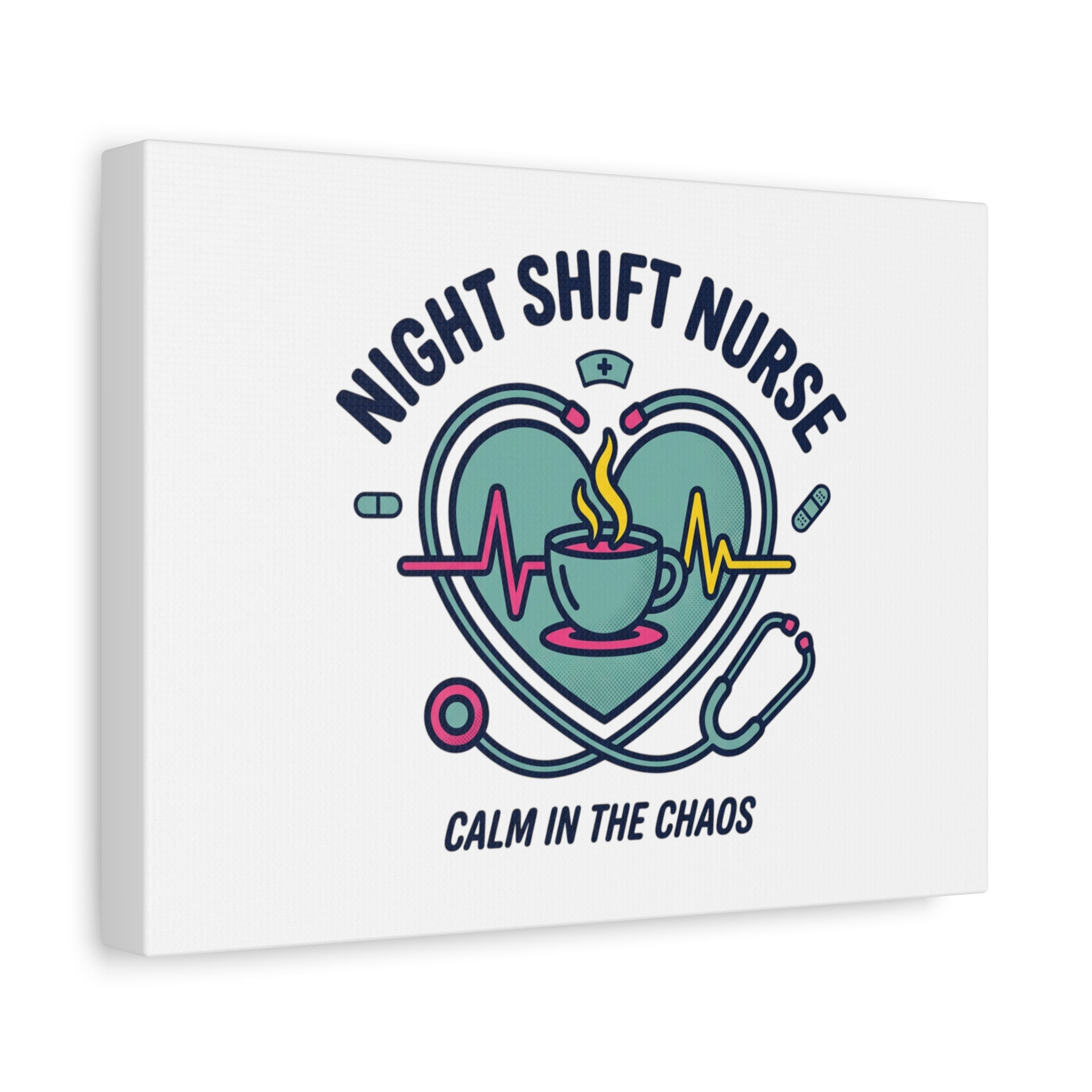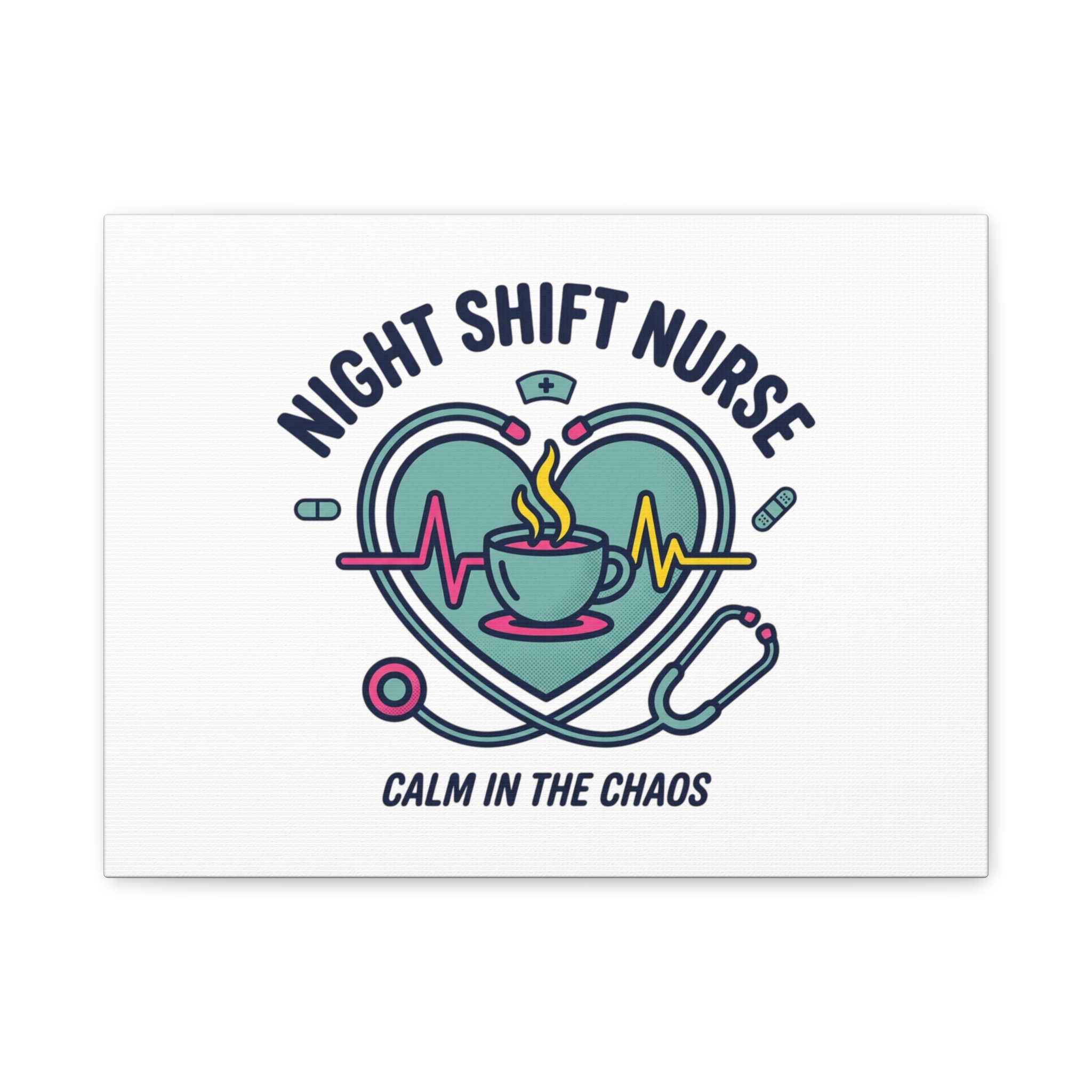 Night shift nurse canvas art blending warm nurse pride with a calm, coffee-fueled motif. The design features a stethoscope forming a heart, an ECG line, a steaming coffee cup, and small pill accents in a soft, friendly palette—matching the ‘Nurse Aesthetic’ vocabulary of resilience, community, and coffee humor. Its approachable typography and soothing colors suit hospital break rooms, nursing stations, or home offices as an understated nod to late-night clinical work and camaraderie.