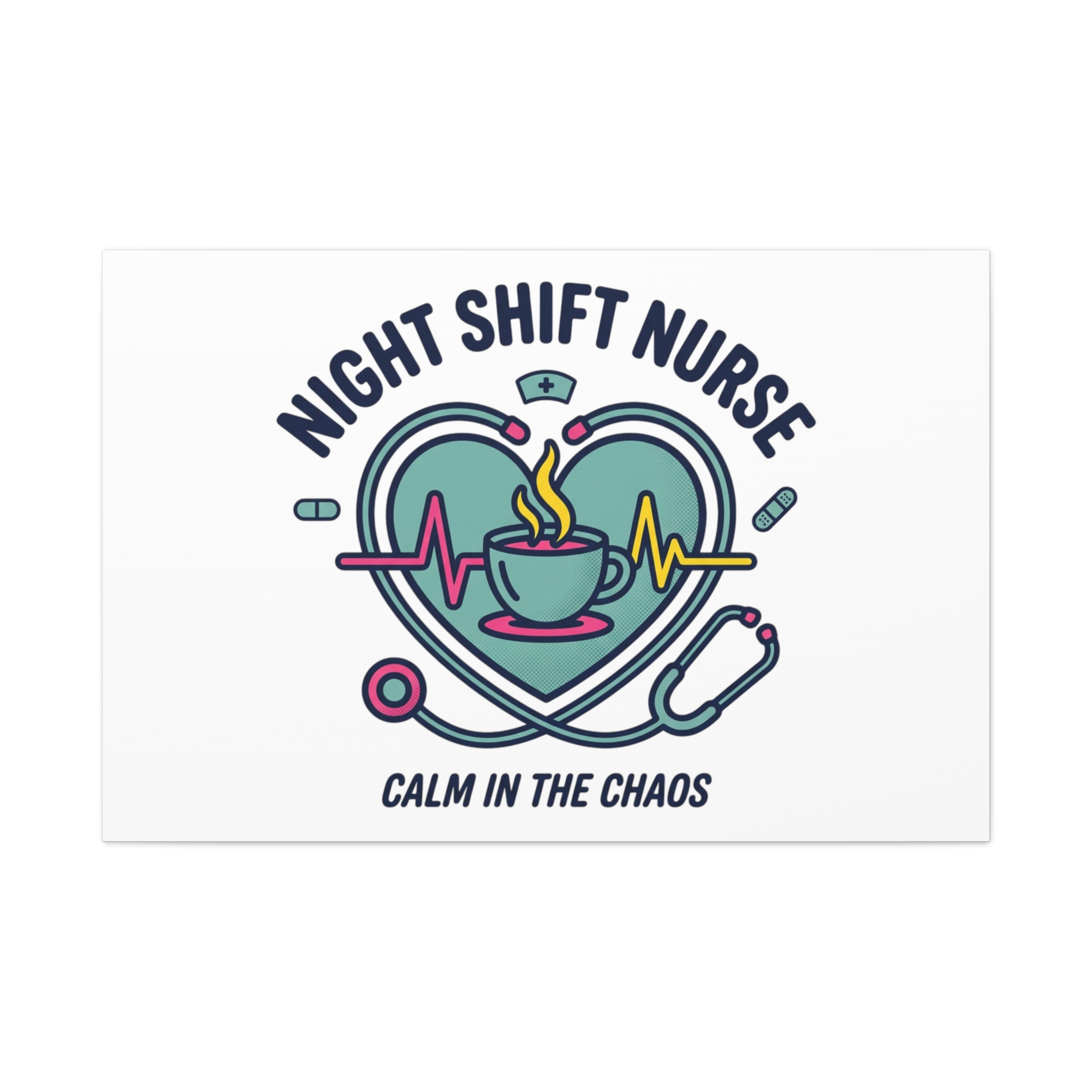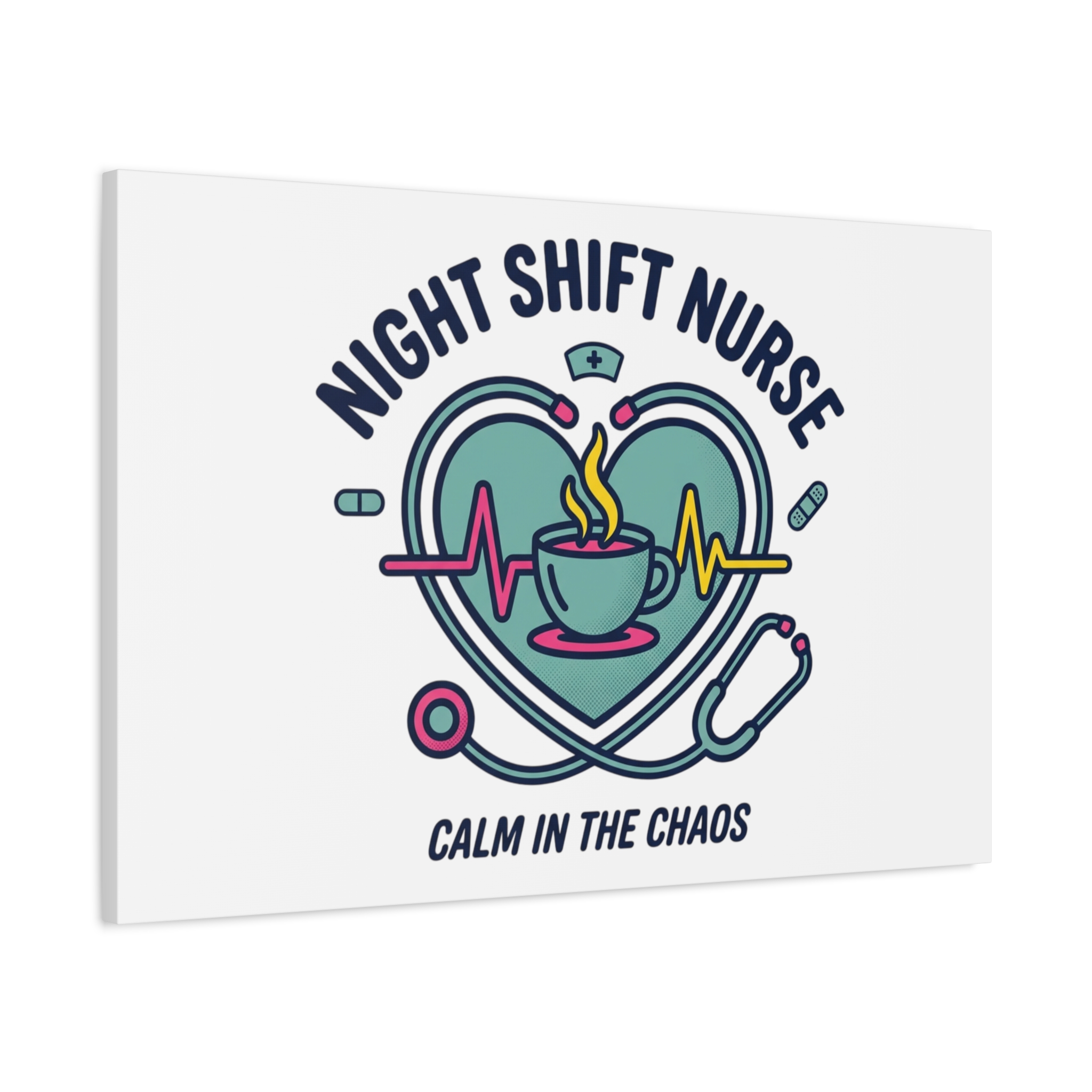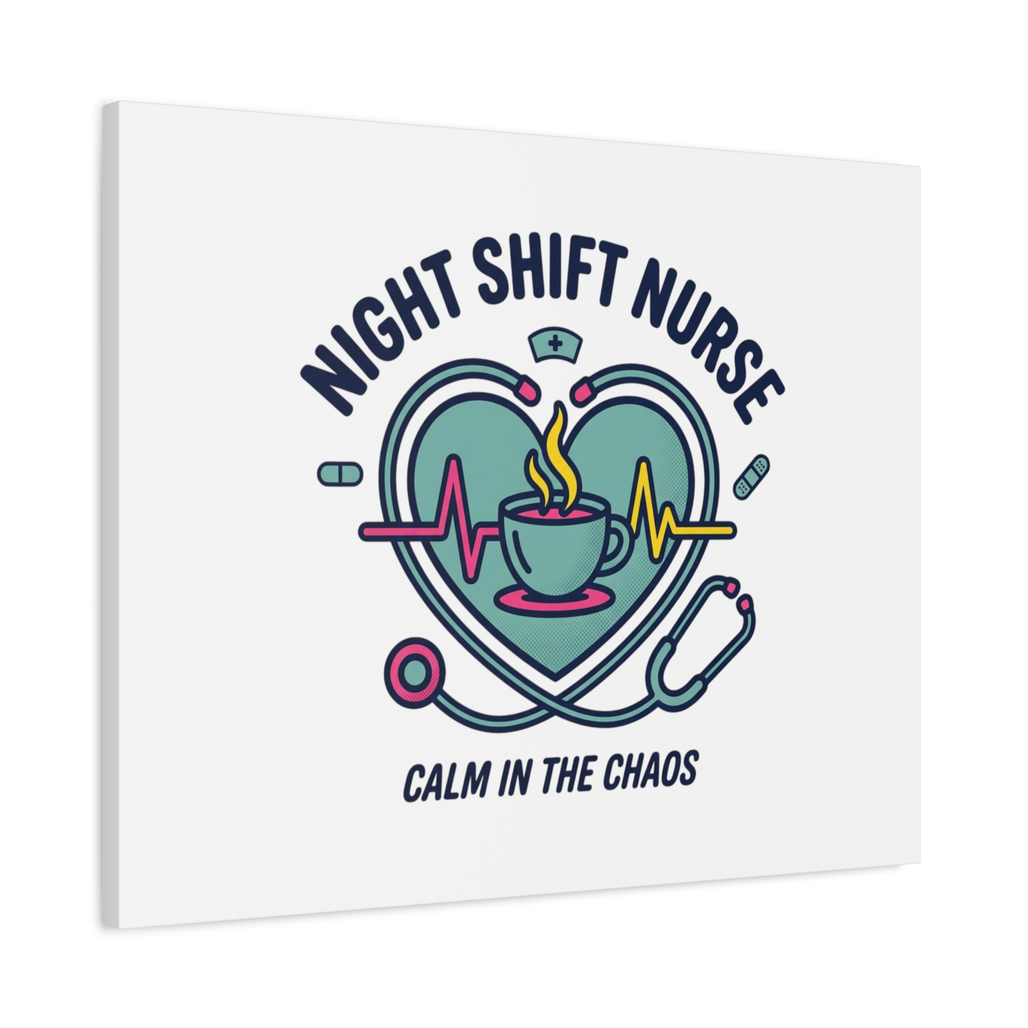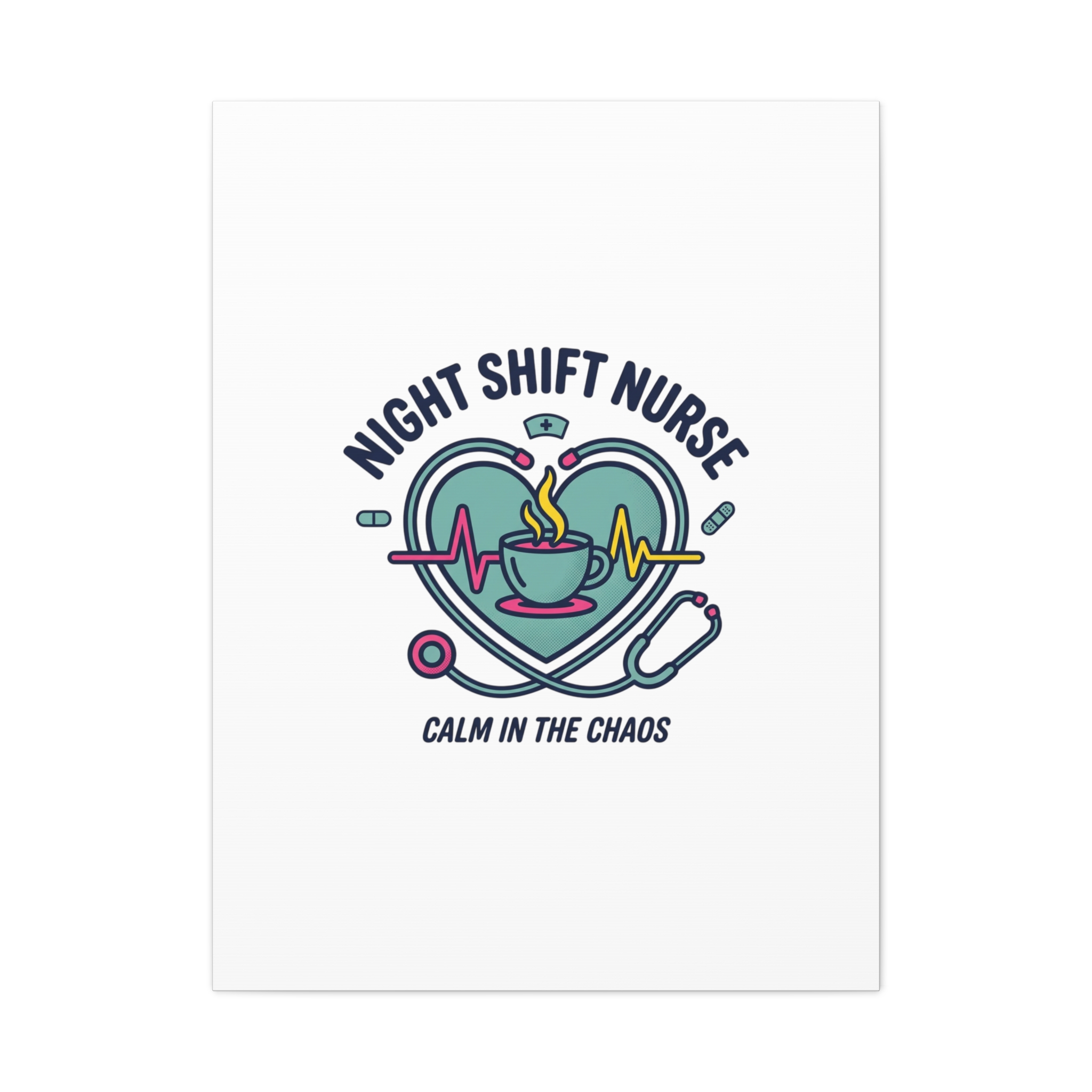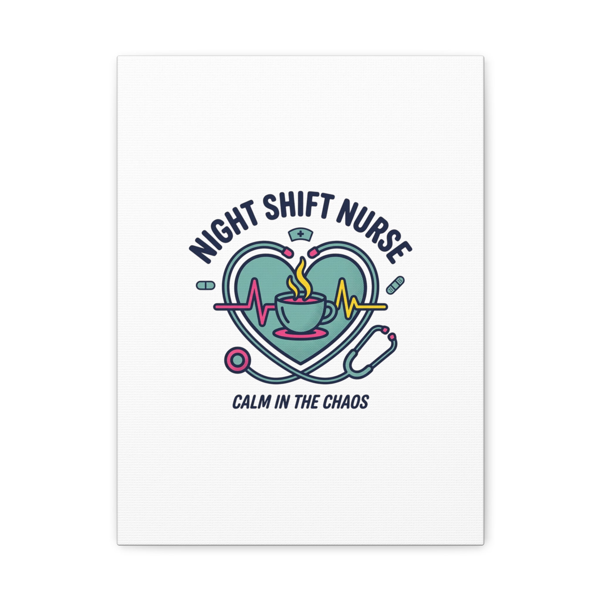 Night shift nurse canvas art blending warm nurse pride with a calm, coffee-fueled motif. The design features a stethoscope forming a heart, an ECG line, a steaming coffee cup, and small pill accents in a soft, friendly palette—matching the ‘Nurse Aesthetic’ vocabulary of resilience, community, and coffee humor. Its approachable typography and soothing colors suit hospital break rooms, nursing stations, or home offices as an understated nod to late-night clinical work and camaraderie.