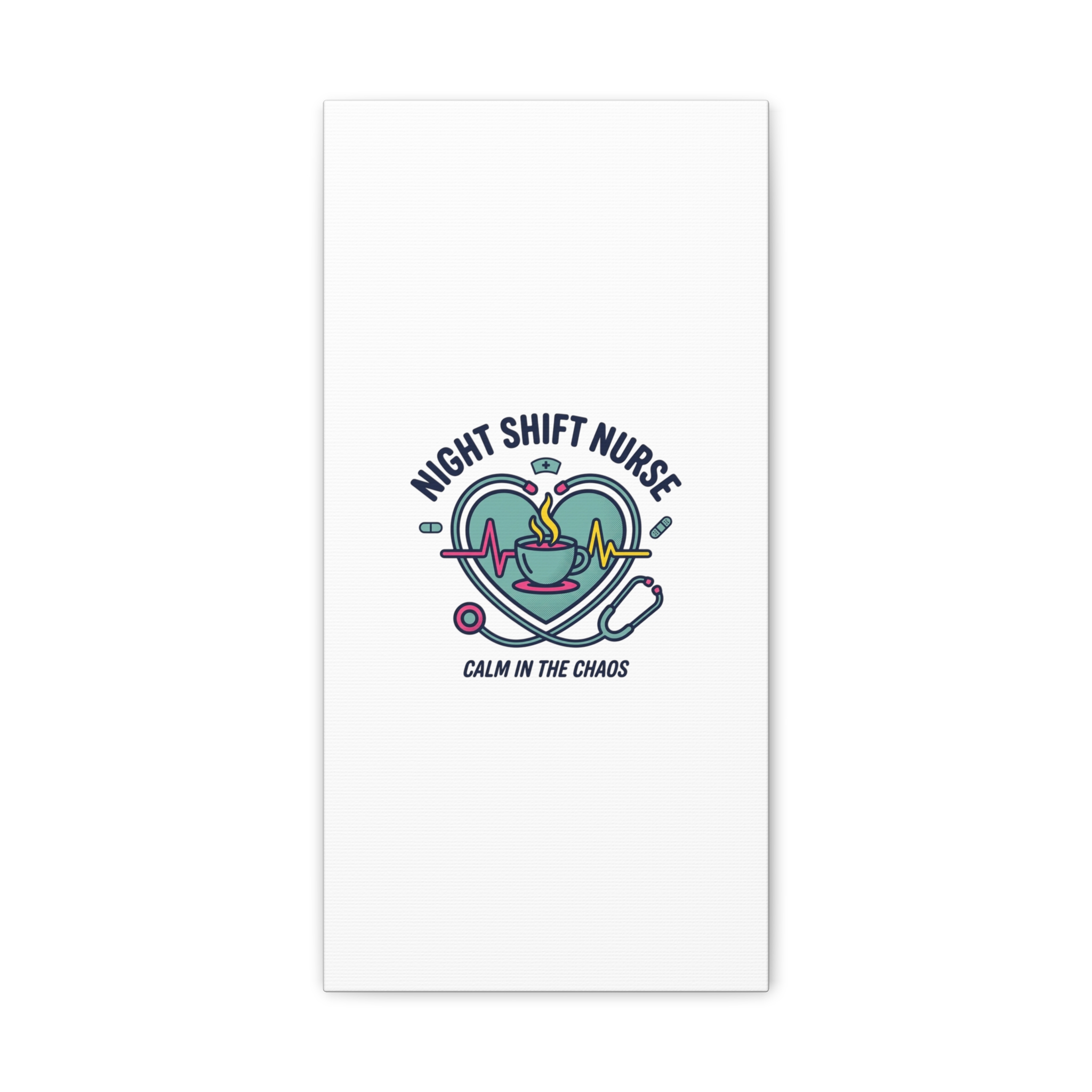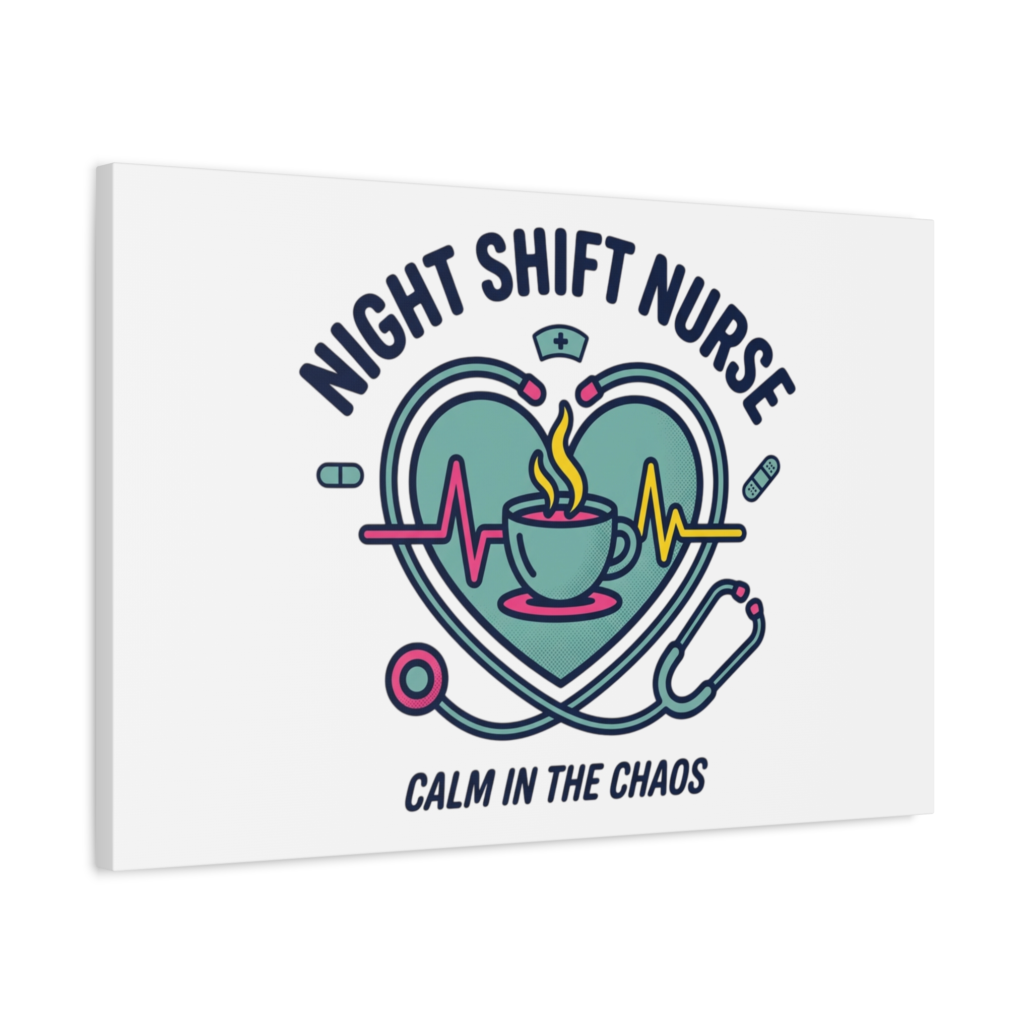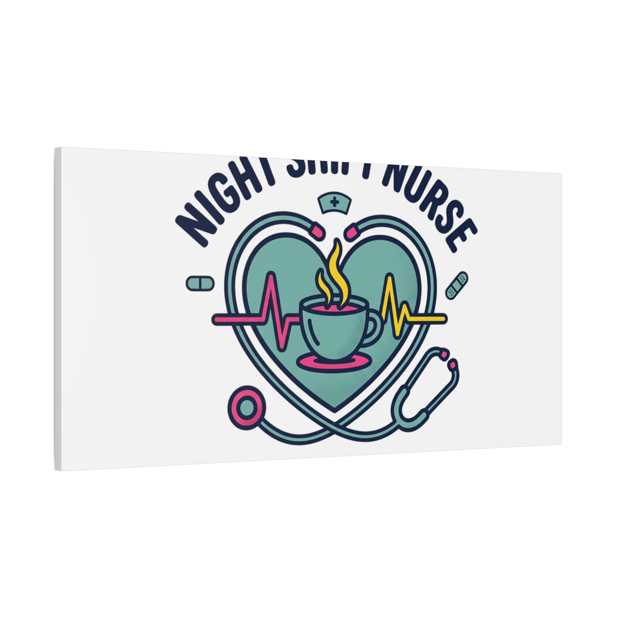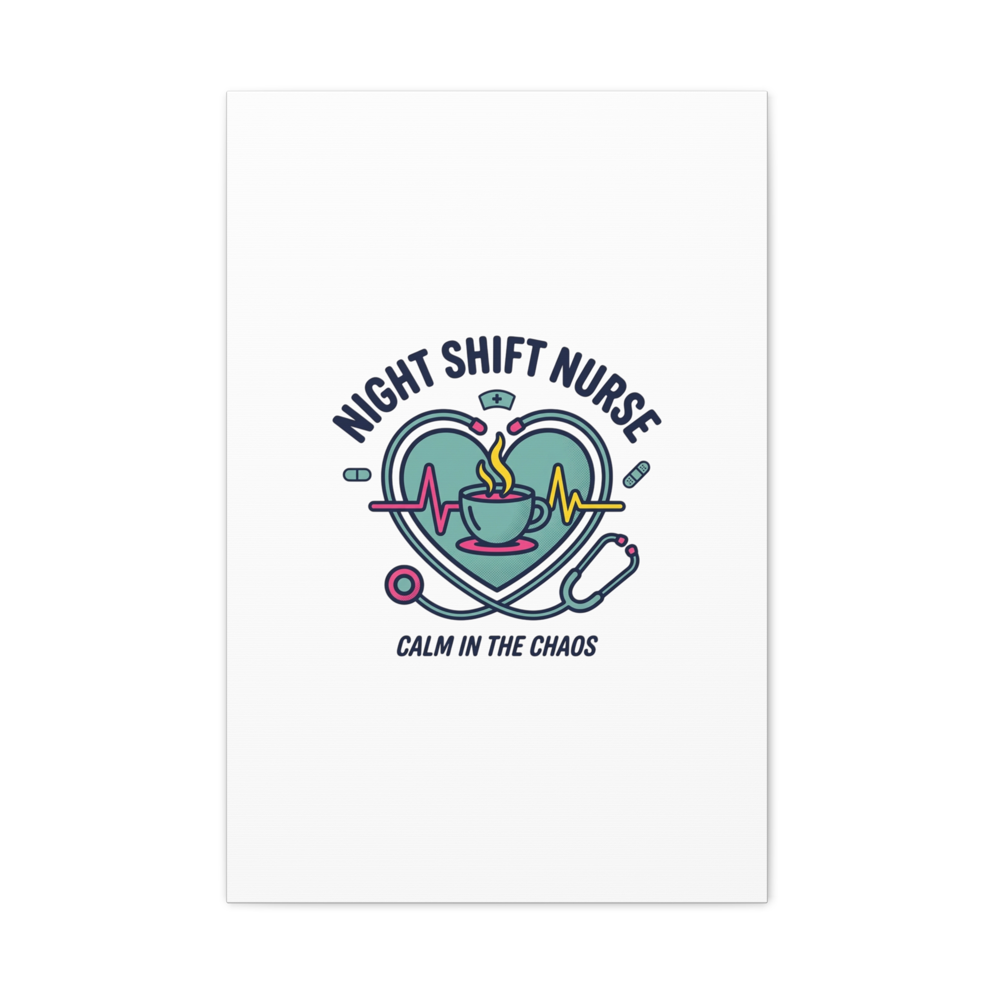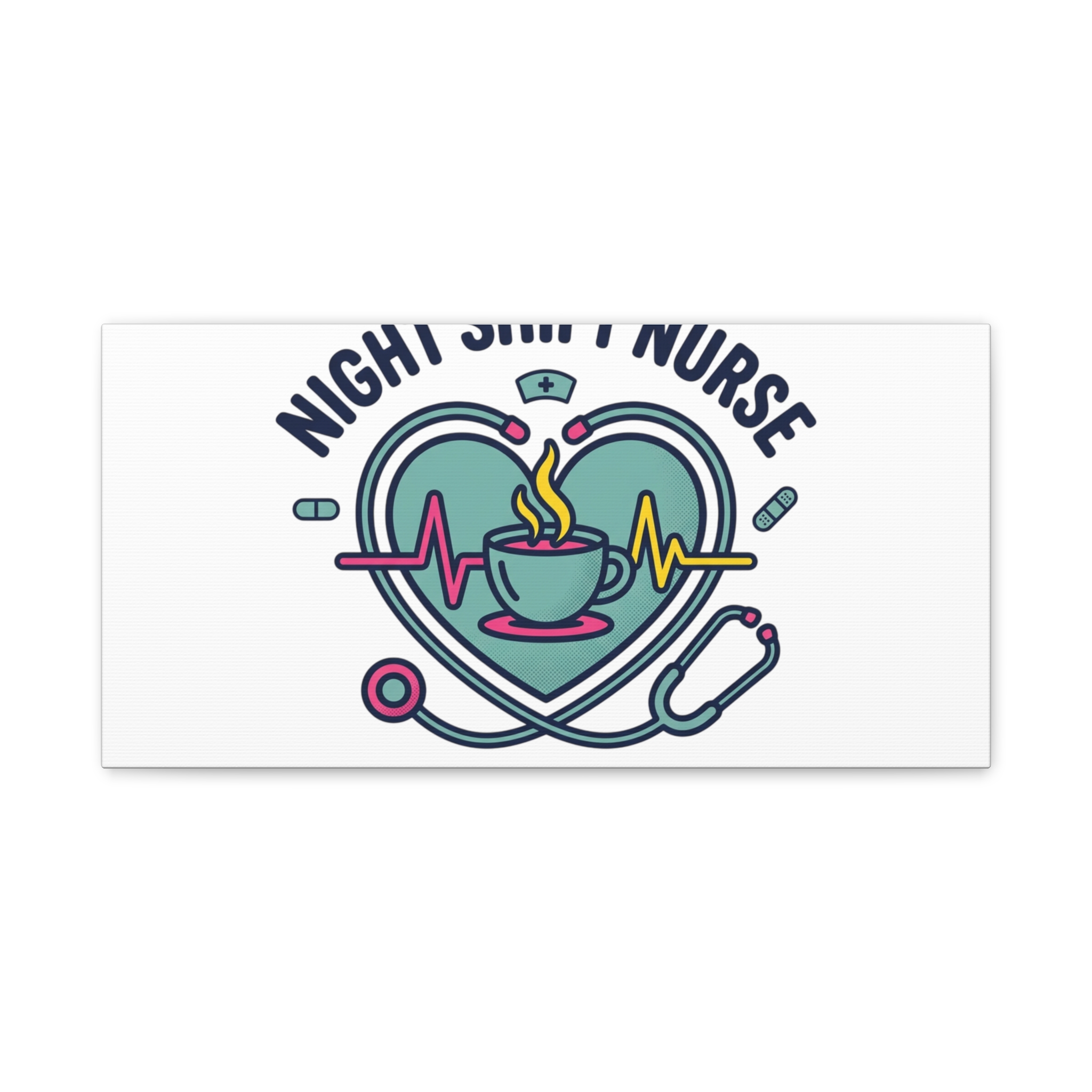 Night shift nurse canvas art blending warm nurse pride with a calm, coffee-fueled motif. The design features a stethoscope forming a heart, an ECG line, a steaming coffee cup, and small pill accents in a soft, friendly palette—matching the ‘Nurse Aesthetic’ vocabulary of resilience, community, and coffee humor. Its approachable typography and soothing colors suit hospital break rooms, nursing stations, or home offices as an understated nod to late-night clinical work and camaraderie.