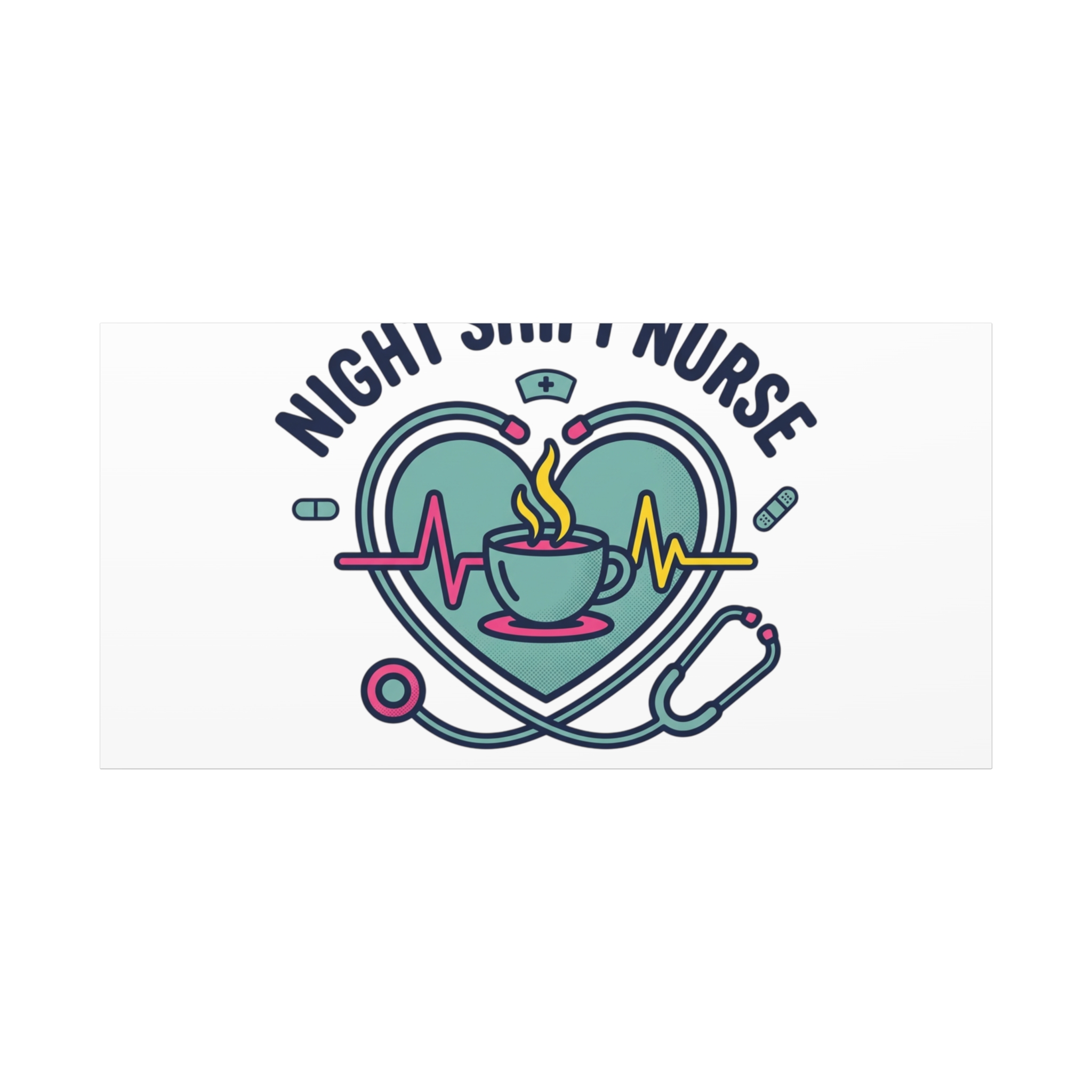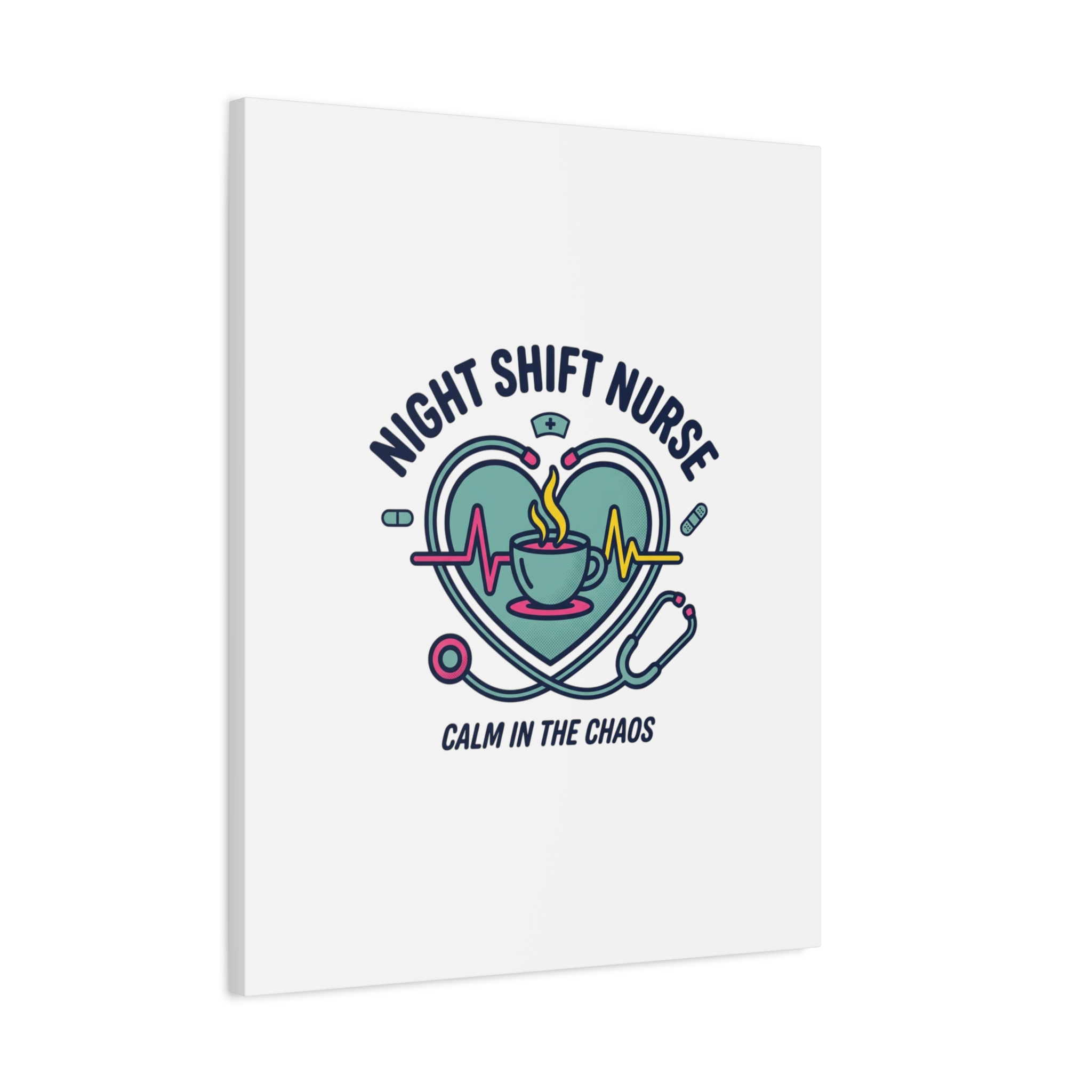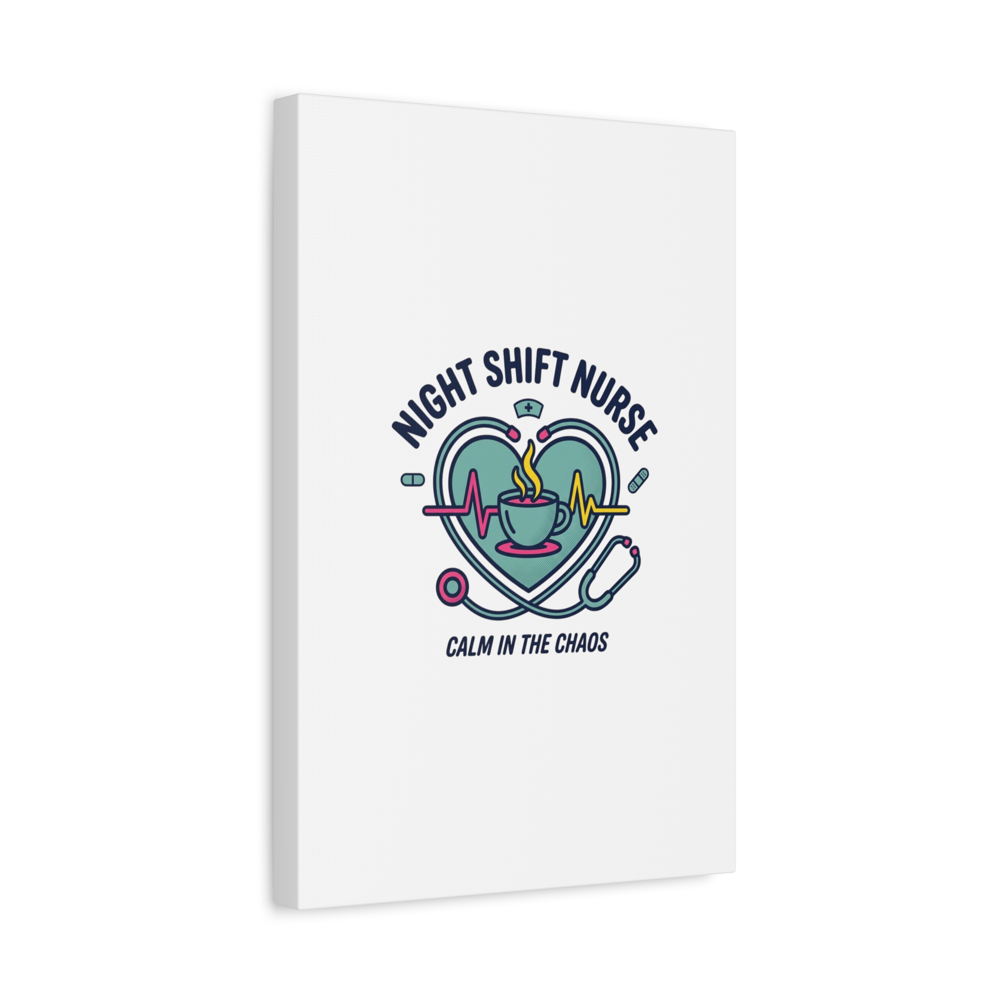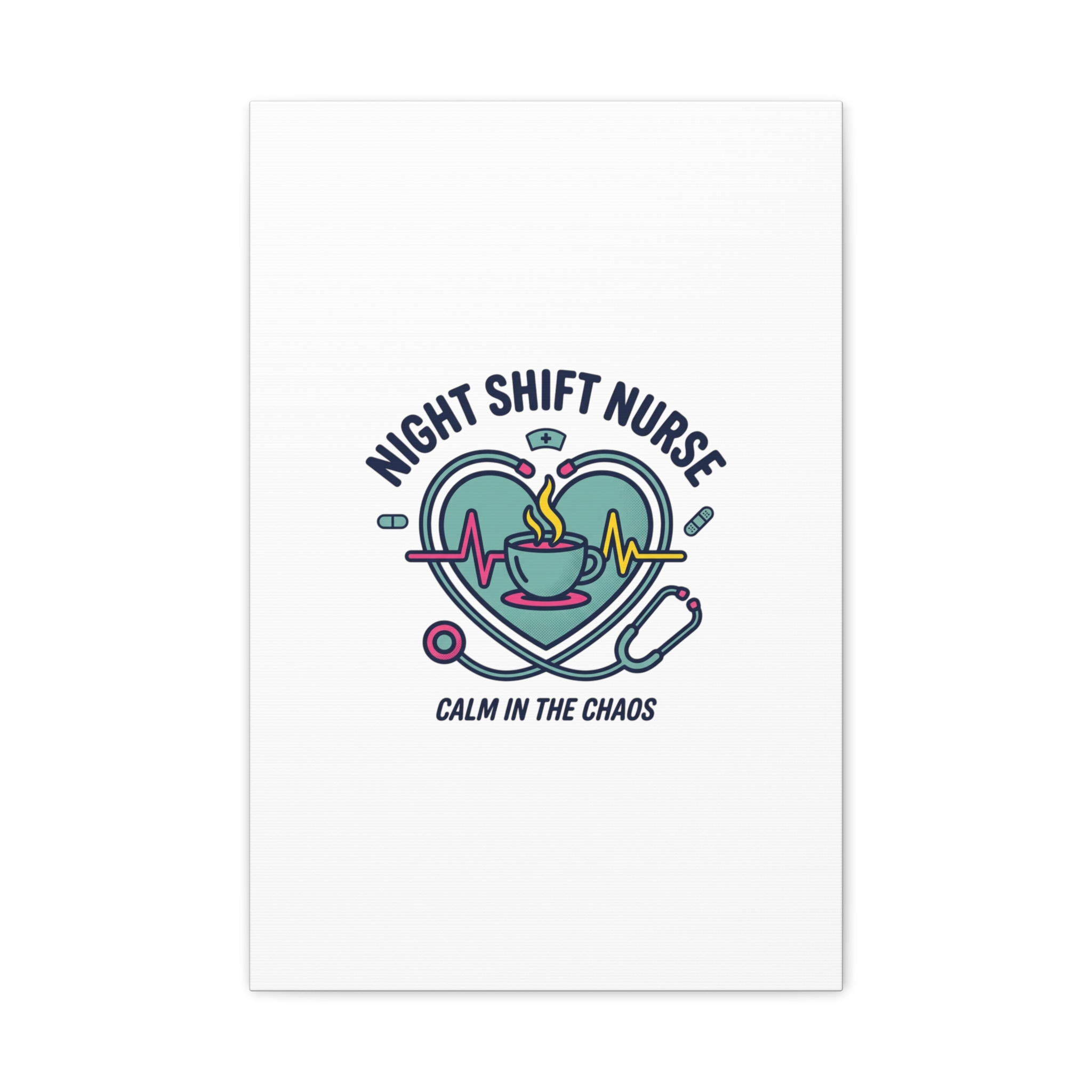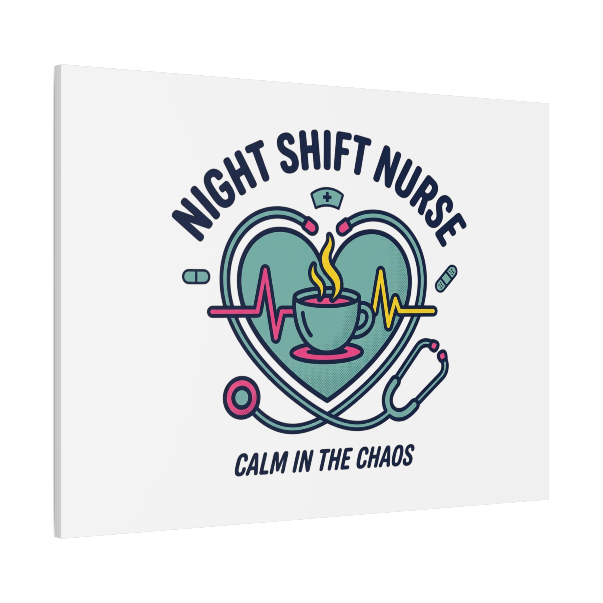 Night shift nurse canvas art blending warm nurse pride with a calm, coffee-fueled motif. The design features a stethoscope forming a heart, an ECG line, a steaming coffee cup, and small pill accents in a soft, friendly palette—matching the ‘Nurse Aesthetic’ vocabulary of resilience, community, and coffee humor. Its approachable typography and soothing colors suit hospital break rooms, nursing stations, or home offices as an understated nod to late-night clinical work and camaraderie.