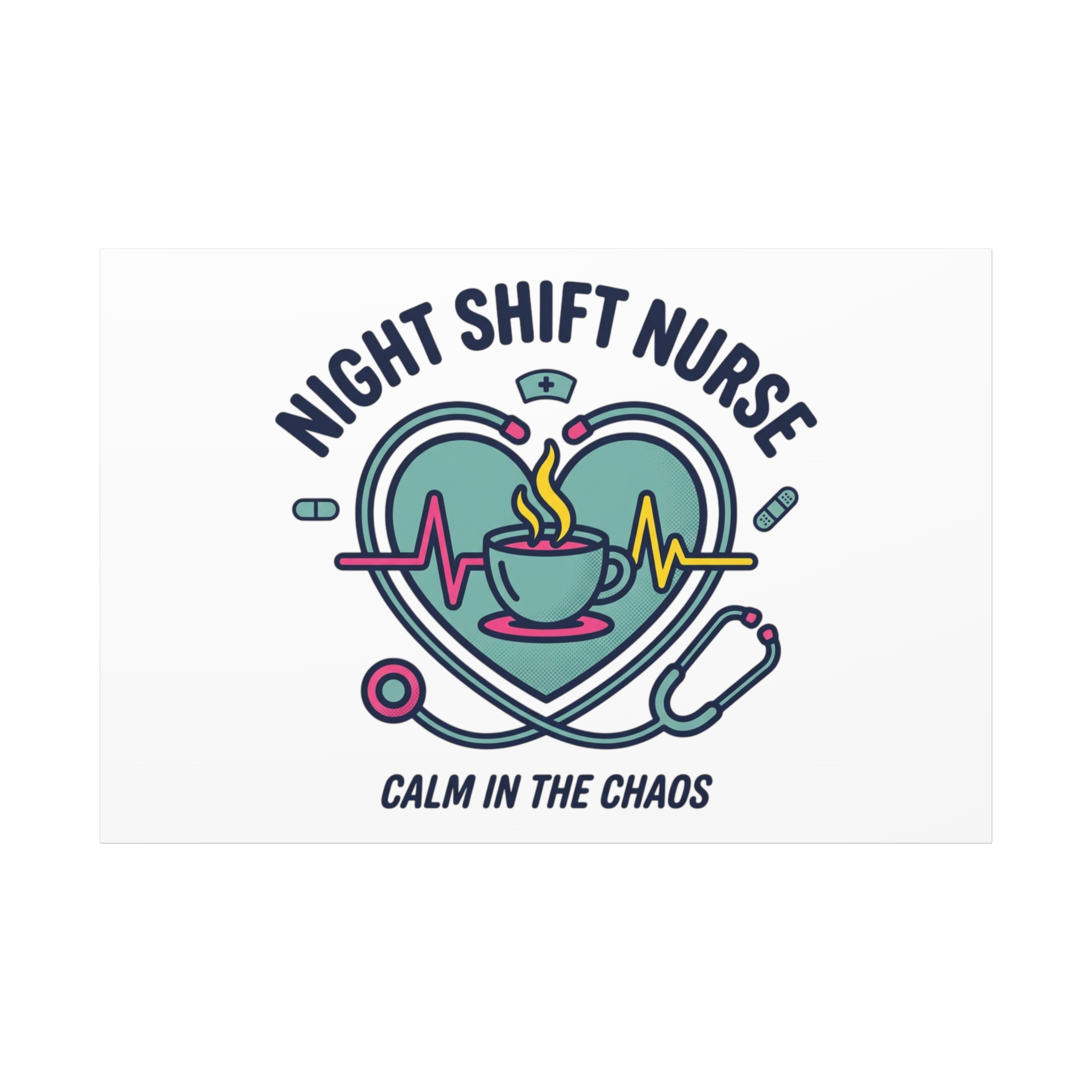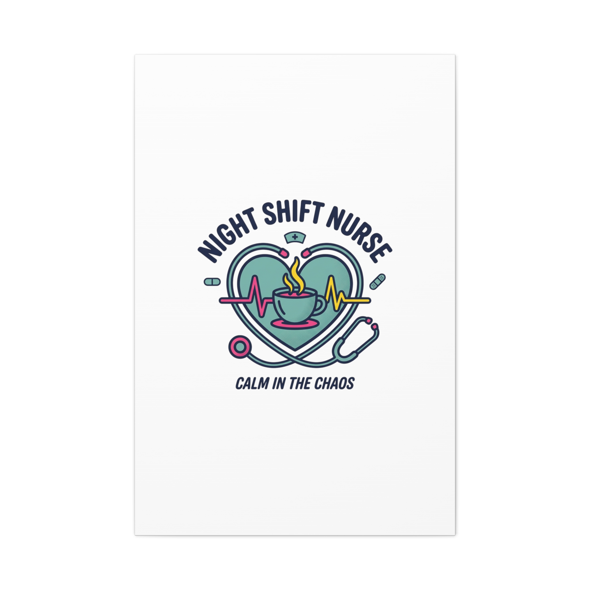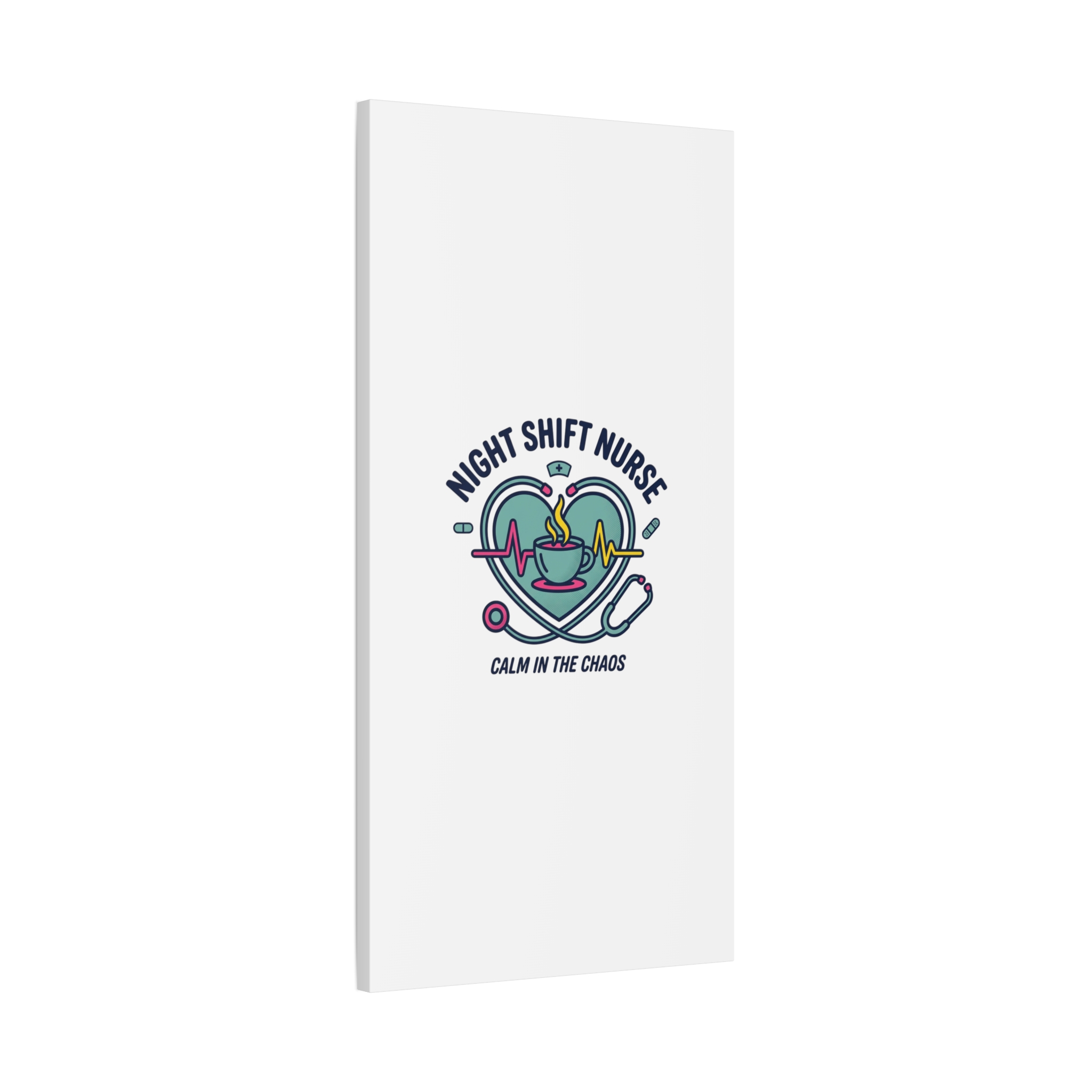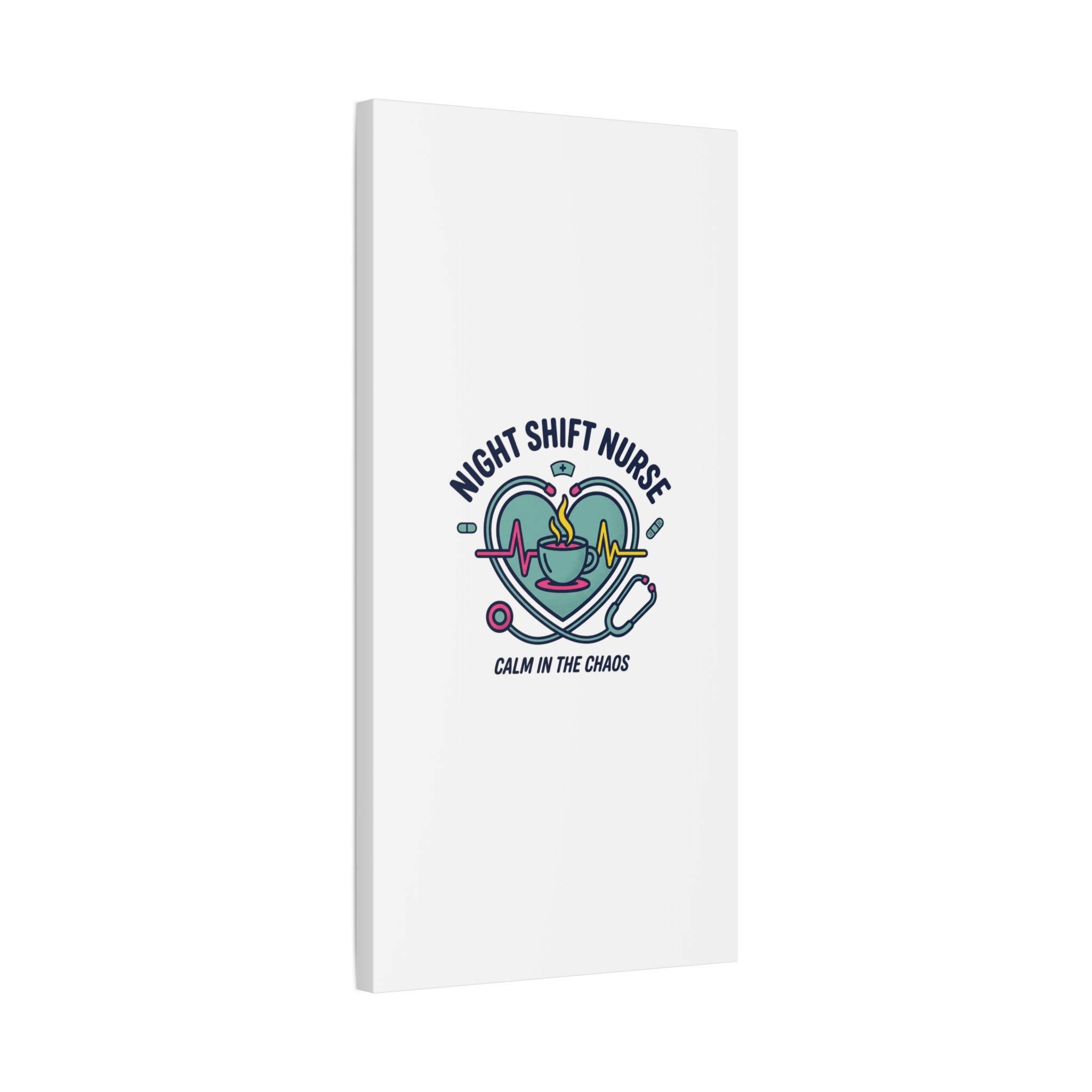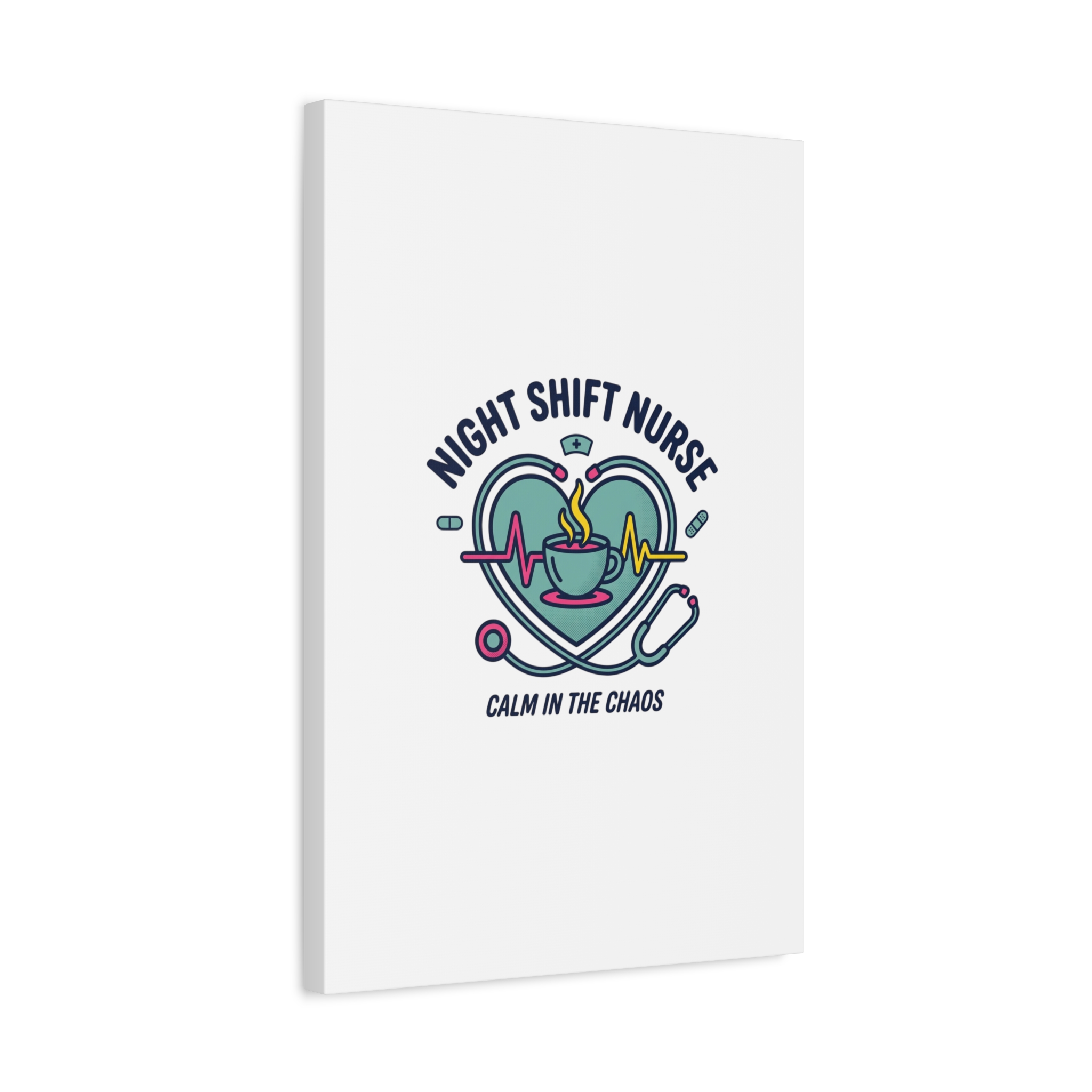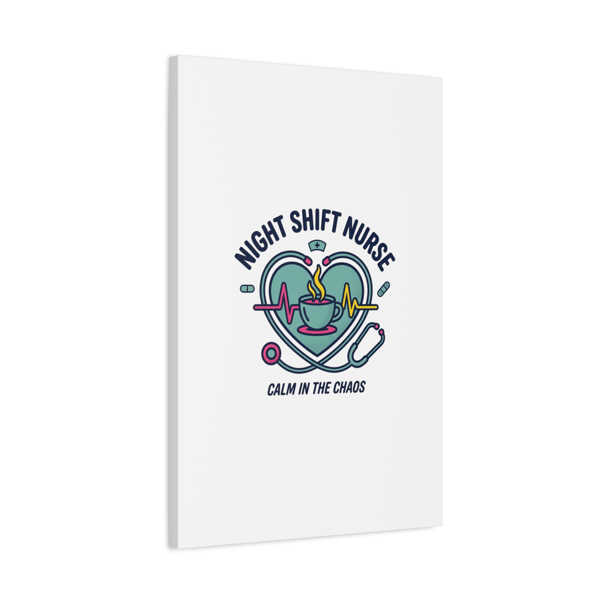 Night shift nurse canvas art blending warm nurse pride with a calm, coffee-fueled motif. The design features a stethoscope forming a heart, an ECG line, a steaming coffee cup, and small pill accents in a soft, friendly palette—matching the ‘Nurse Aesthetic’ vocabulary of resilience, community, and coffee humor. Its approachable typography and soothing colors suit hospital break rooms, nursing stations, or home offices as an understated nod to late-night clinical work and camaraderie.
