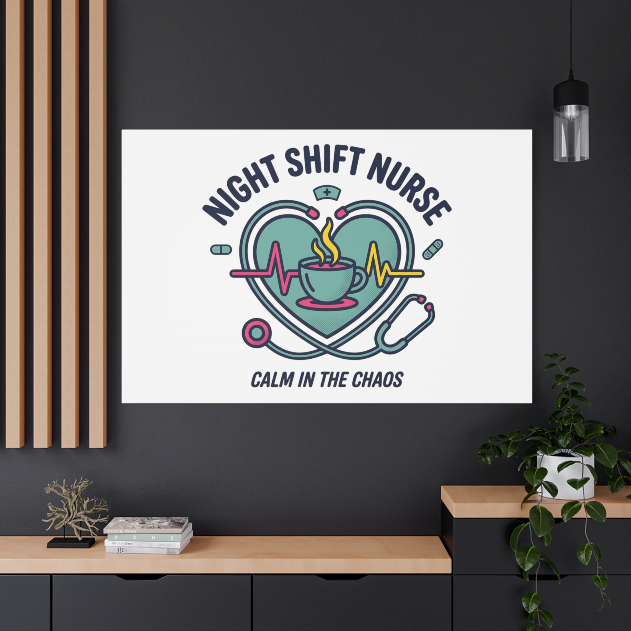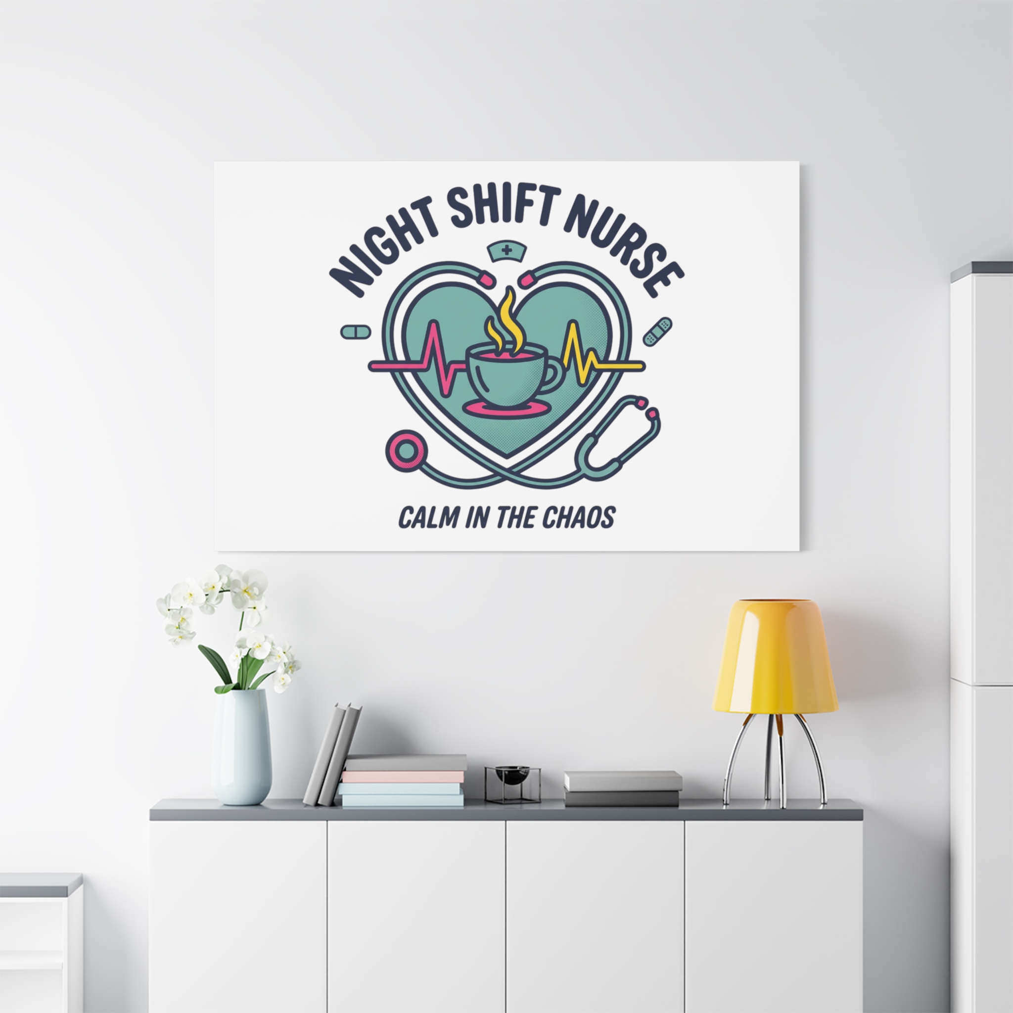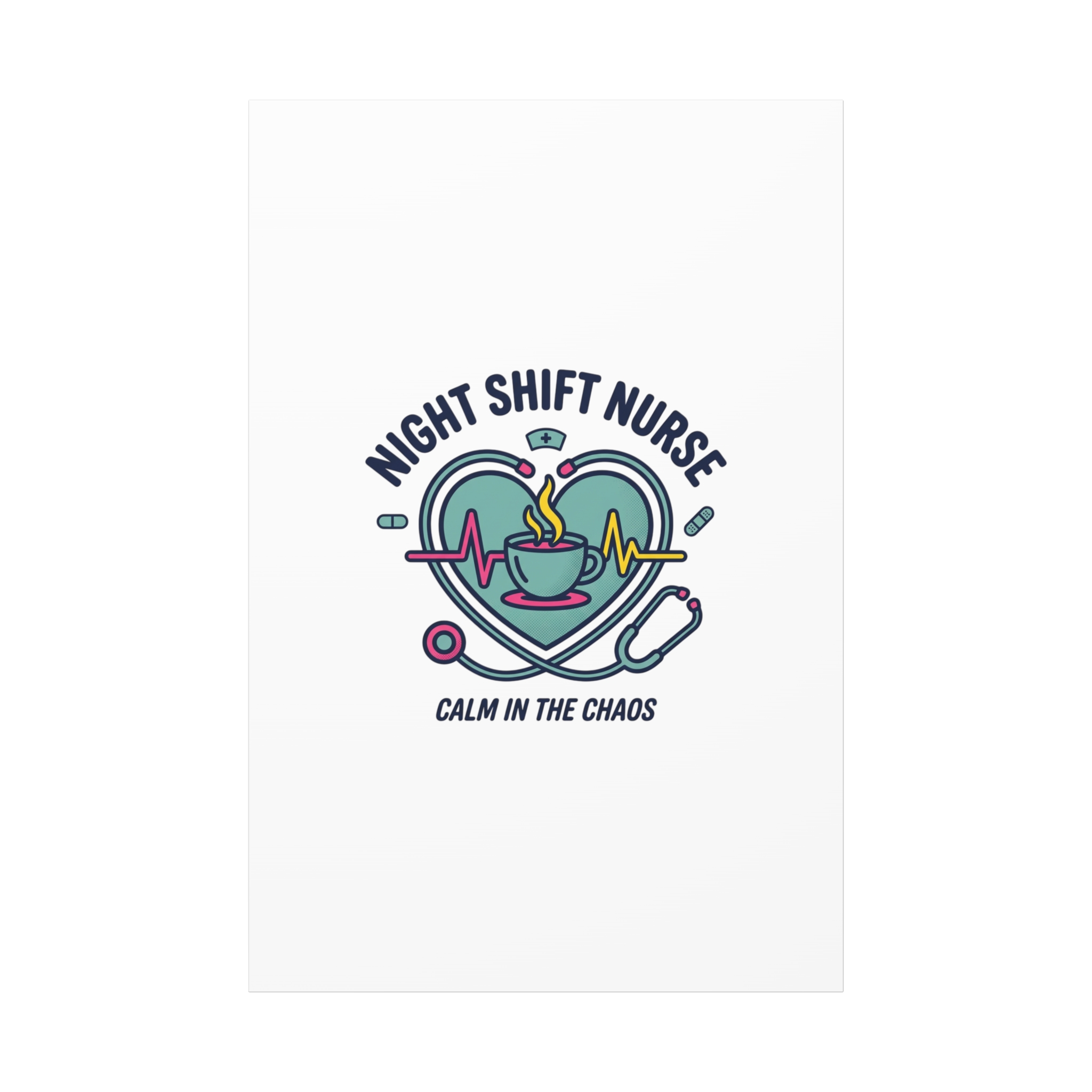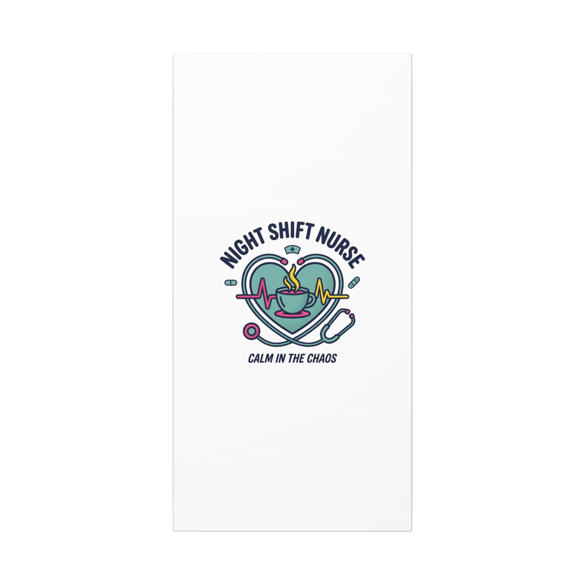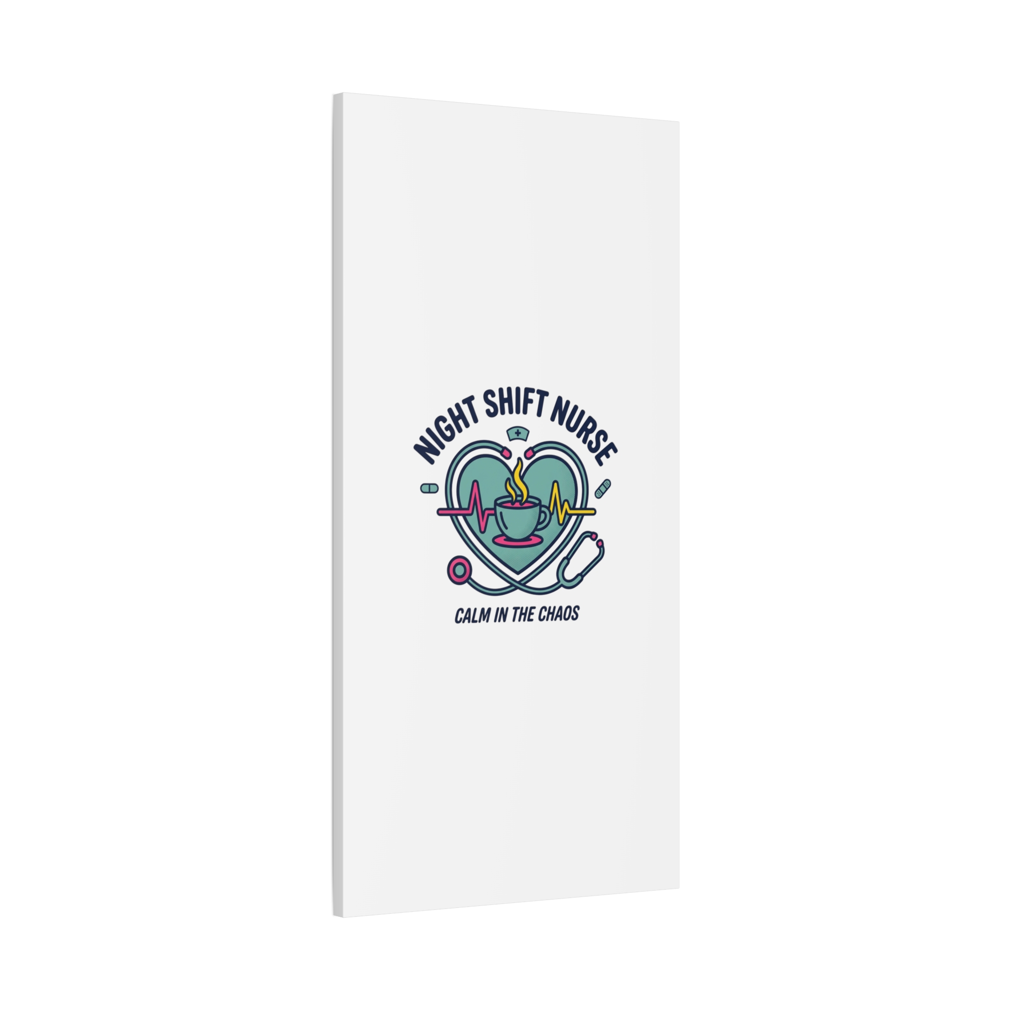 Night shift nurse canvas art blending warm nurse pride with a calm, coffee-fueled motif. The design features a stethoscope forming a heart, an ECG line, a steaming coffee cup, and small pill accents in a soft, friendly palette—matching the ‘Nurse Aesthetic’ vocabulary of resilience, community, and coffee humor. Its approachable typography and soothing colors suit hospital break rooms, nursing stations, or home offices as an understated nod to late-night clinical work and camaraderie.