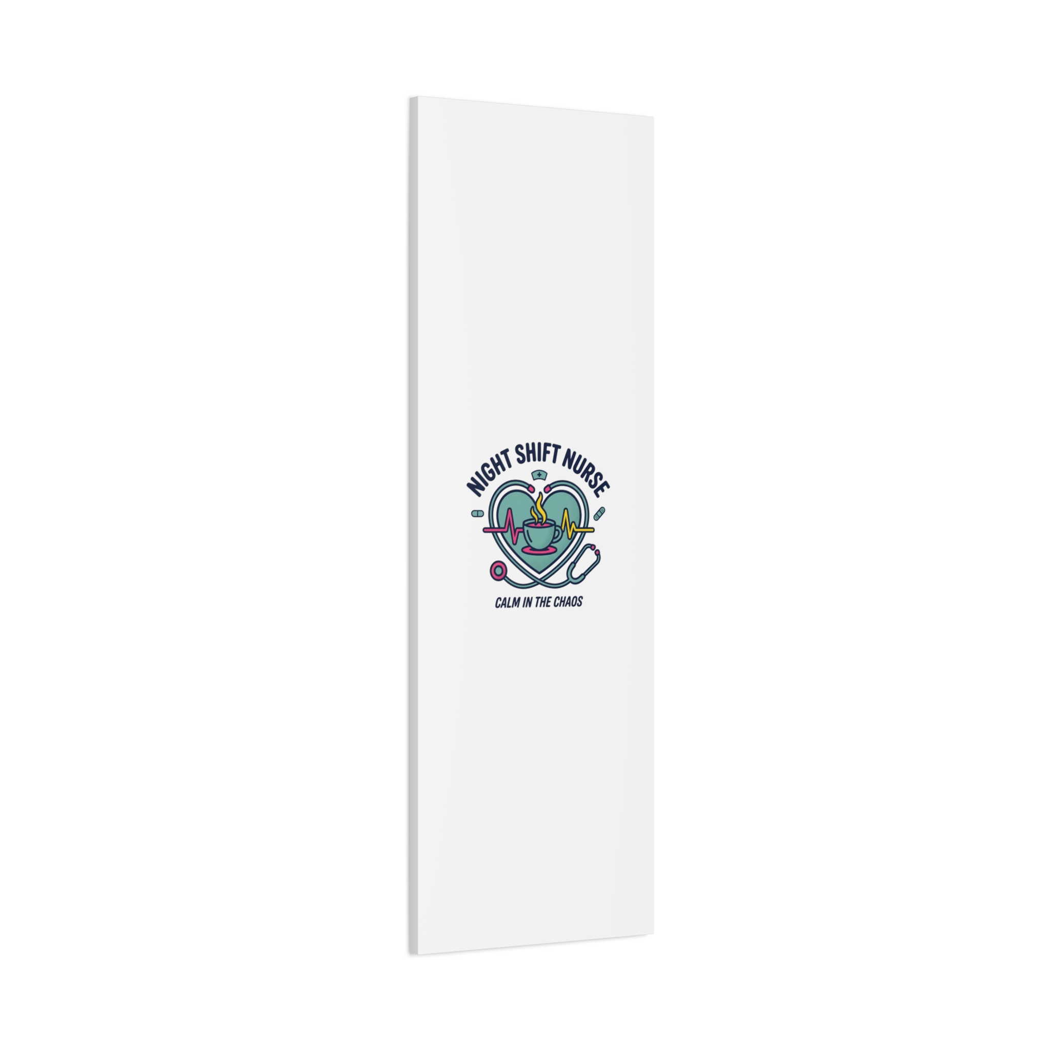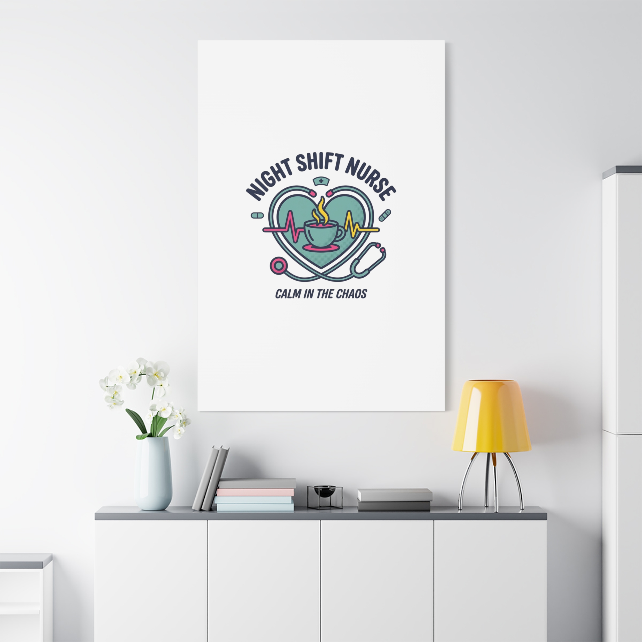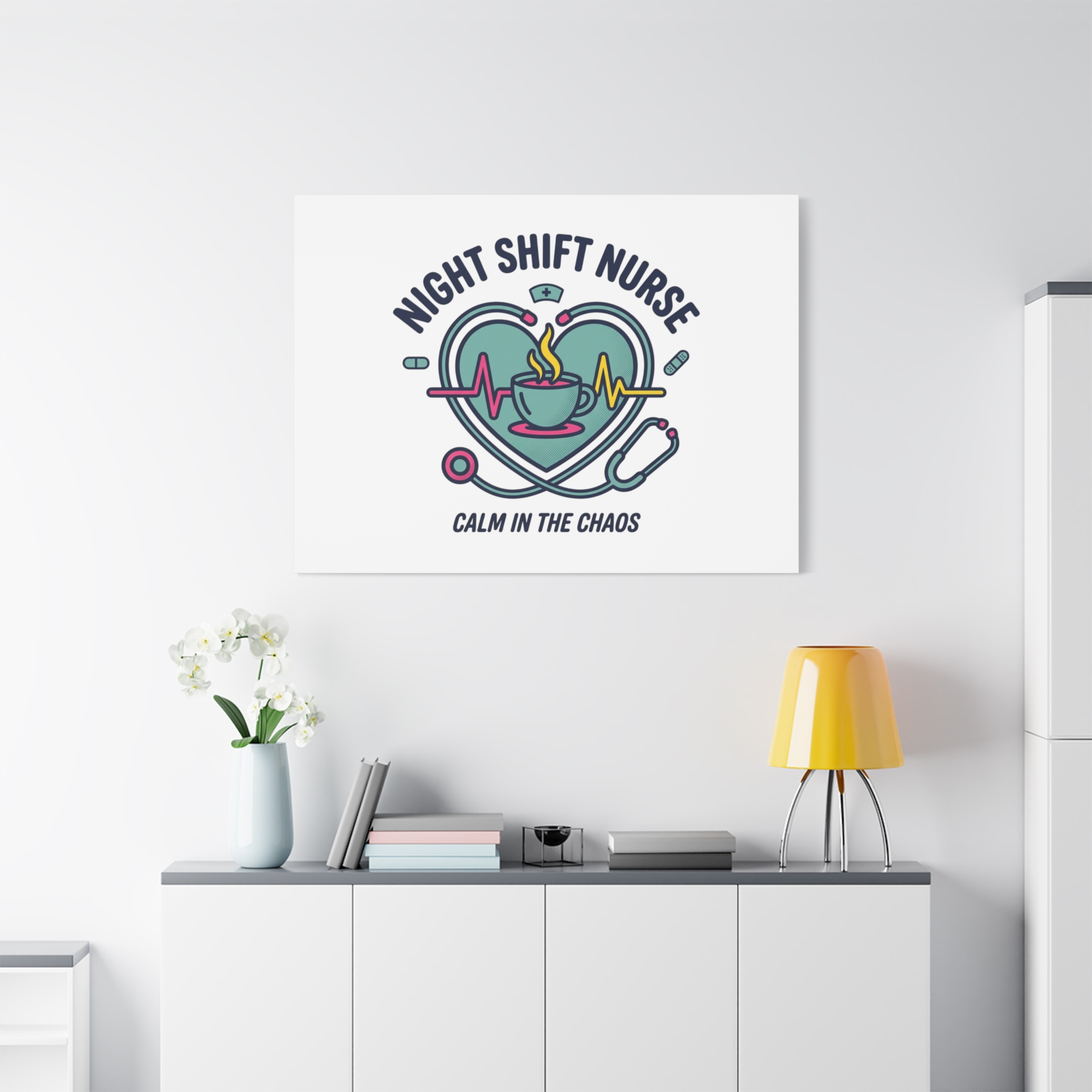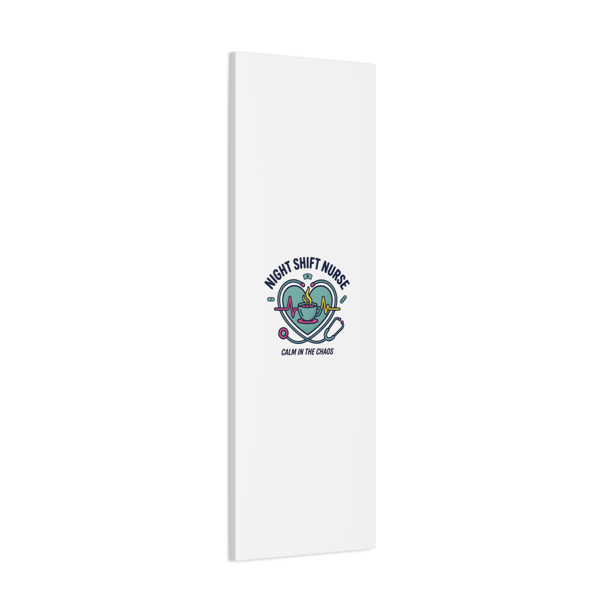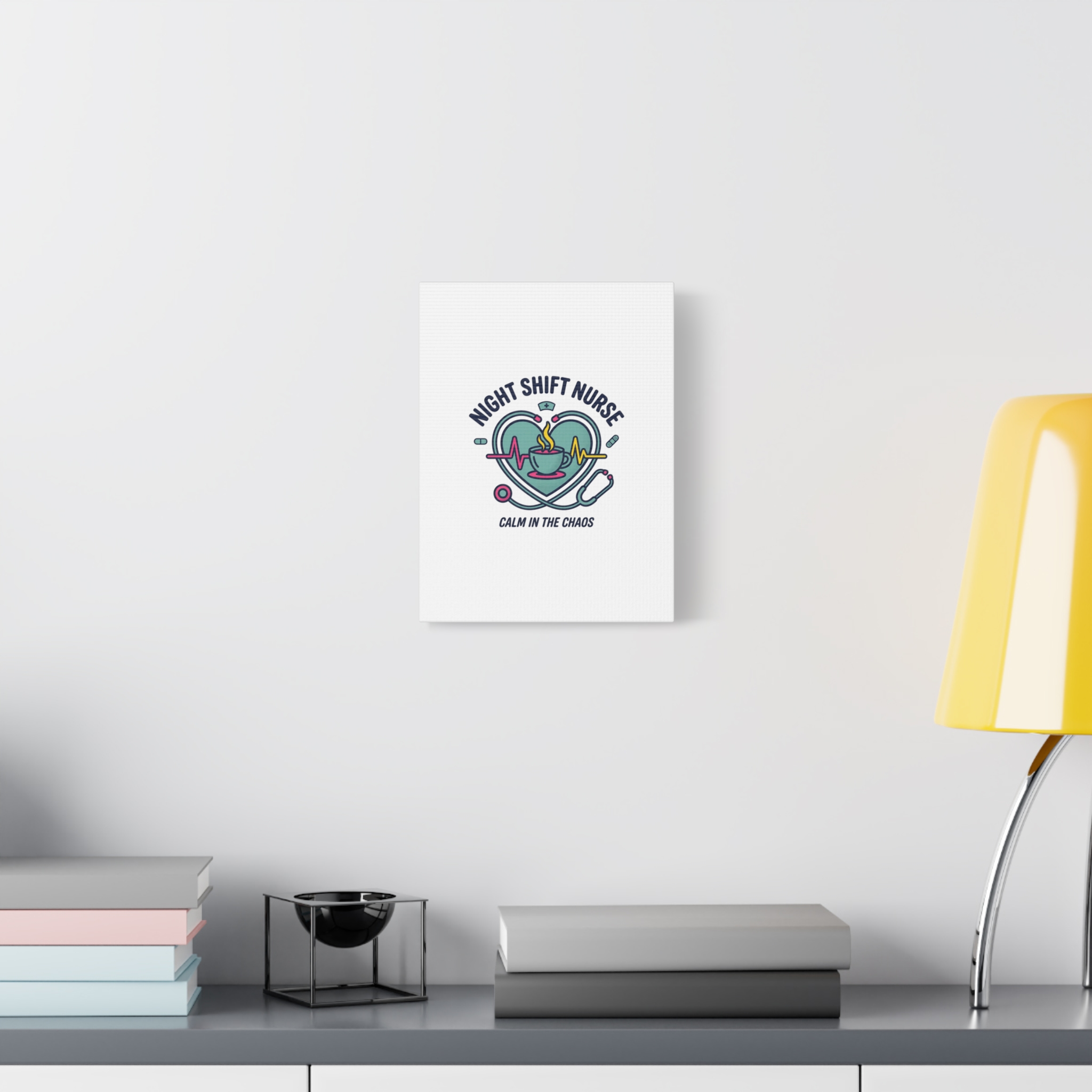 Night shift nurse canvas art blending warm nurse pride with a calm, coffee-fueled motif. The design features a stethoscope forming a heart, an ECG line, a steaming coffee cup, and small pill accents in a soft, friendly palette—matching the ‘Nurse Aesthetic’ vocabulary of resilience, community, and coffee humor. Its approachable typography and soothing colors suit hospital break rooms, nursing stations, or home offices as an understated nod to late-night clinical work and camaraderie.