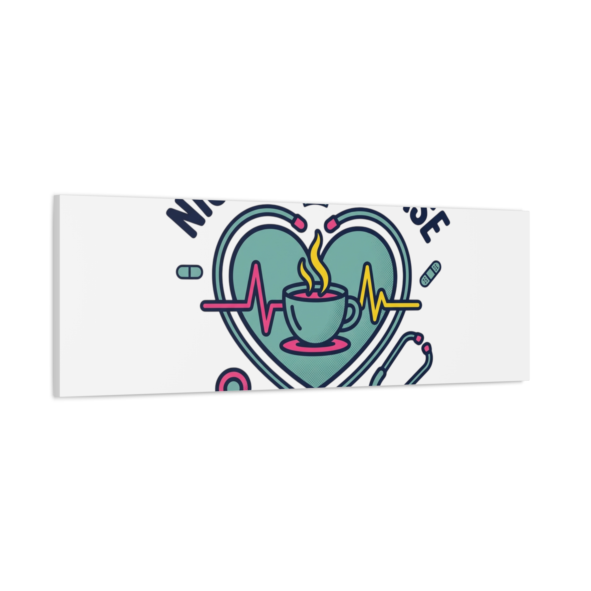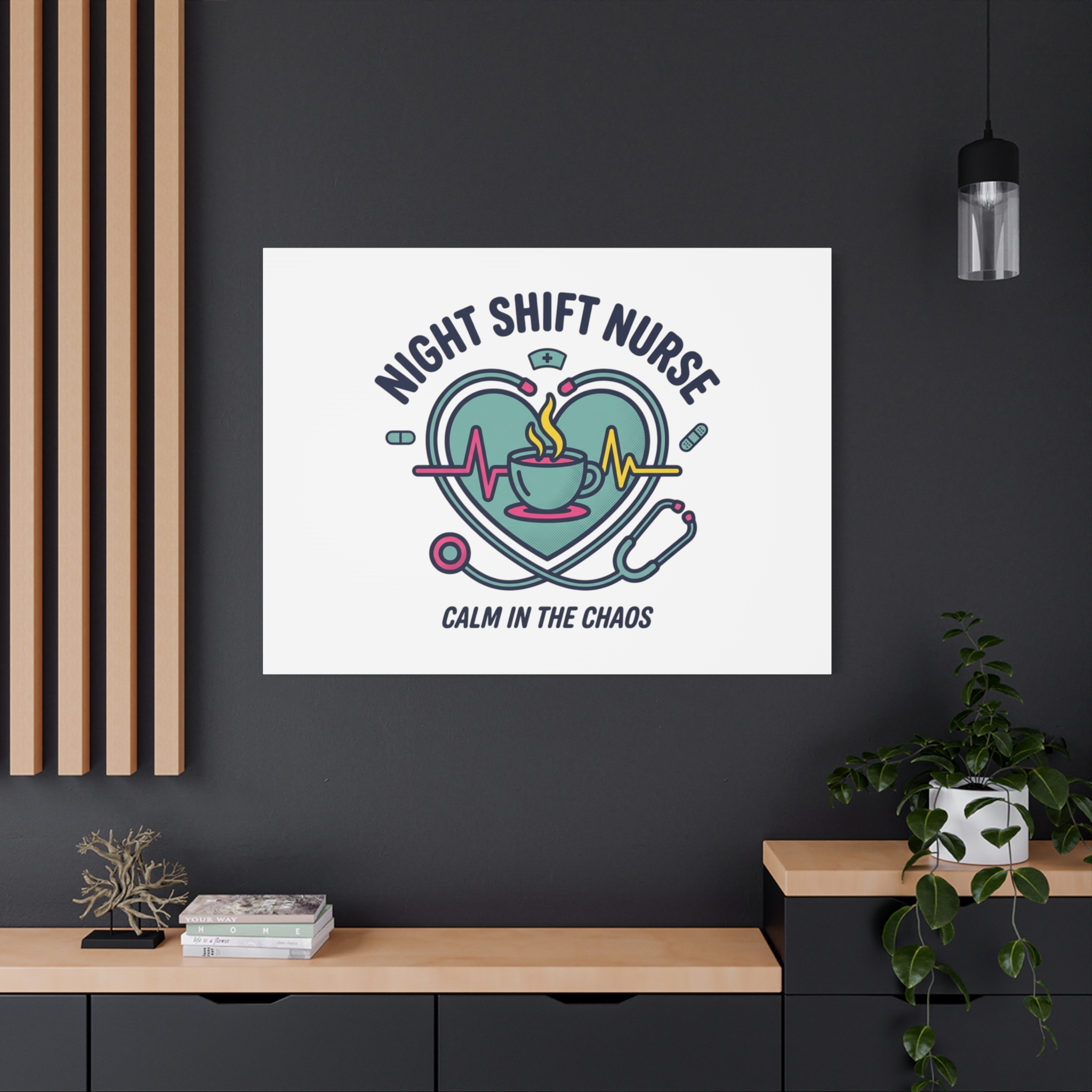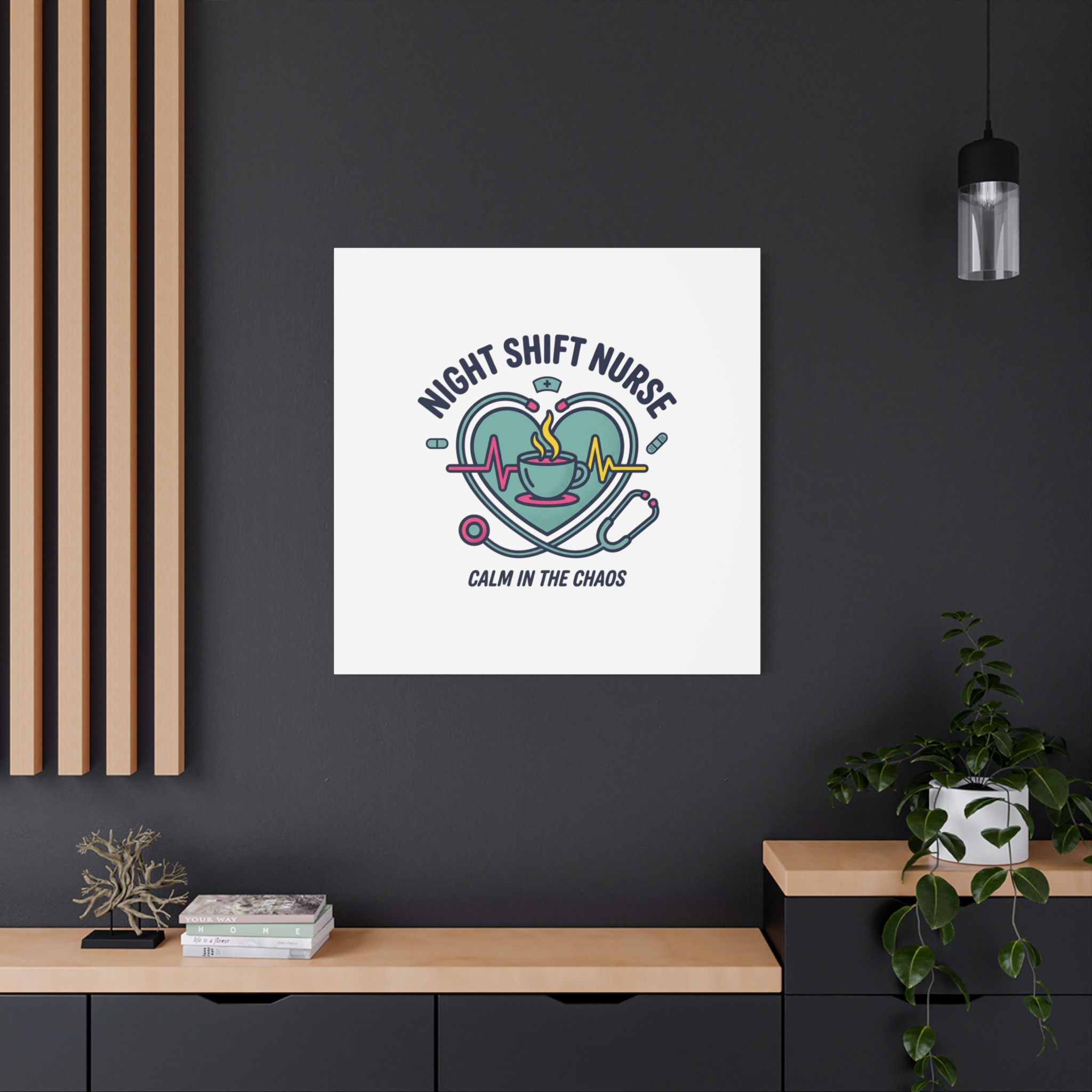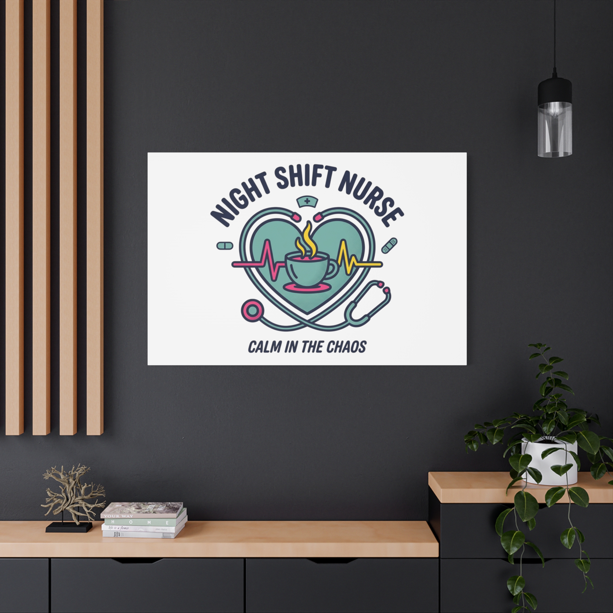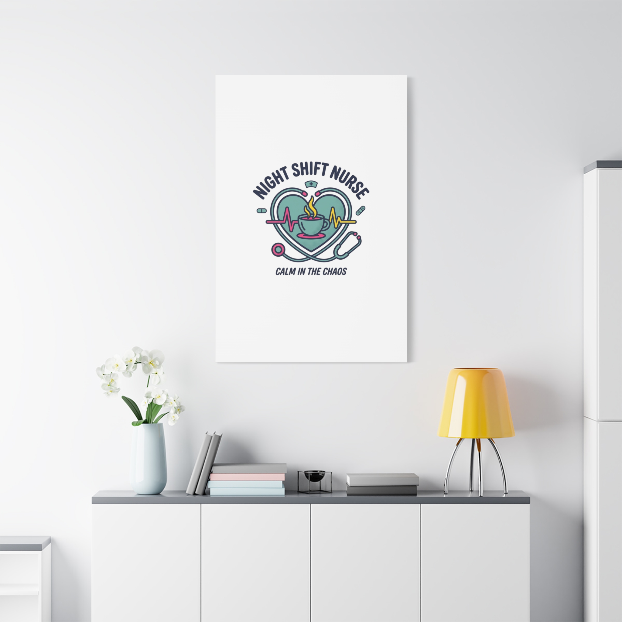 Night shift nurse canvas art blending warm nurse pride with a calm, coffee-fueled motif. The design features a stethoscope forming a heart, an ECG line, a steaming coffee cup, and small pill accents in a soft, friendly palette—matching the ‘Nurse Aesthetic’ vocabulary of resilience, community, and coffee humor. Its approachable typography and soothing colors suit hospital break rooms, nursing stations, or home offices as an understated nod to late-night clinical work and camaraderie.