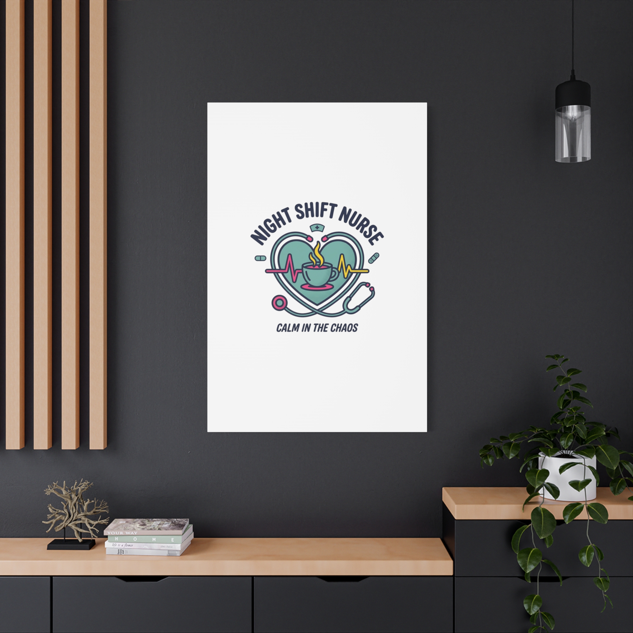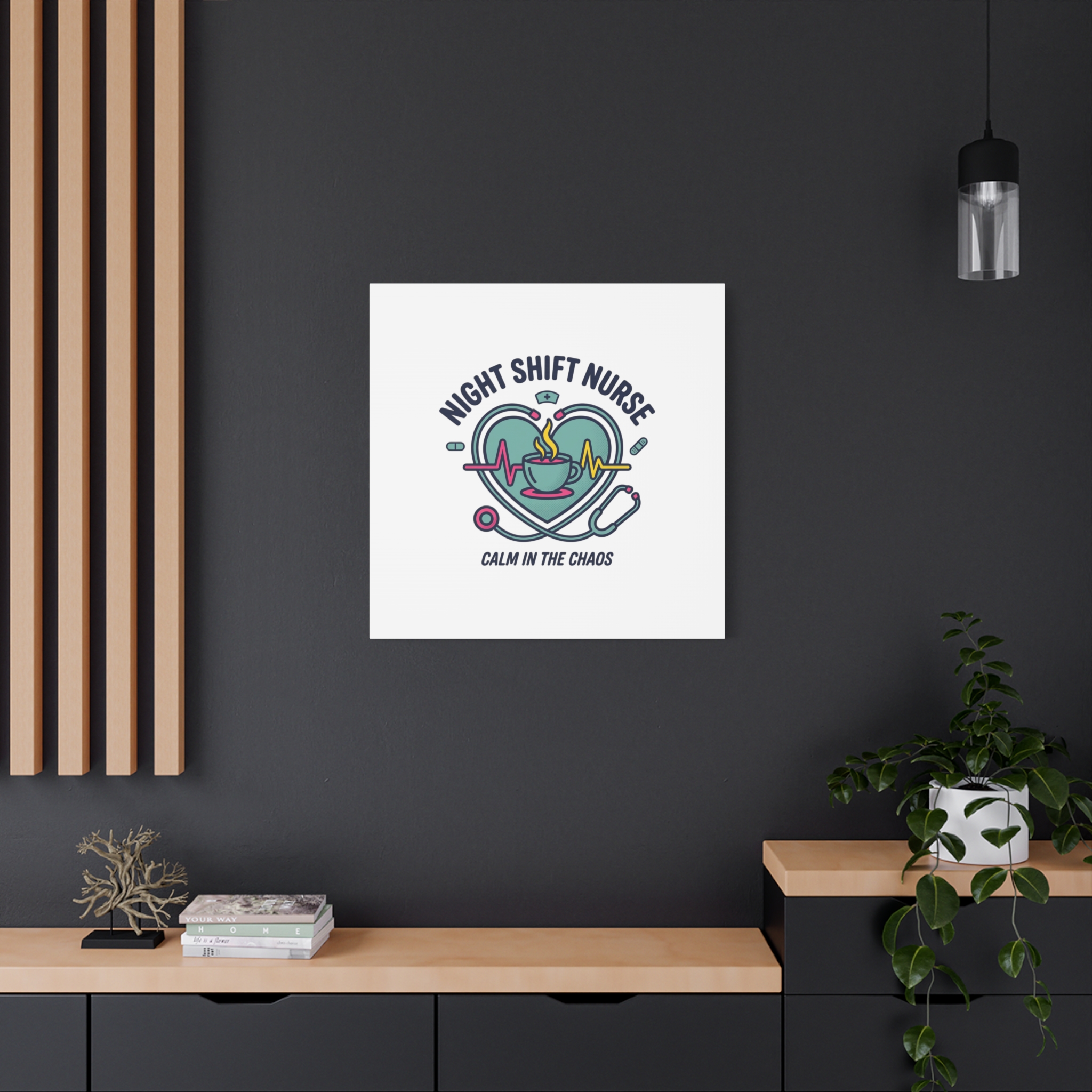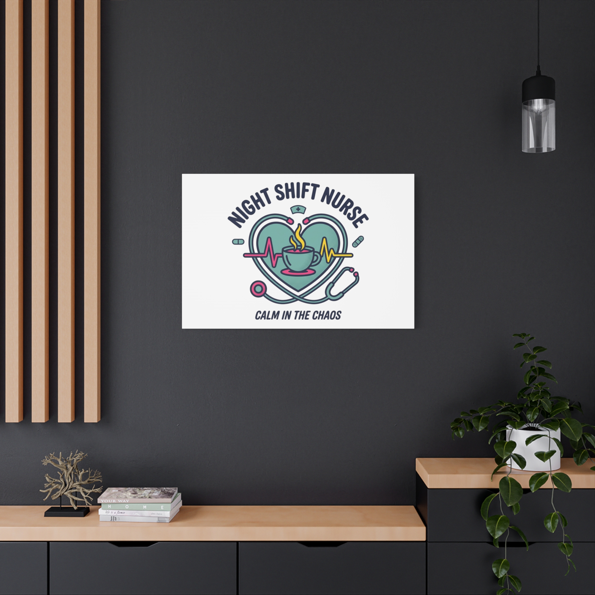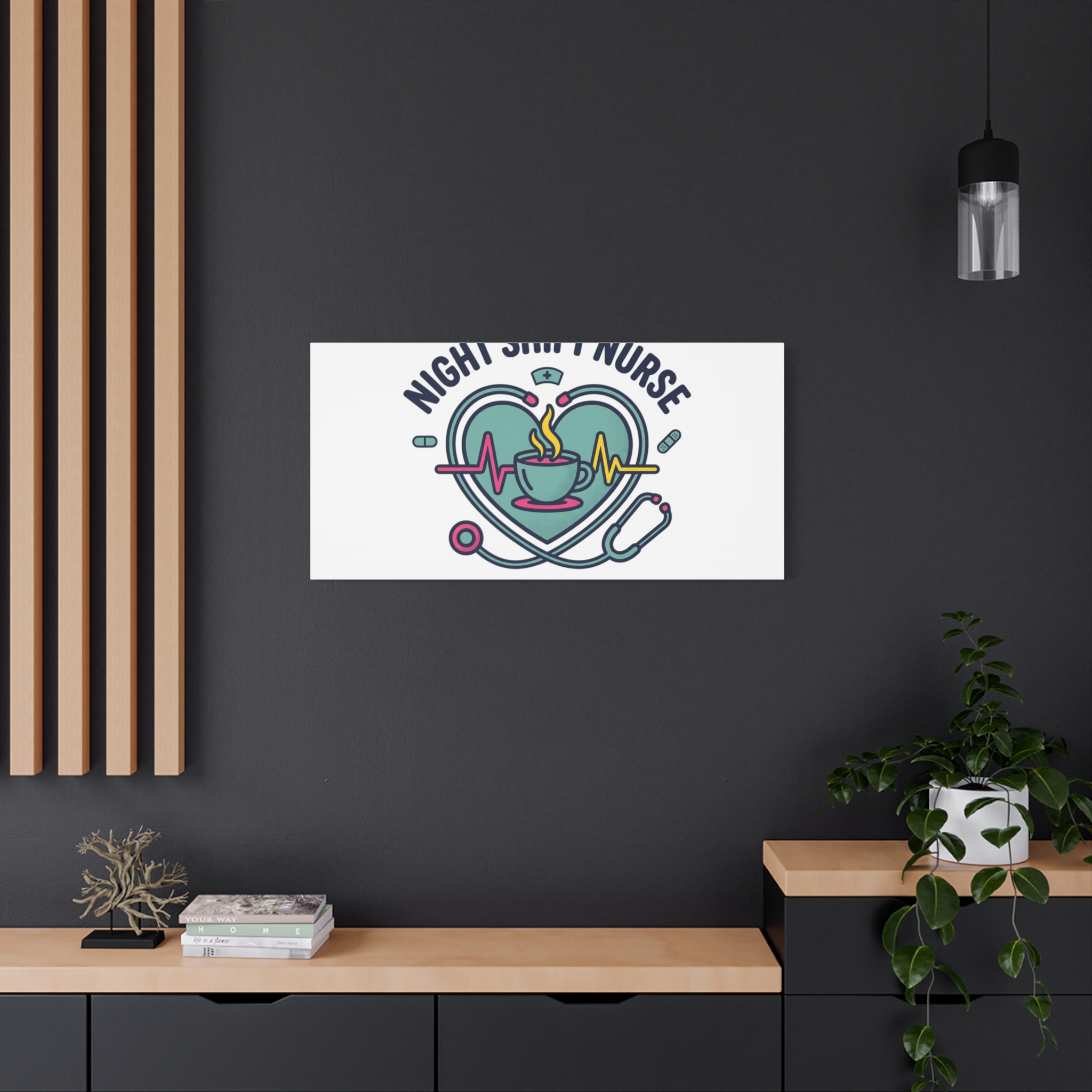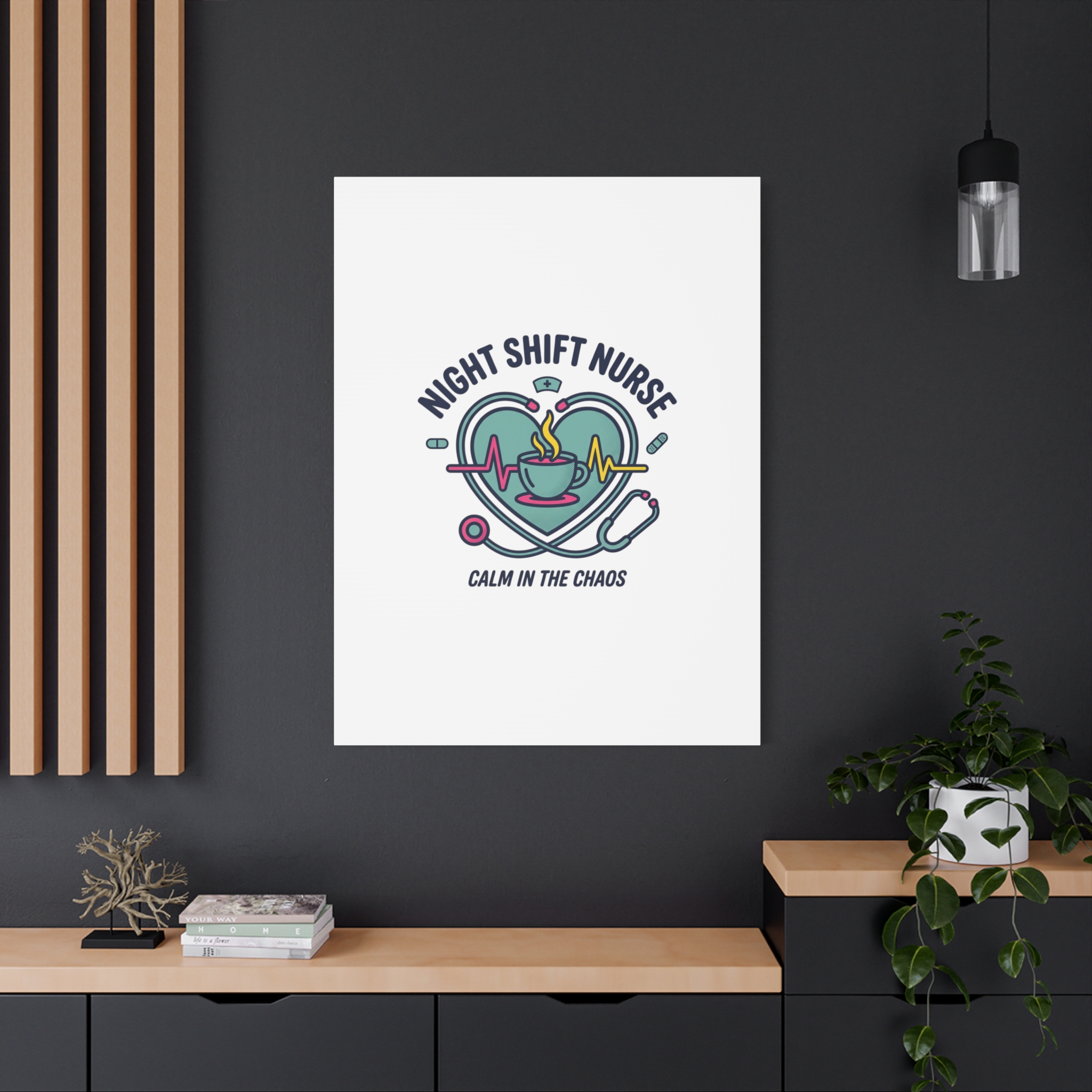 Night shift nurse canvas art blending warm nurse pride with a calm, coffee-fueled motif. The design features a stethoscope forming a heart, an ECG line, a steaming coffee cup, and small pill accents in a soft, friendly palette—matching the ‘Nurse Aesthetic’ vocabulary of resilience, community, and coffee humor. Its approachable typography and soothing colors suit hospital break rooms, nursing stations, or home offices as an understated nod to late-night clinical work and camaraderie.