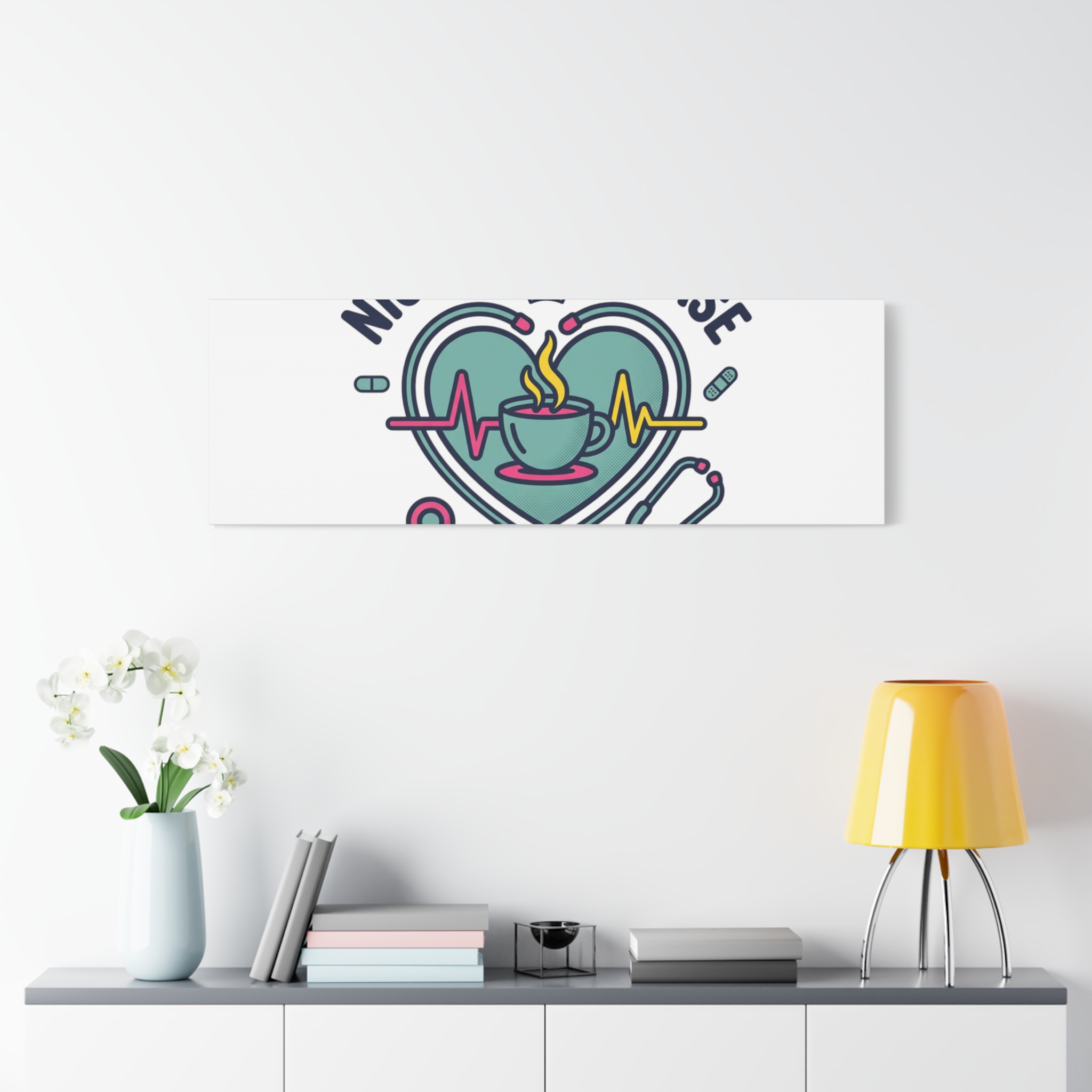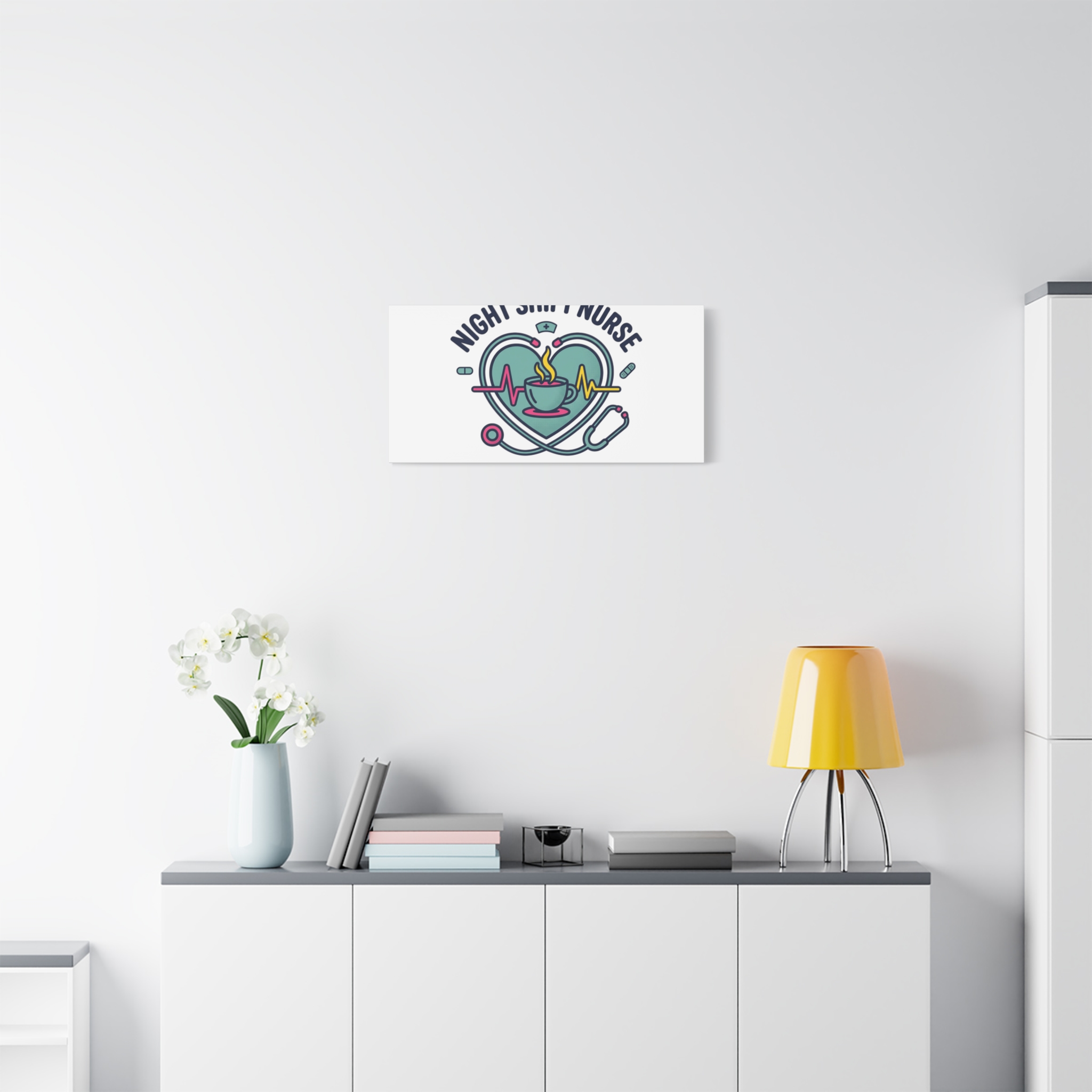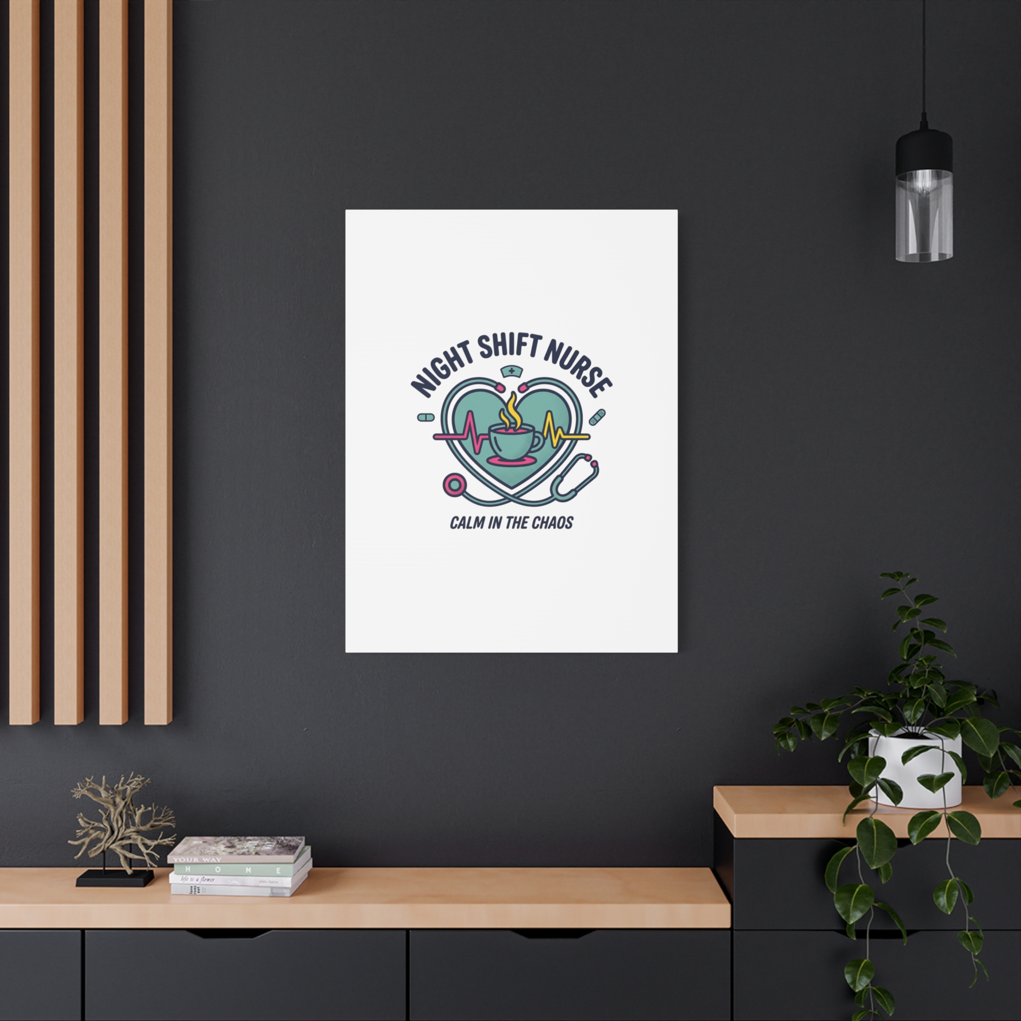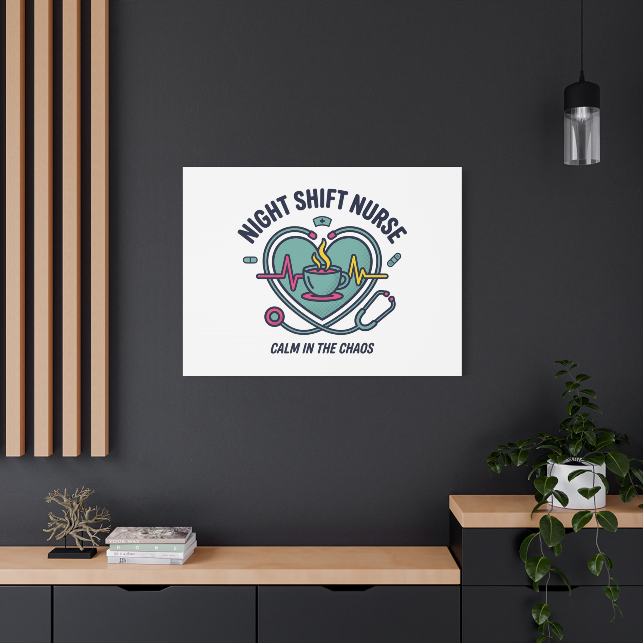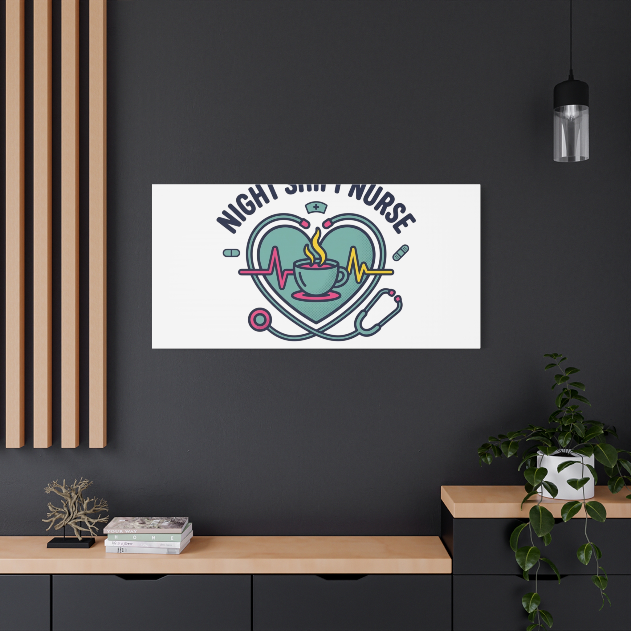 Night shift nurse canvas art blending warm nurse pride with a calm, coffee-fueled motif. The design features a stethoscope forming a heart, an ECG line, a steaming coffee cup, and small pill accents in a soft, friendly palette—matching the ‘Nurse Aesthetic’ vocabulary of resilience, community, and coffee humor. Its approachable typography and soothing colors suit hospital break rooms, nursing stations, or home offices as an understated nod to late-night clinical work and camaraderie.