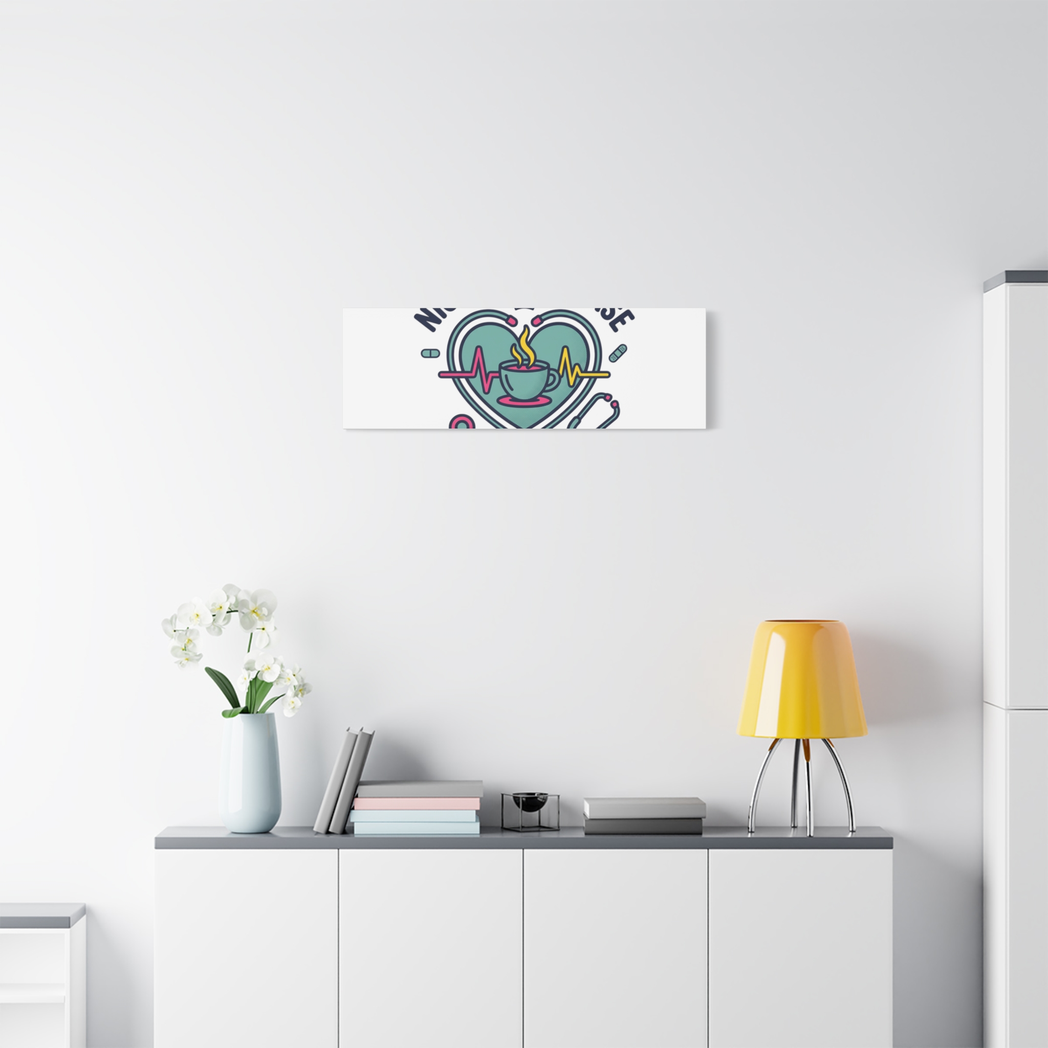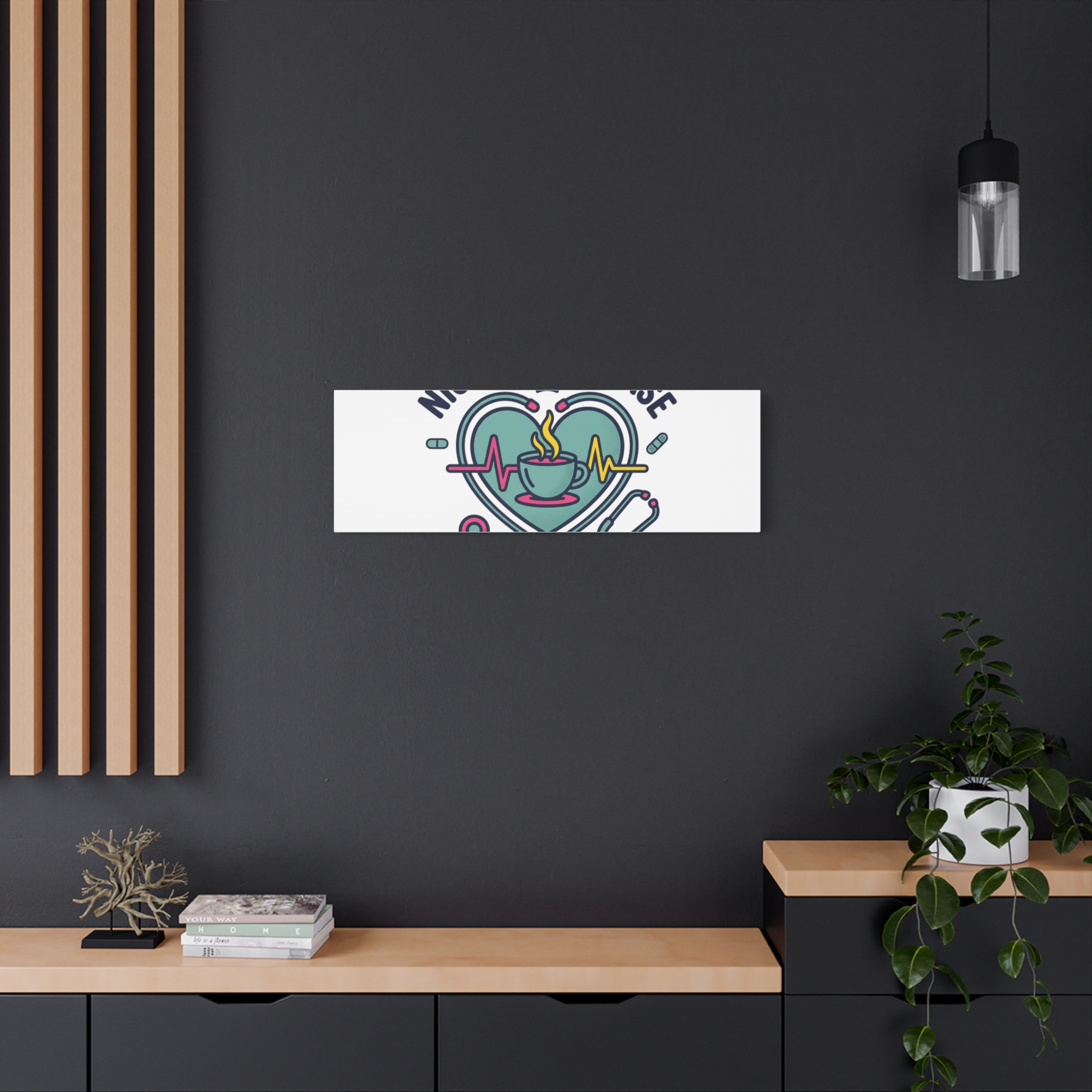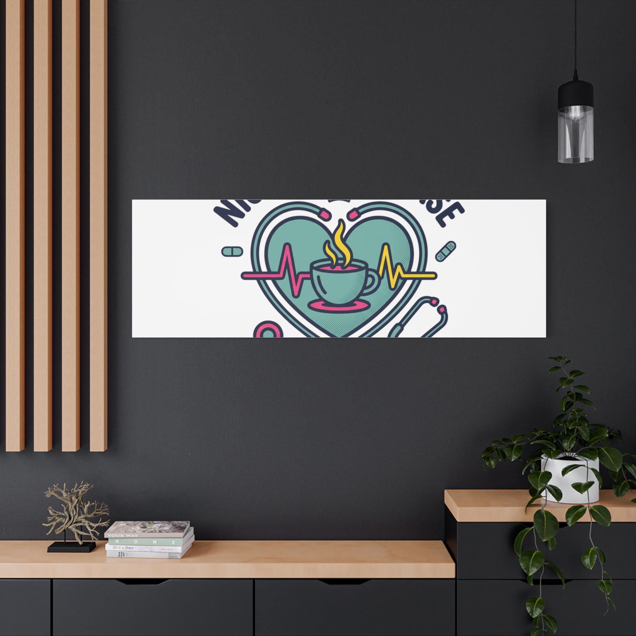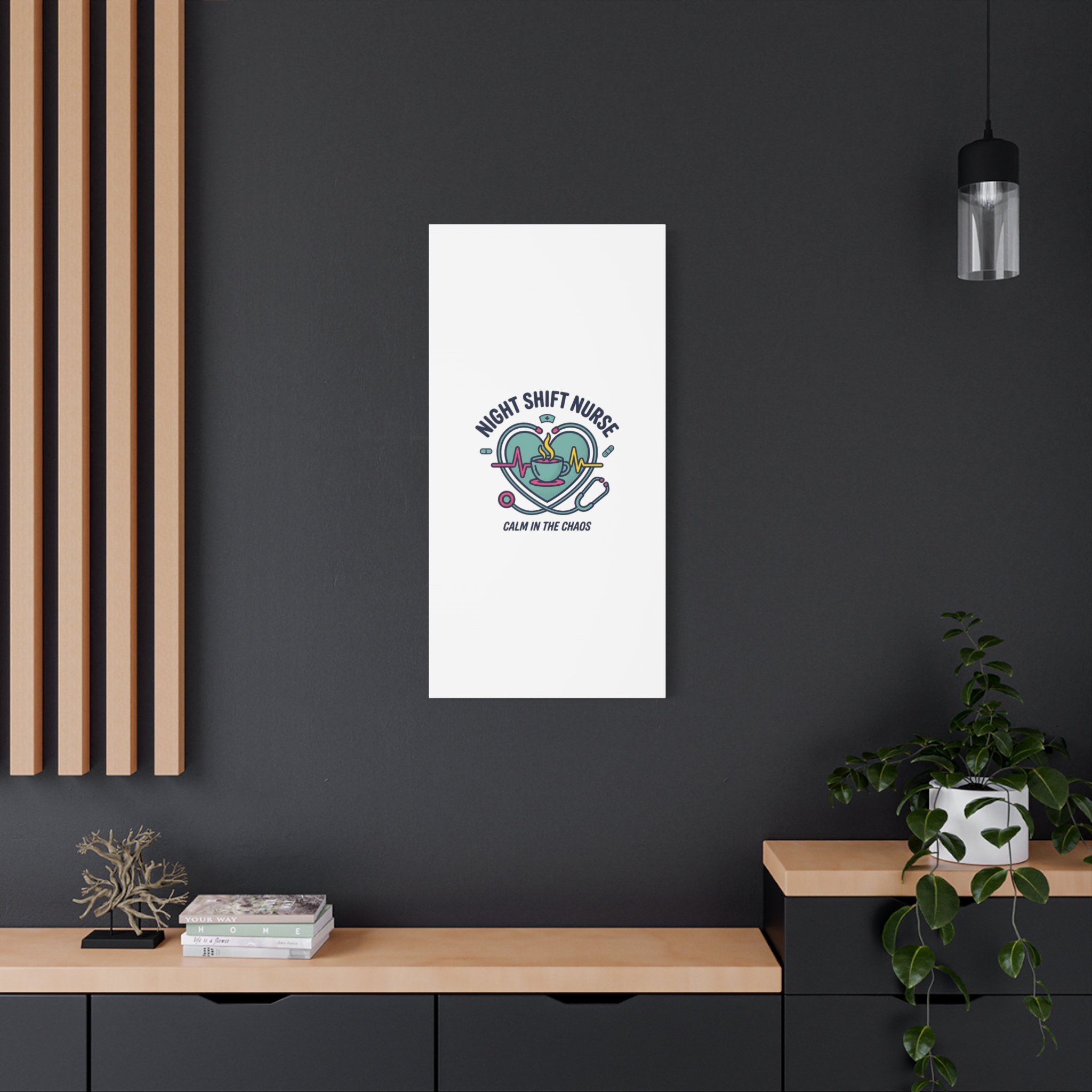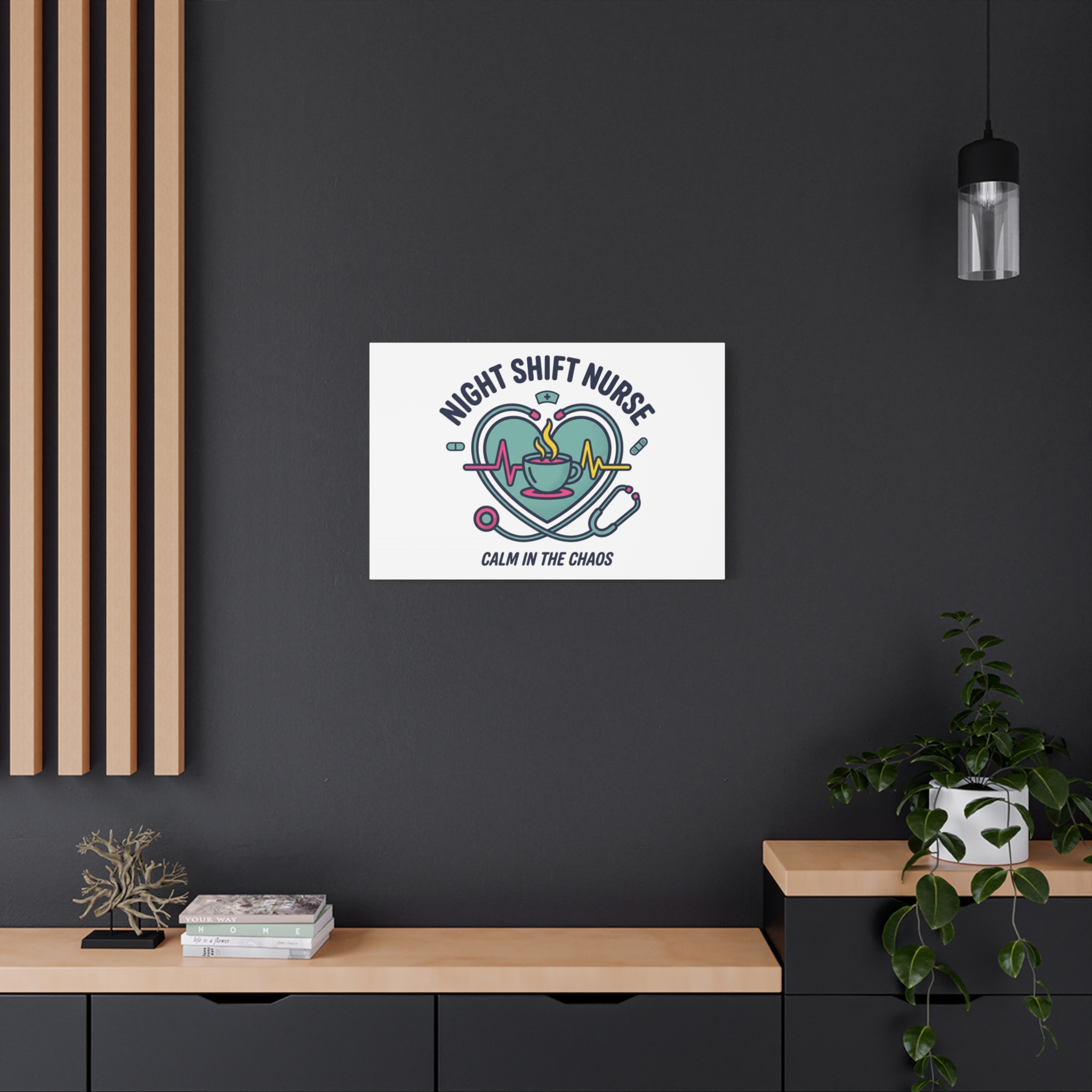 Night shift nurse canvas art blending warm nurse pride with a calm, coffee-fueled motif. The design features a stethoscope forming a heart, an ECG line, a steaming coffee cup, and small pill accents in a soft, friendly palette—matching the ‘Nurse Aesthetic’ vocabulary of resilience, community, and coffee humor. Its approachable typography and soothing colors suit hospital break rooms, nursing stations, or home offices as an understated nod to late-night clinical work and camaraderie.