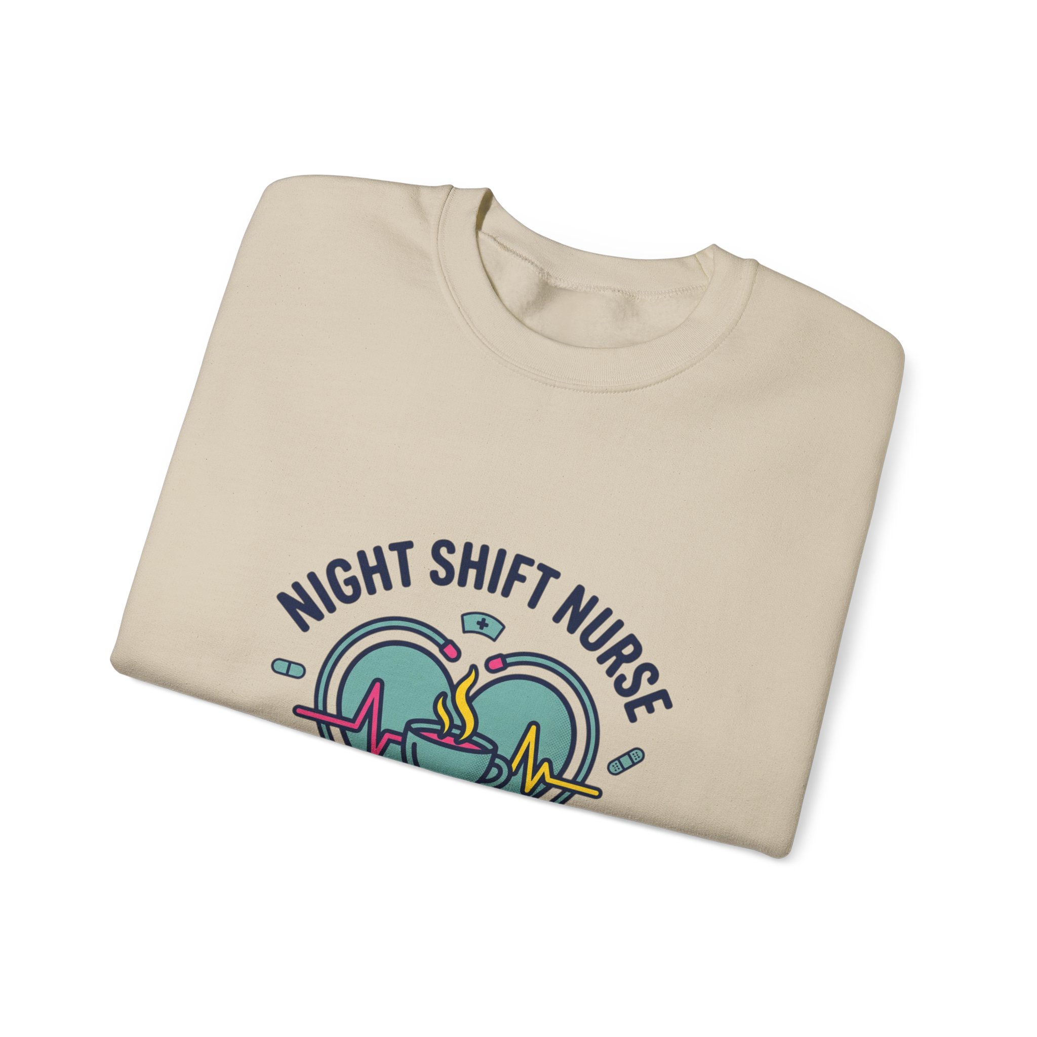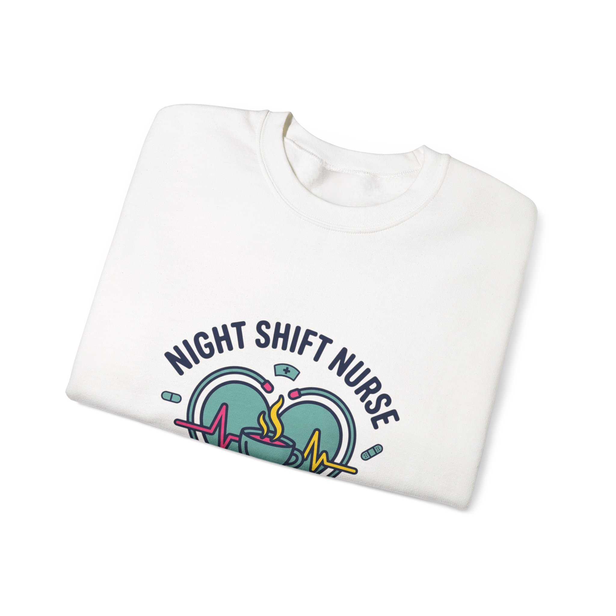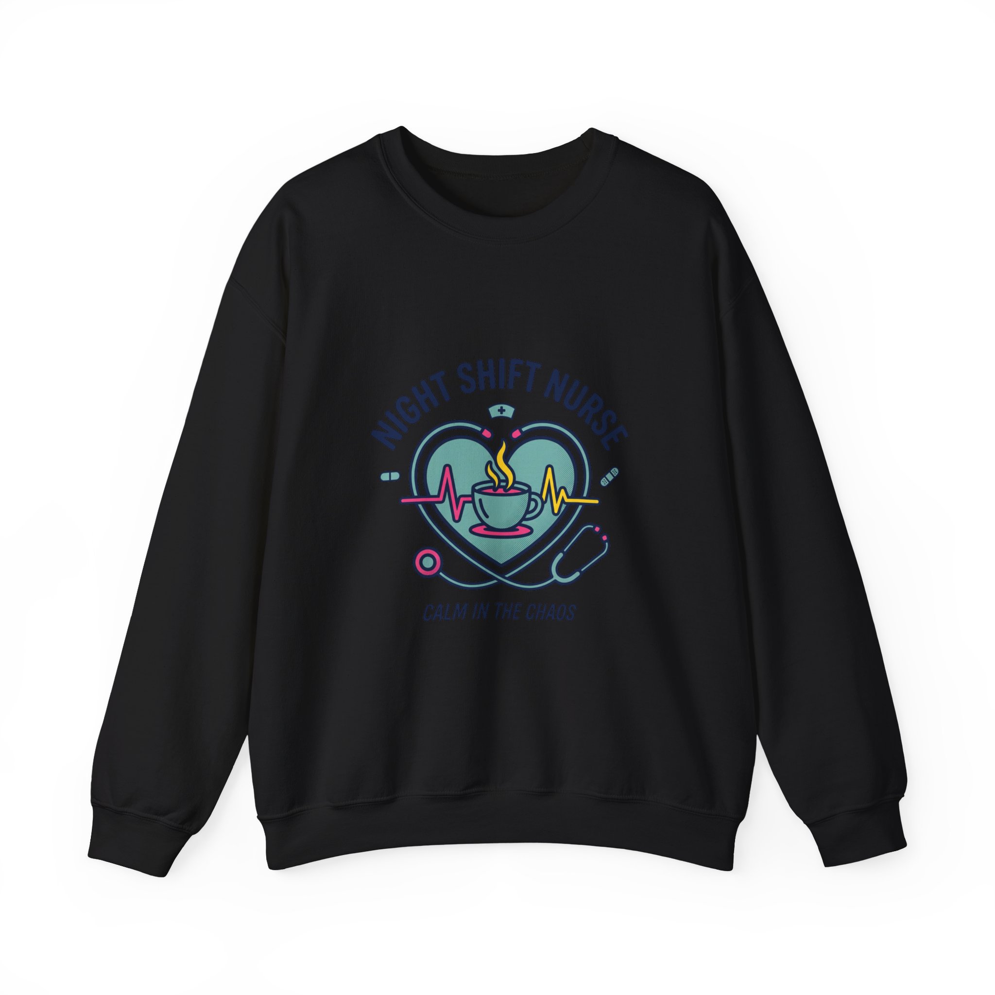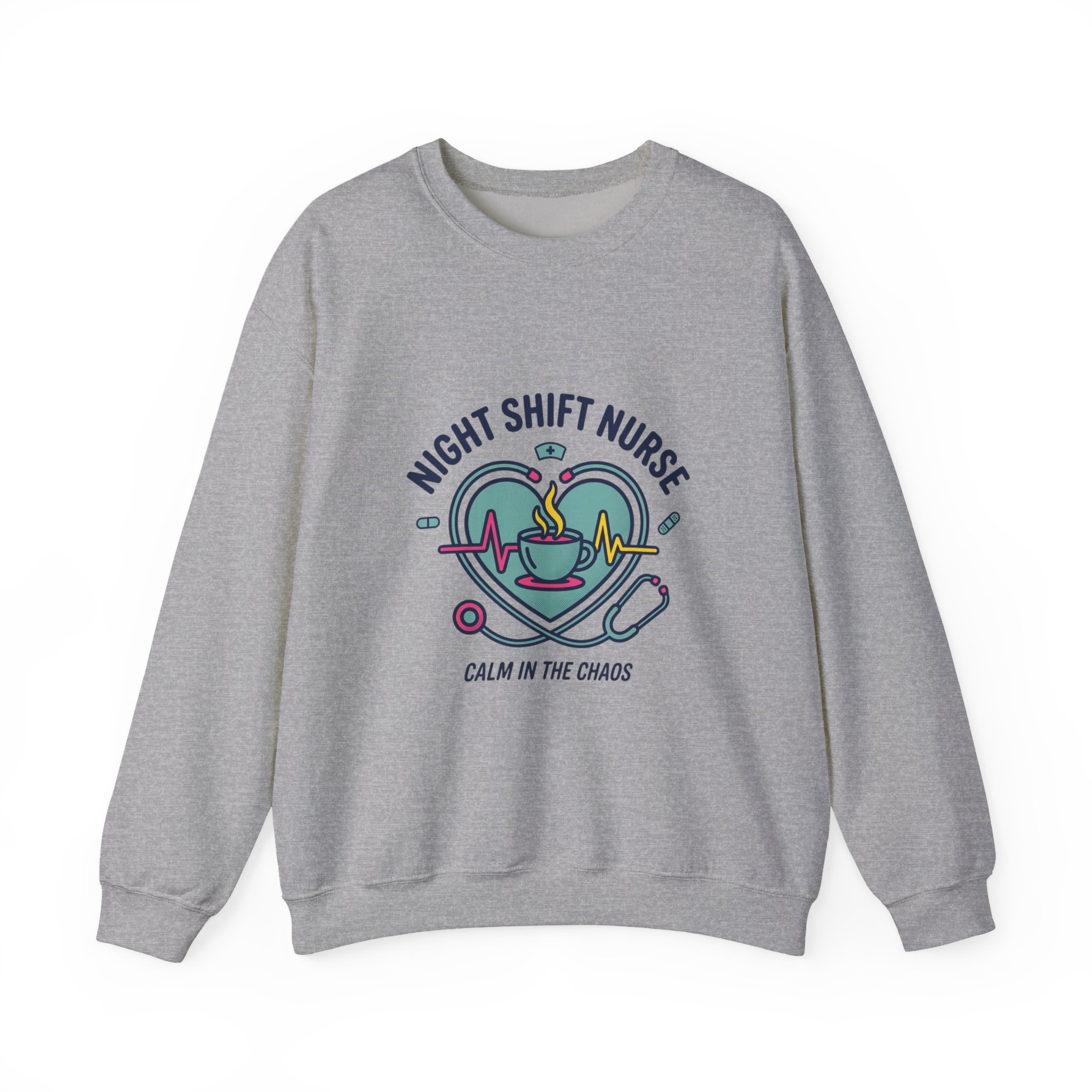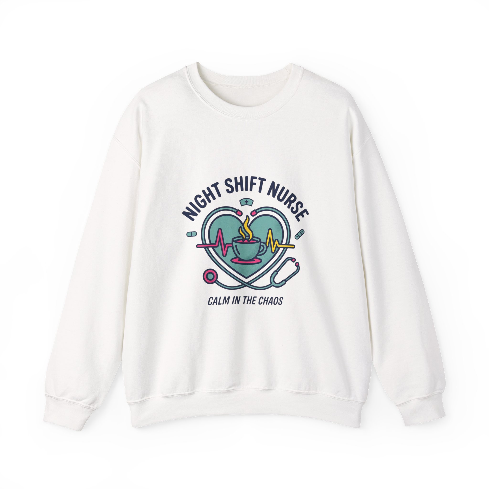 Night-shift nurse-themed crewneck blending calm and camaraderie with a soft, wearable look. The front artwork pairs a heart, stethoscope, ECG line and steaming coffee cup in muted teal and rose tones, framed by the phrase “Night Shift Nurse” and the tagline “Calm in the Chaos.” The design reads as warm, resilient nursing identity merch aimed at medical professionals who value quiet strength and approachable, minimalist healthcare motifs.