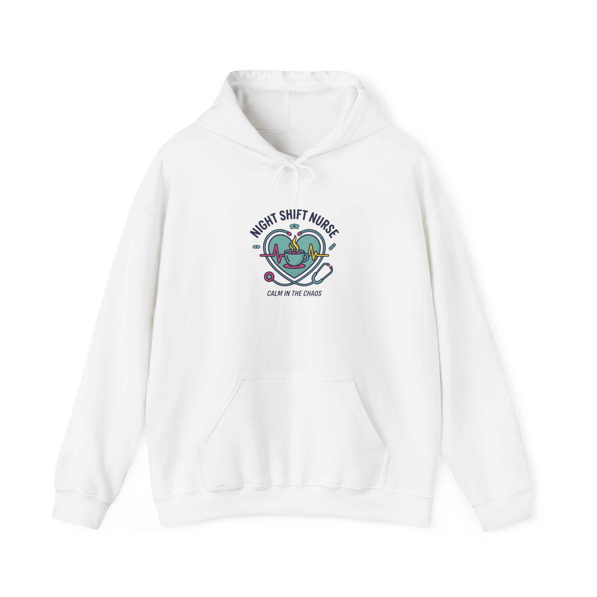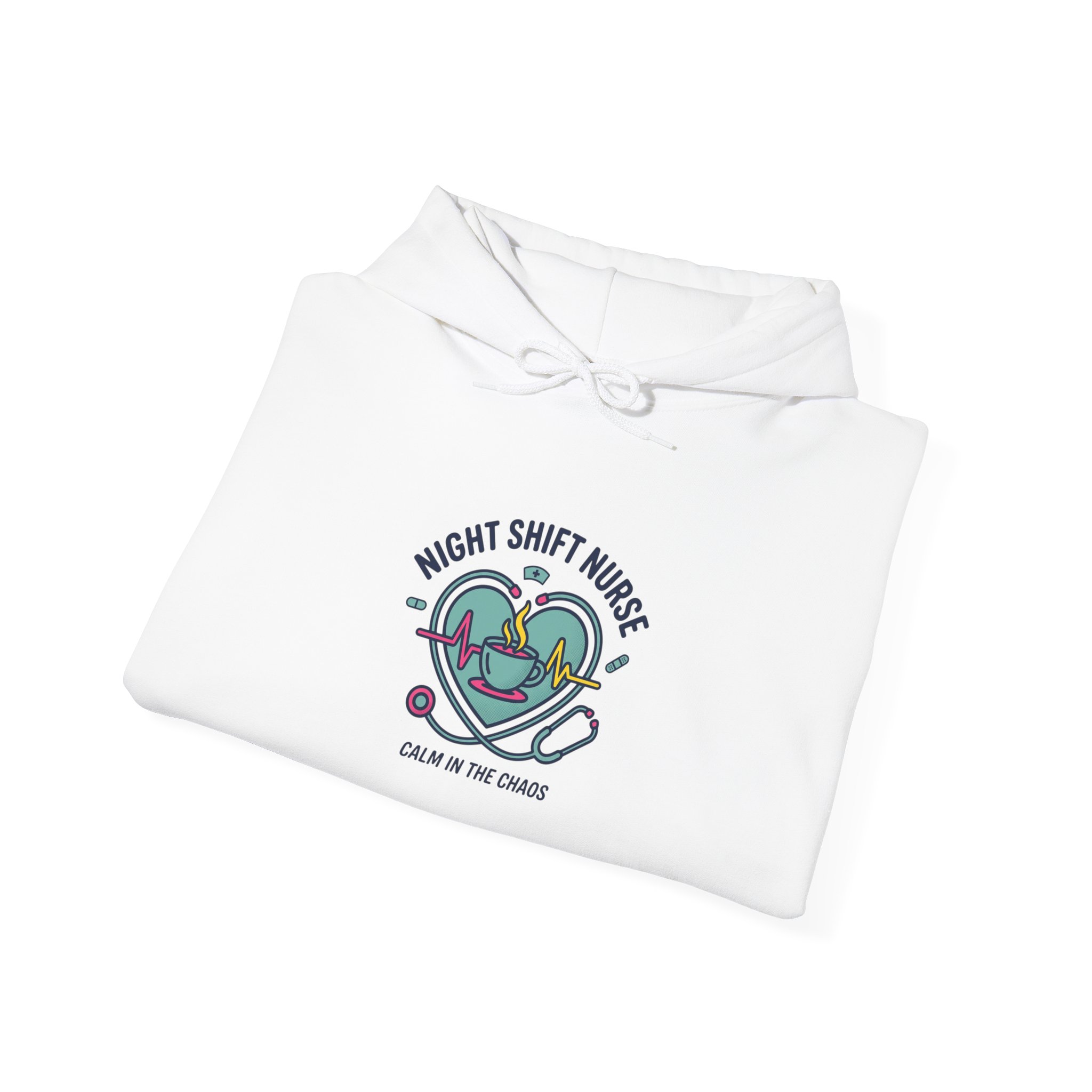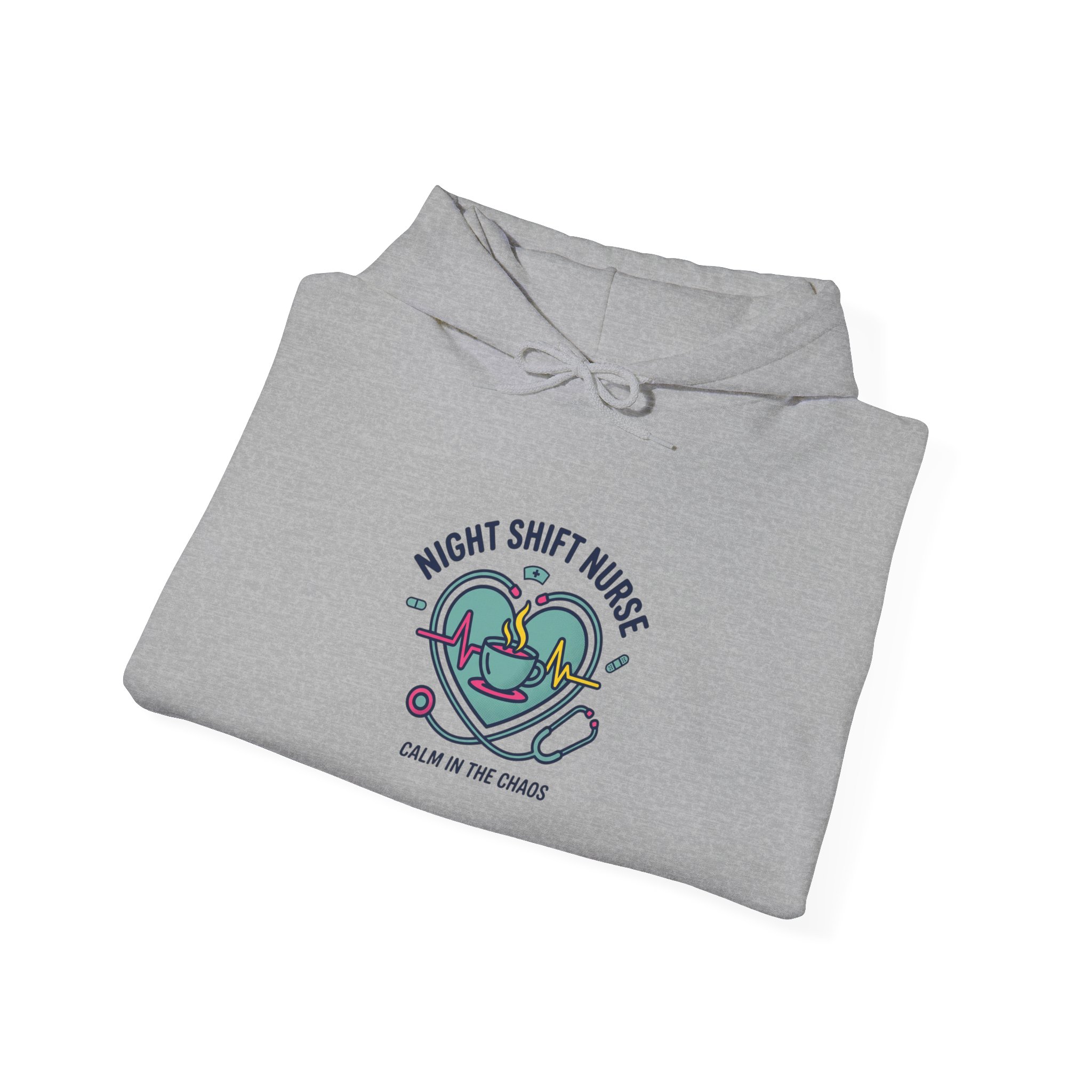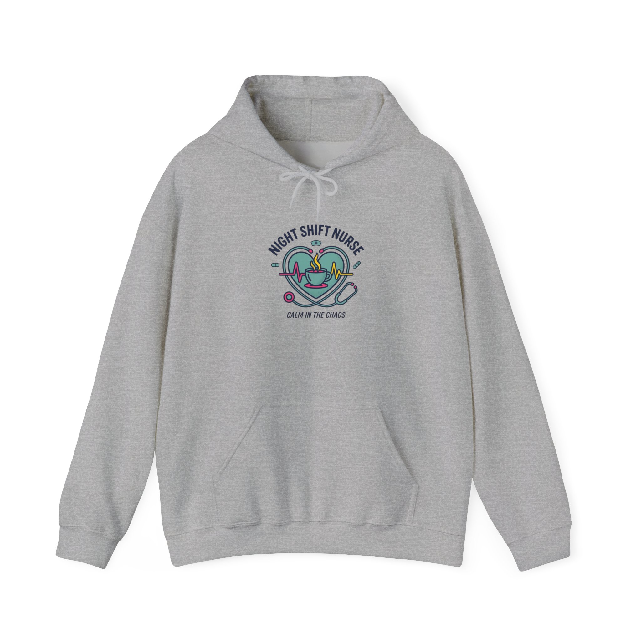Night-shift nurse emblem printed on a soft, mid-weight hooded sweatshirt that balances practical comfort with quiet team pride. The centered graphic pairs a calming teal-and-indigo palette, stethoscope motif, and approachable rounded typography to evoke competence and warmth—a subtle nod to nurse identity and late-night resilience. Works with minimalist, healthcare-focused wardrobes and suits on-shift downtime or casual weekends when you want a calm, professional look that references nursing without overt logos or specific institutions.
