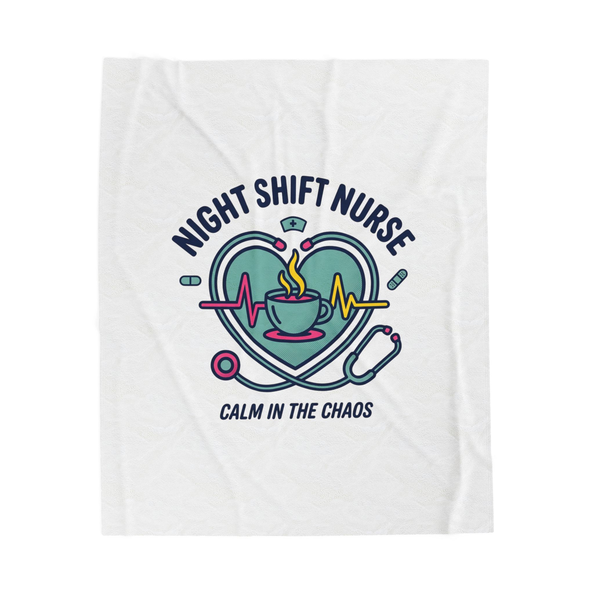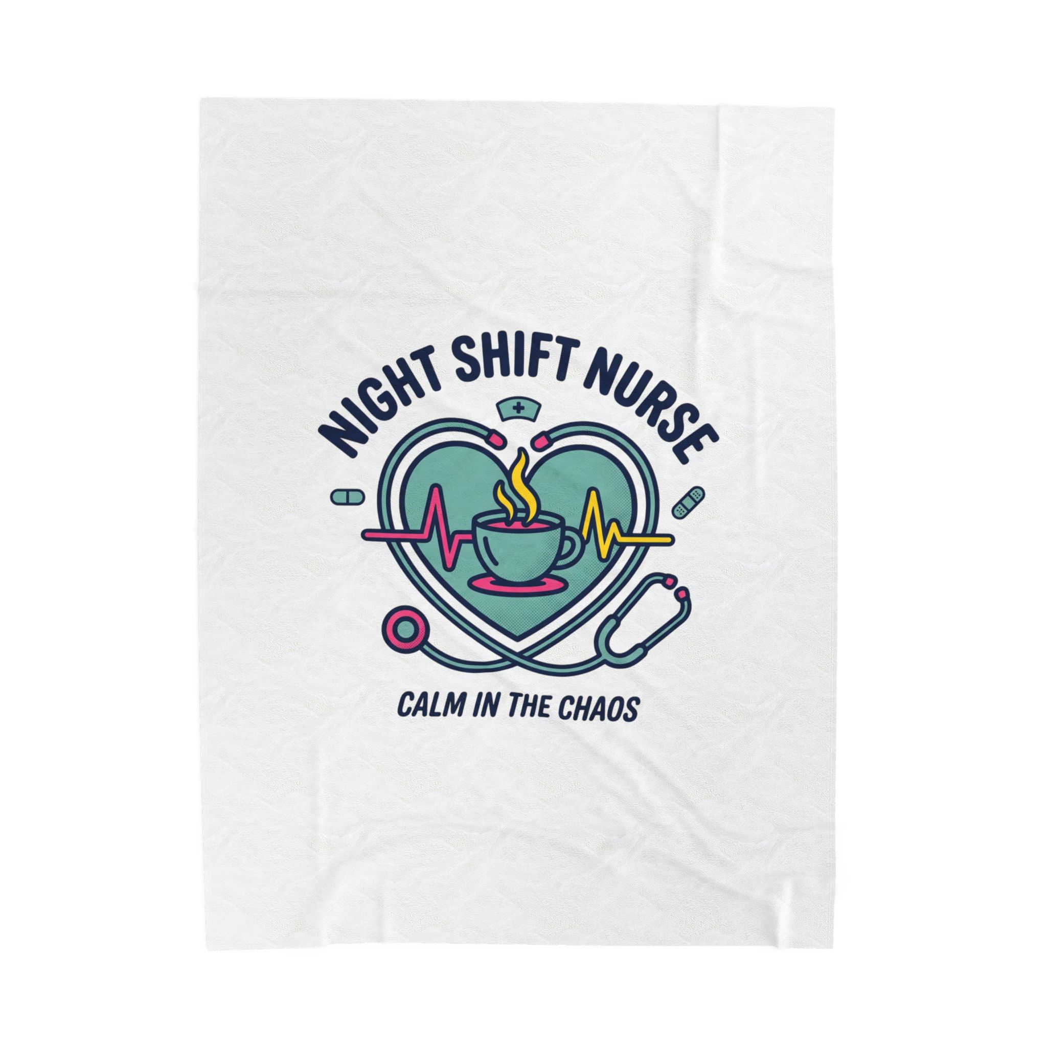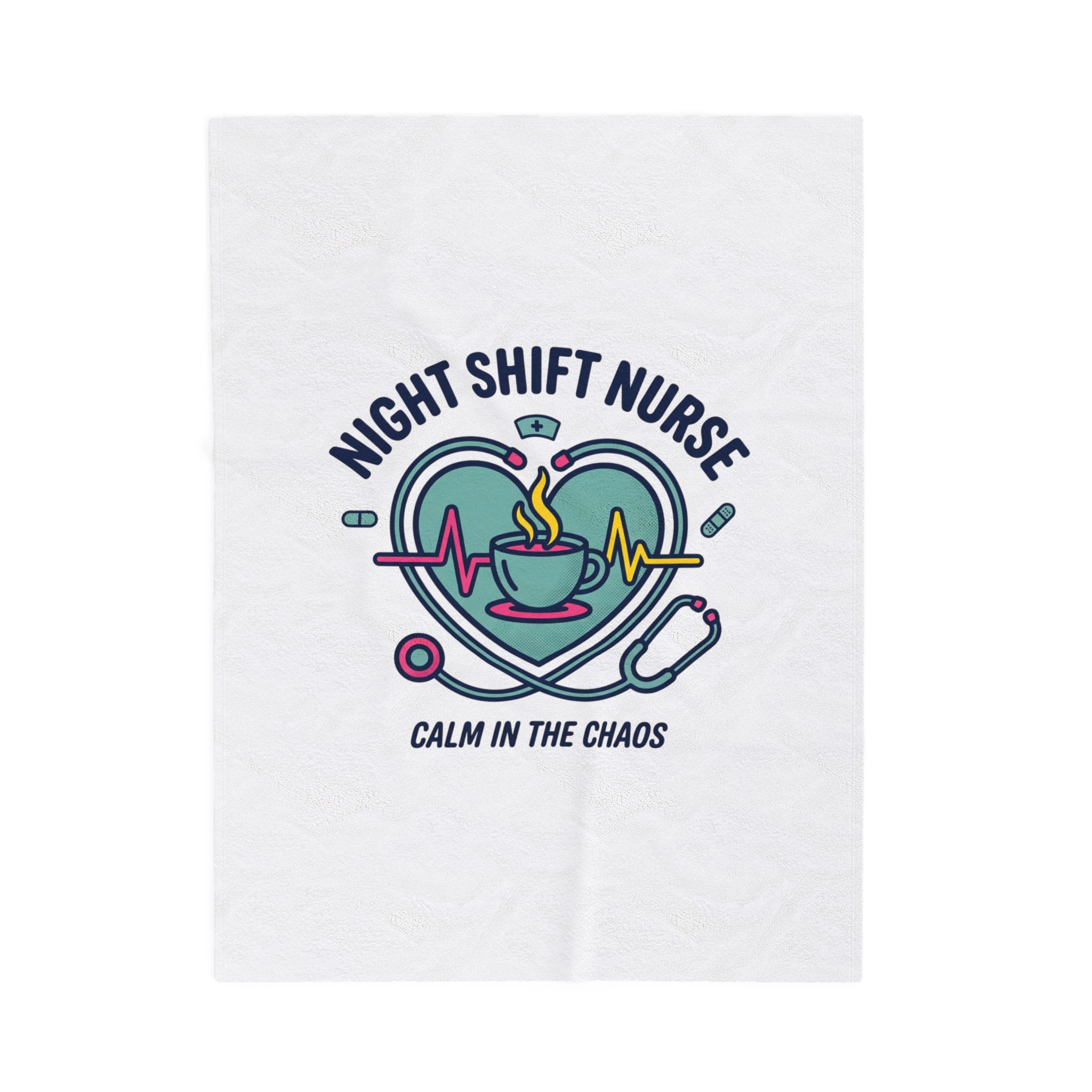 Night-shift nurse design combining a calming heartbeat motif, steaming coffee cup, stethoscope, and pill icons to celebrate the rhythm of late‑hour care. The palette and clean linework give a friendly, professional vibe that speaks to resilience and quiet focus—aligned with nurse aesthetic search terms like medical worker apparel, RN, and stethoscope minimalist. Lightweight yet plush, this blanket layers easily for quick naps between calls or to carry a bit of on‑shift comfort home.