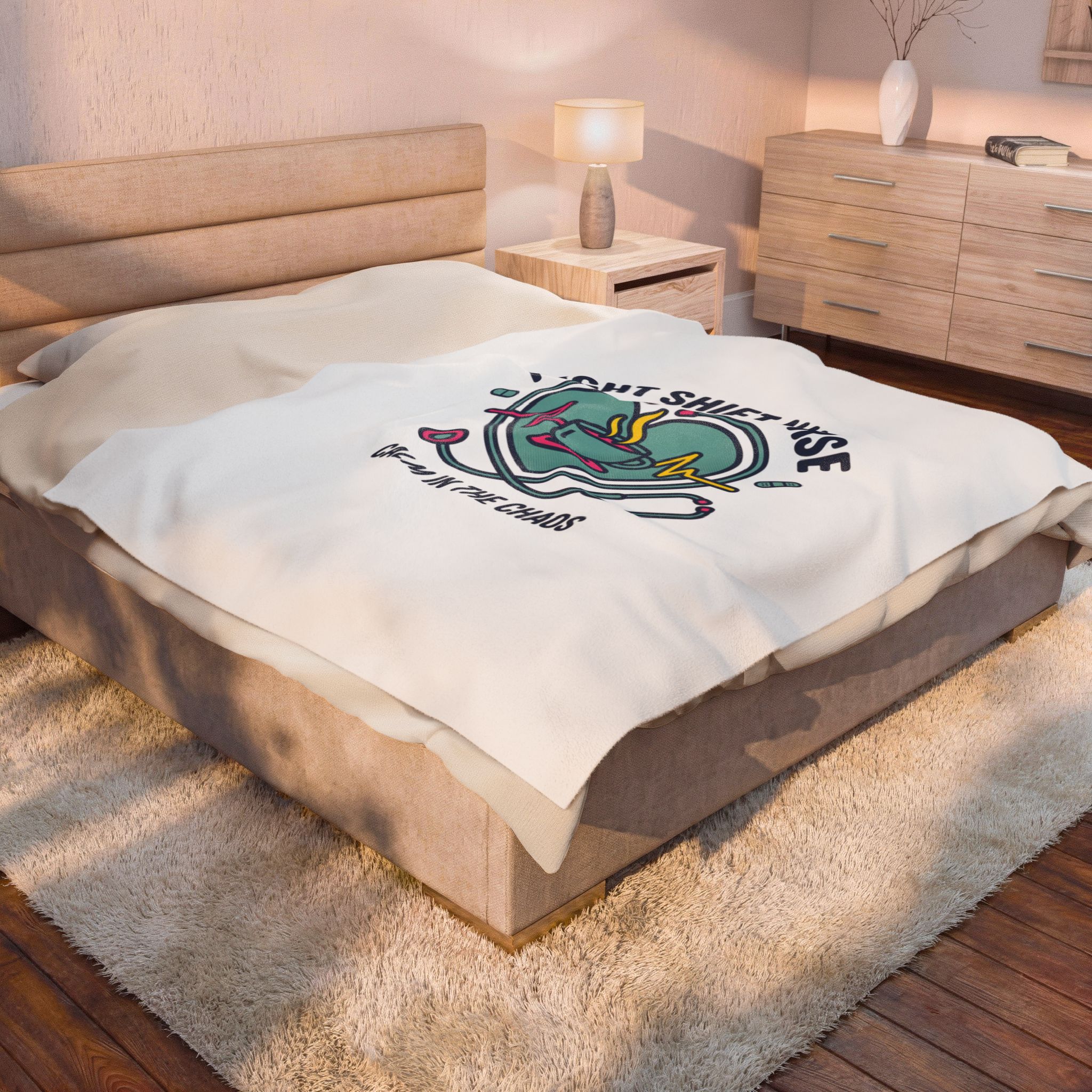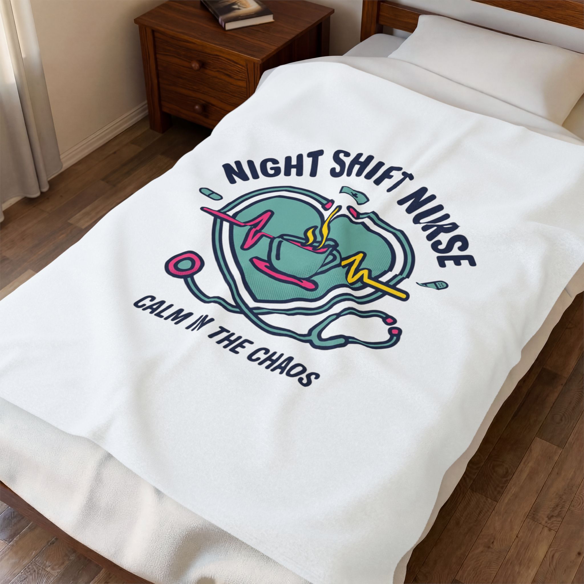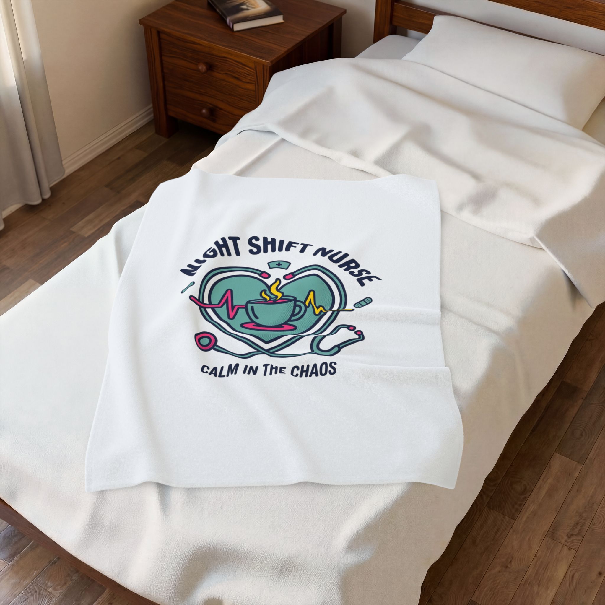 Night-shift nurse design combining a calming heartbeat motif, steaming coffee cup, stethoscope, and pill icons to celebrate the rhythm of late‑hour care. The palette and clean linework give a friendly, professional vibe that speaks to resilience and quiet focus—aligned with nurse aesthetic search terms like medical worker apparel, RN, and stethoscope minimalist. Lightweight yet plush, this blanket layers easily for quick naps between calls or to carry a bit of on‑shift comfort home.